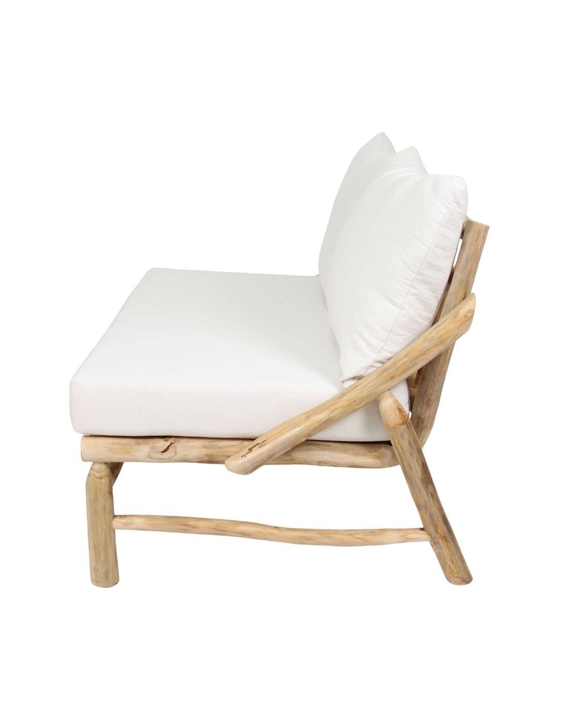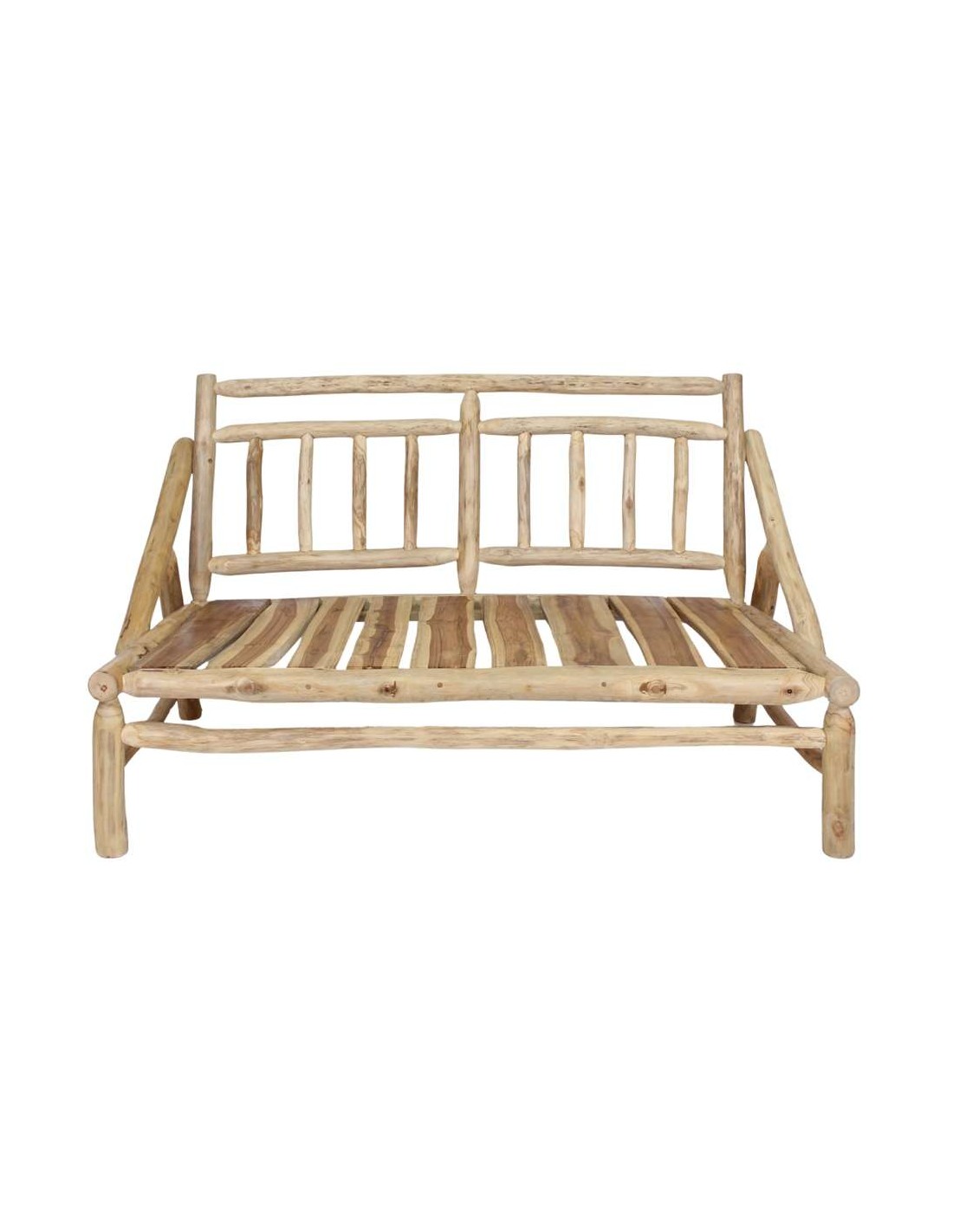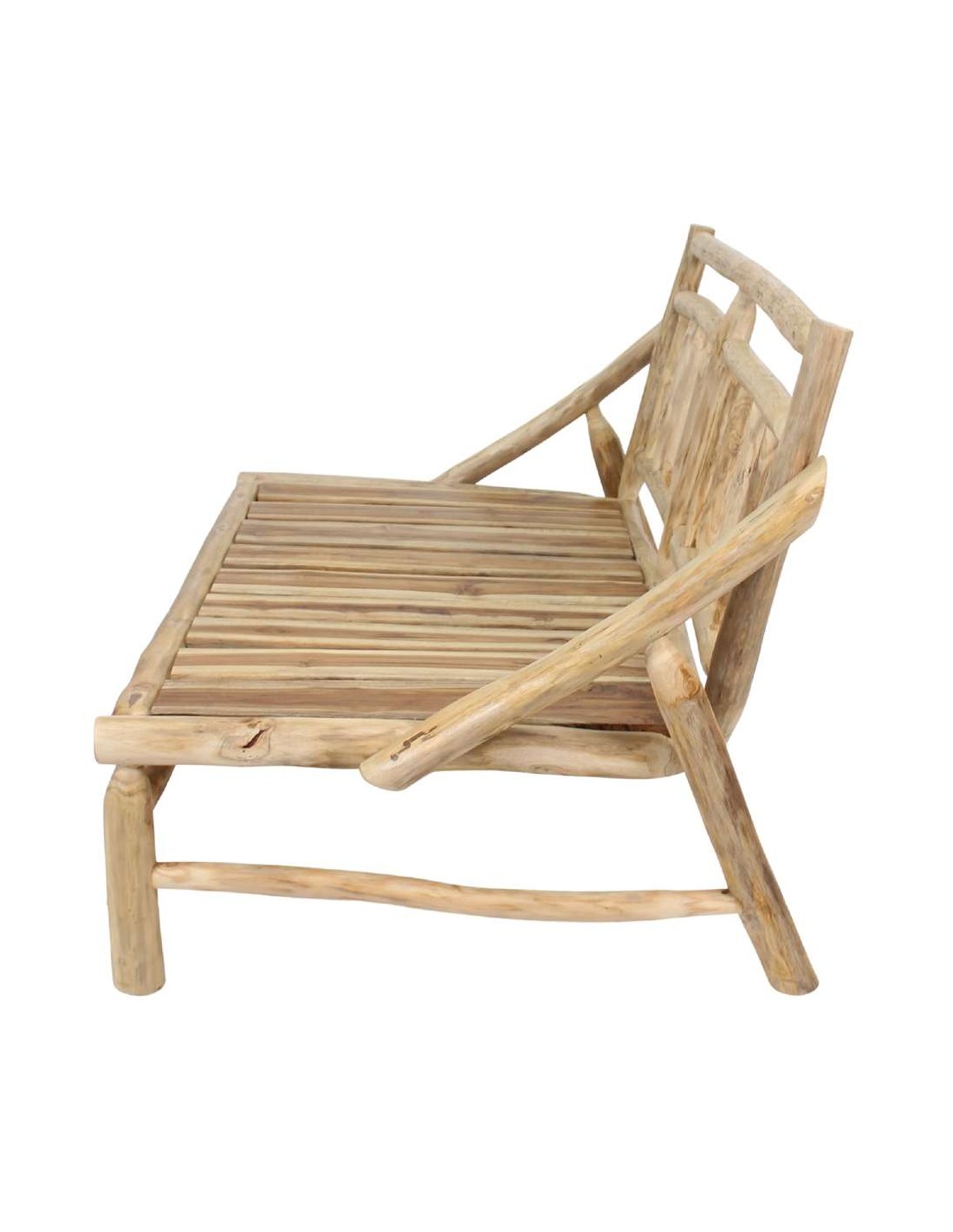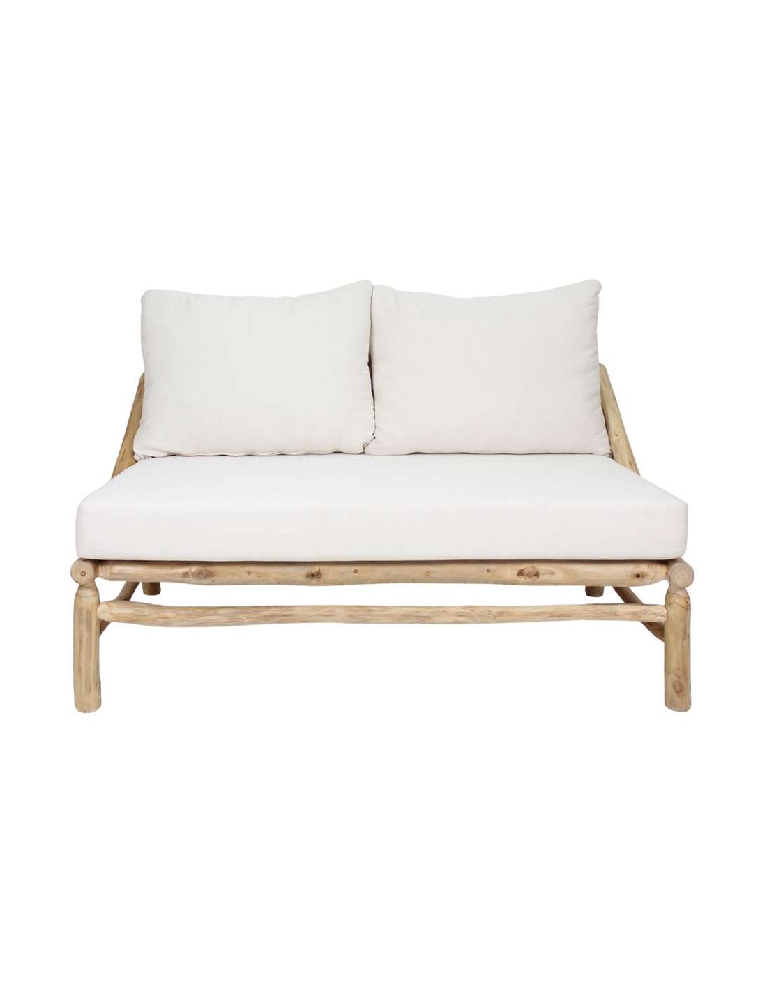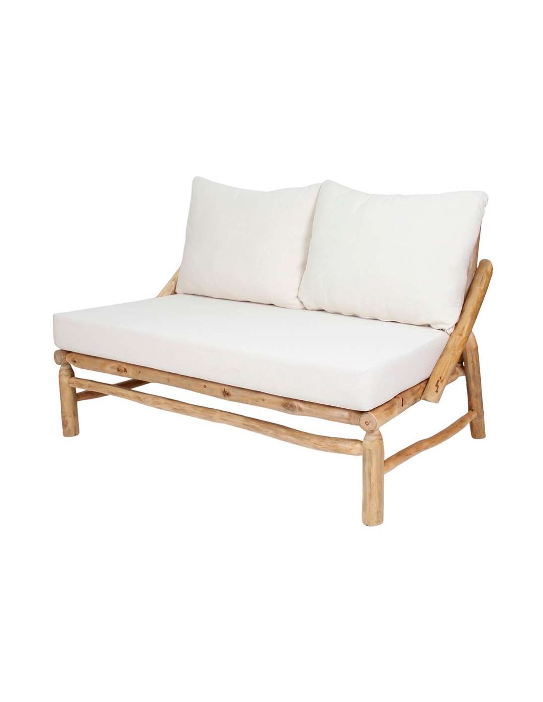 Banco estilo rústico elaborado con troncos de madera maciza tropical acabado natural y cojines incluidos tapizados en textil para un mayor confort. Ideal para dos plazas.
