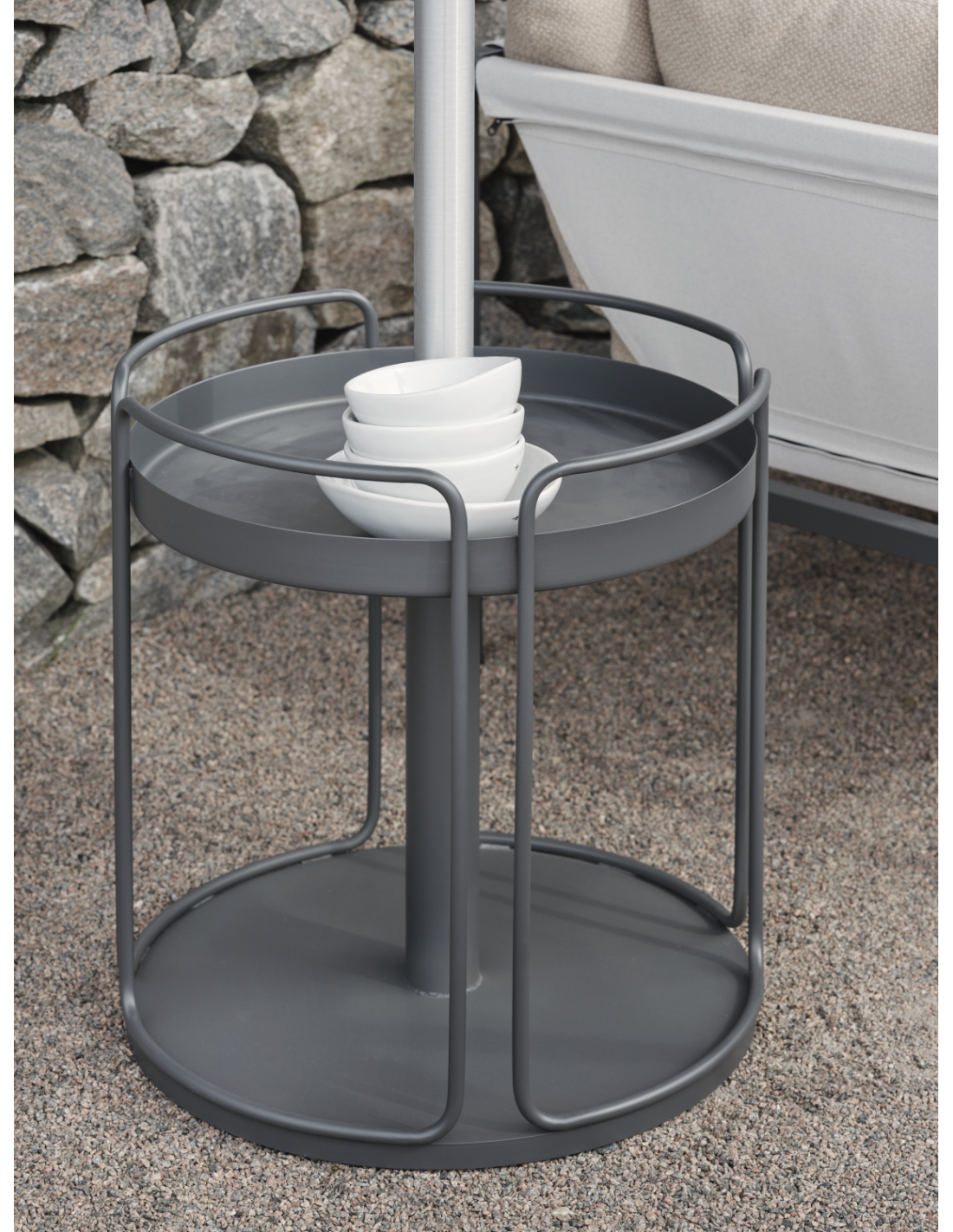La mesa auxiliar Shady no es una mesa auxiliar cualquiera. Además de ser pesada y robusta, con dos niveles de tableros, también puede usarse como base de sombrilla cuando lo necesites. Su diseño bien pensado tiene en cuenta que, cuando estamos al aire libre, siempre tenemos cosas que apoyar, y muchas veces conviene que estén a la sombra. Así que, ¿por qué no colocar Shady junto a tu sofá o sillón para que cumpla esa función a la perfección? Ajustable para dos diámetros de mástil de sombrilla: 38 y 48 mm. Fabricada en acero.Clica aquí para ir a la sección de productos Brafab de Vackart.