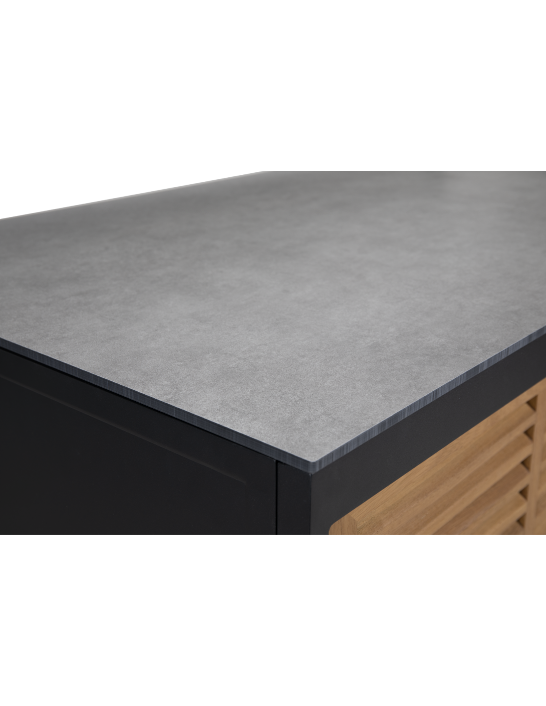 Cocina exterior premium en aluminio negro con puertas de madera de teca y encimera de laminado de alta presión. Diseñada para un estilo de vida moderno, incorpora múltiples funciones inteligentes. FORNAX está compuesta por cinco módulos diferentes que pueden combinarse para crear una cocina exterior completa y de gran tamaño. Uno de los módulos está preparado para añadir una barbacoa (NOTA: barbacoa no incluida), otro incluye fregadero y grifo, y otro cuenta con una encimera lisa, perfecta como superficie de trabajo.Todos los módulos disponen de ruedas resistentes, parte trasera tipo panel y estante. Como accesorio, también existe un módulo adicional (grande y pequeño) que puede montarse como barra. El módulo preparado para incorporar una barbacoa de gas, que se adquiere por separado, tiene dimensiones compatibles con modelos como la Napoleon BILEX485-1. Las imágenes con la barbacoa instalada son solo ilustrativas.