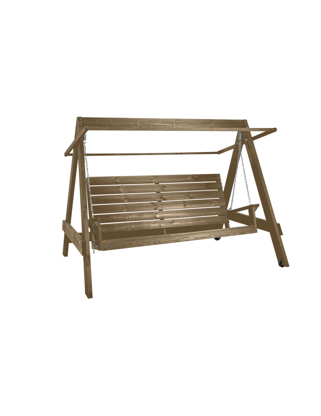 Hamaca clásica en madera de pino impregnado color marrón, con ruedas para facilitar su desplazamiento. Cojines y toldo se venden por separado.Clica aquí para ir a la sección de productos Brafab de Vackart.