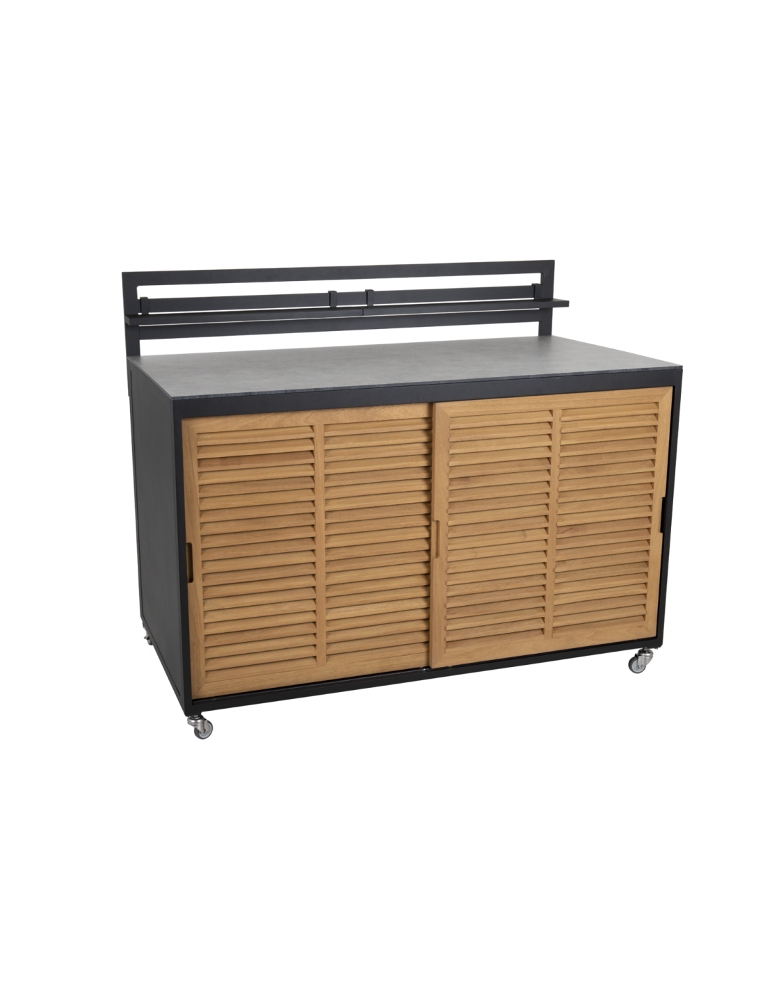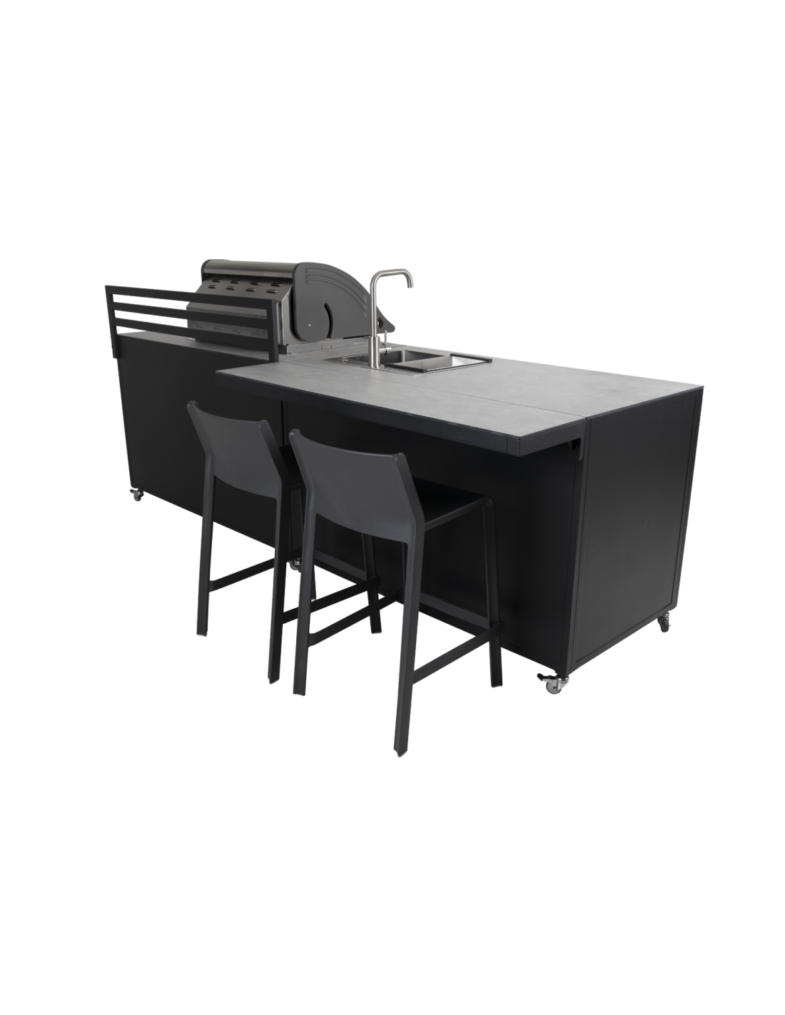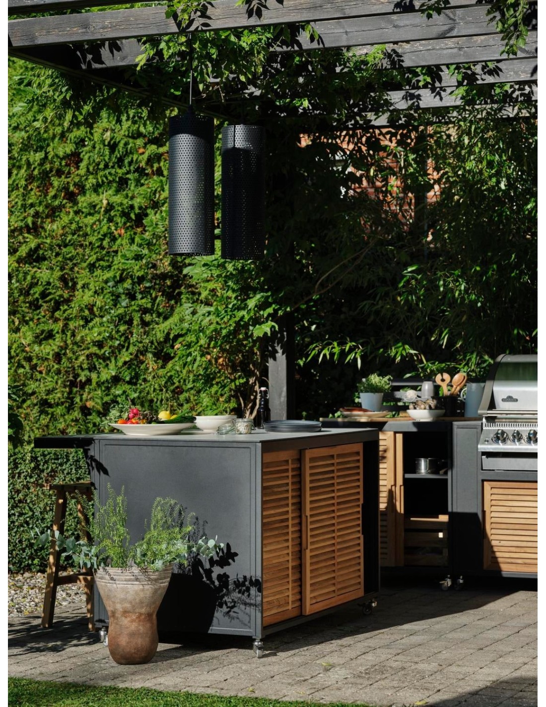 Cocina exterior premium en aluminio negro con puertas de madera de teca y encimera de laminado de alta presión. Diseñada para un estilo de vida moderno, incorpora múltiples funciones inteligentes. FORNAX está compuesta por cinco módulos diferentes que pueden combinarse para crear una cocina exterior completa y de gran tamaño. Uno de los módulos está preparado para añadir una barbacoa (NOTA: barbacoa no incluida), otro incluye fregadero y grifo, y otro cuenta con una encimera lisa, perfecta como superficie de trabajo.