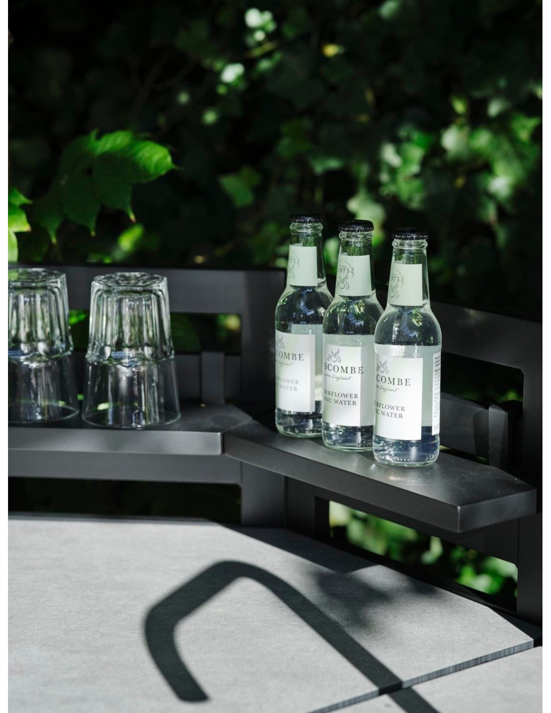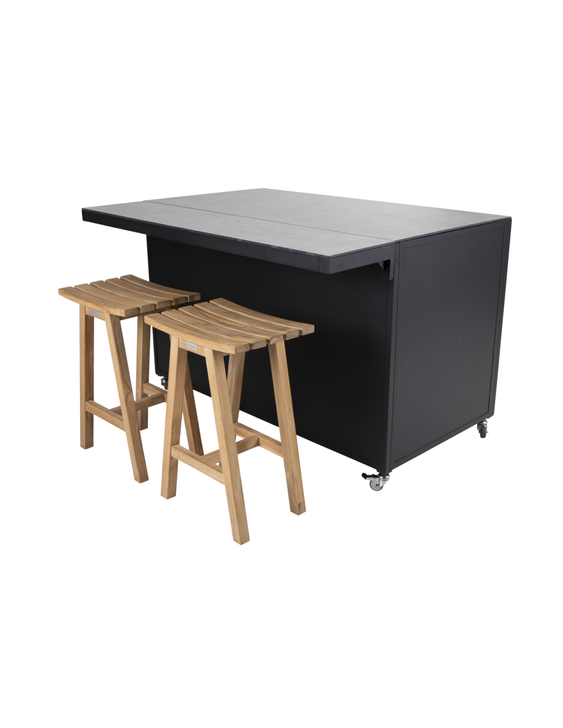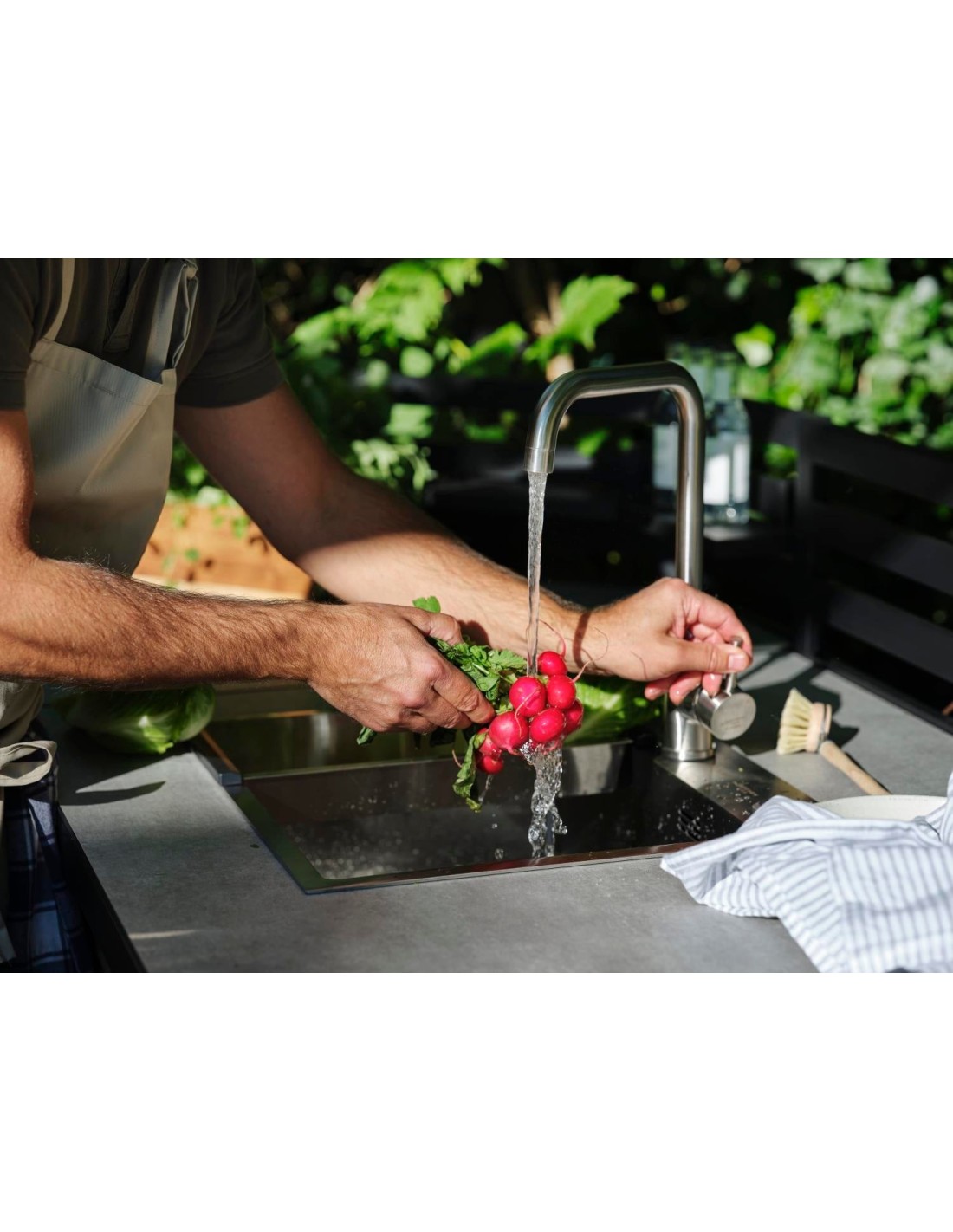 Cocina exterior premium en aluminio negro con puertas de madera de teca y encimera de laminado de alta presión. Diseñada para un estilo de vida moderno, incorpora múltiples funciones inteligentes. FORNAX está compuesta por cinco módulos diferentes que pueden combinarse para crear una cocina exterior completa y de gran tamaño. Uno de los módulos está preparado para añadir una barbacoa (NOTA: barbacoa no incluida), otro incluye fregadero y grifo, y otro cuenta con una encimera lisa, perfecta como superficie de trabajo.