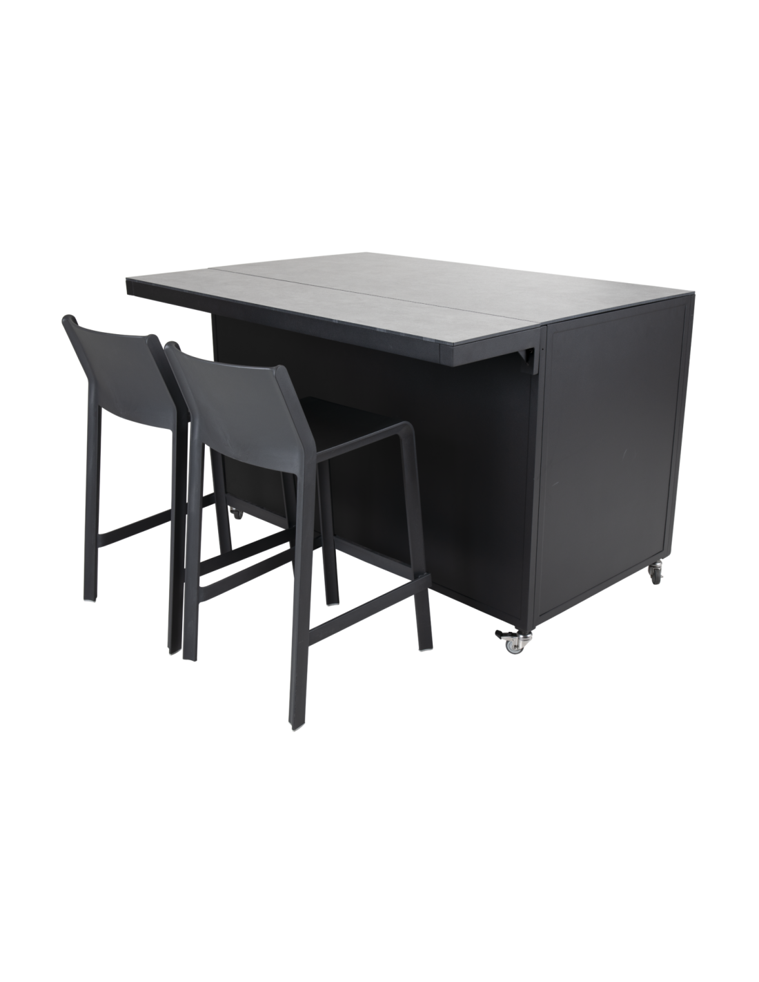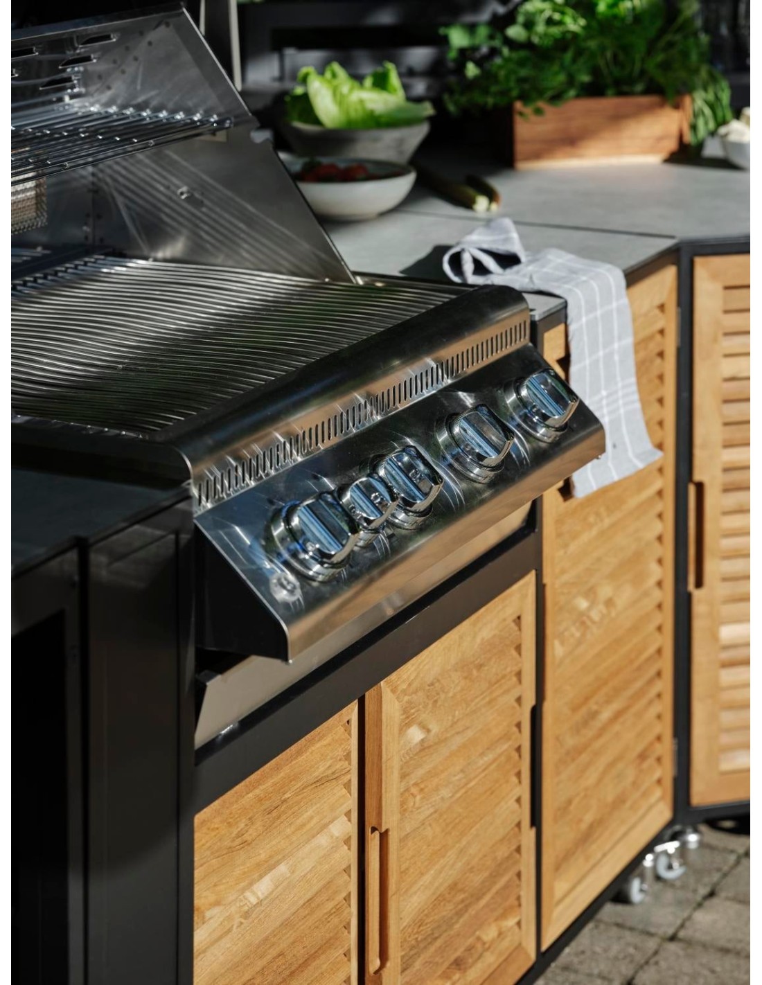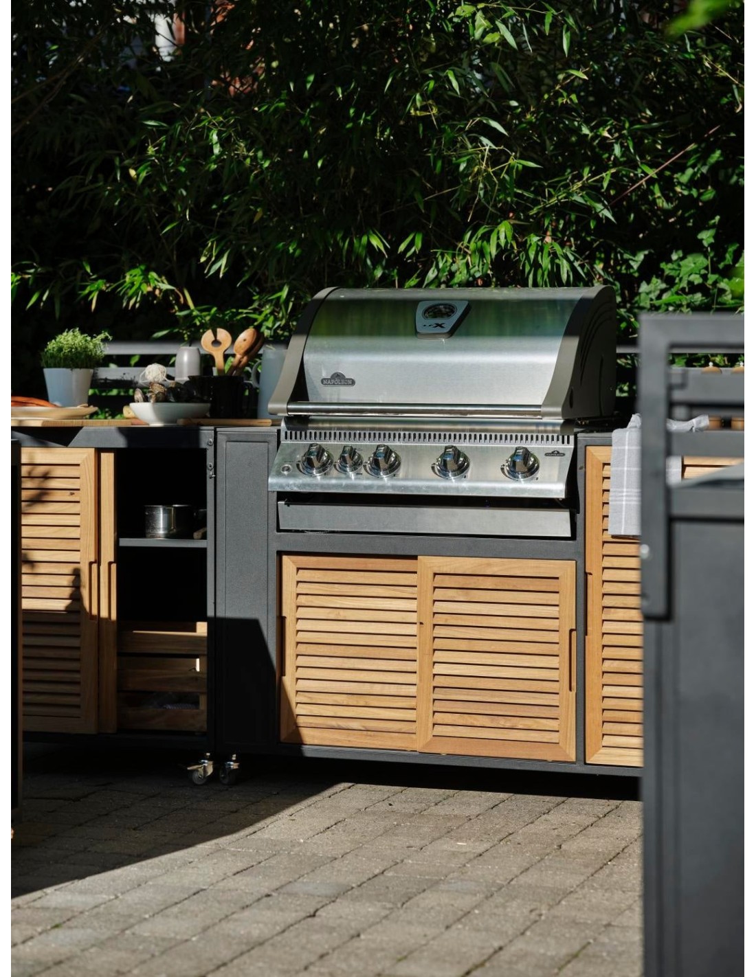 Todos los módulos disponen de ruedas resistentes, parte trasera tipo panel y estante. Como accesorio, también existe un módulo adicional (grande y pequeño) que puede montarse como barra. El módulo preparado para incorporar una barbacoa de gas, que se adquiere por separado, tiene dimensiones compatibles con modelos como la Napoleon BILEX485-1. Las imágenes con la barbacoa instalada son solo ilustrativas.
