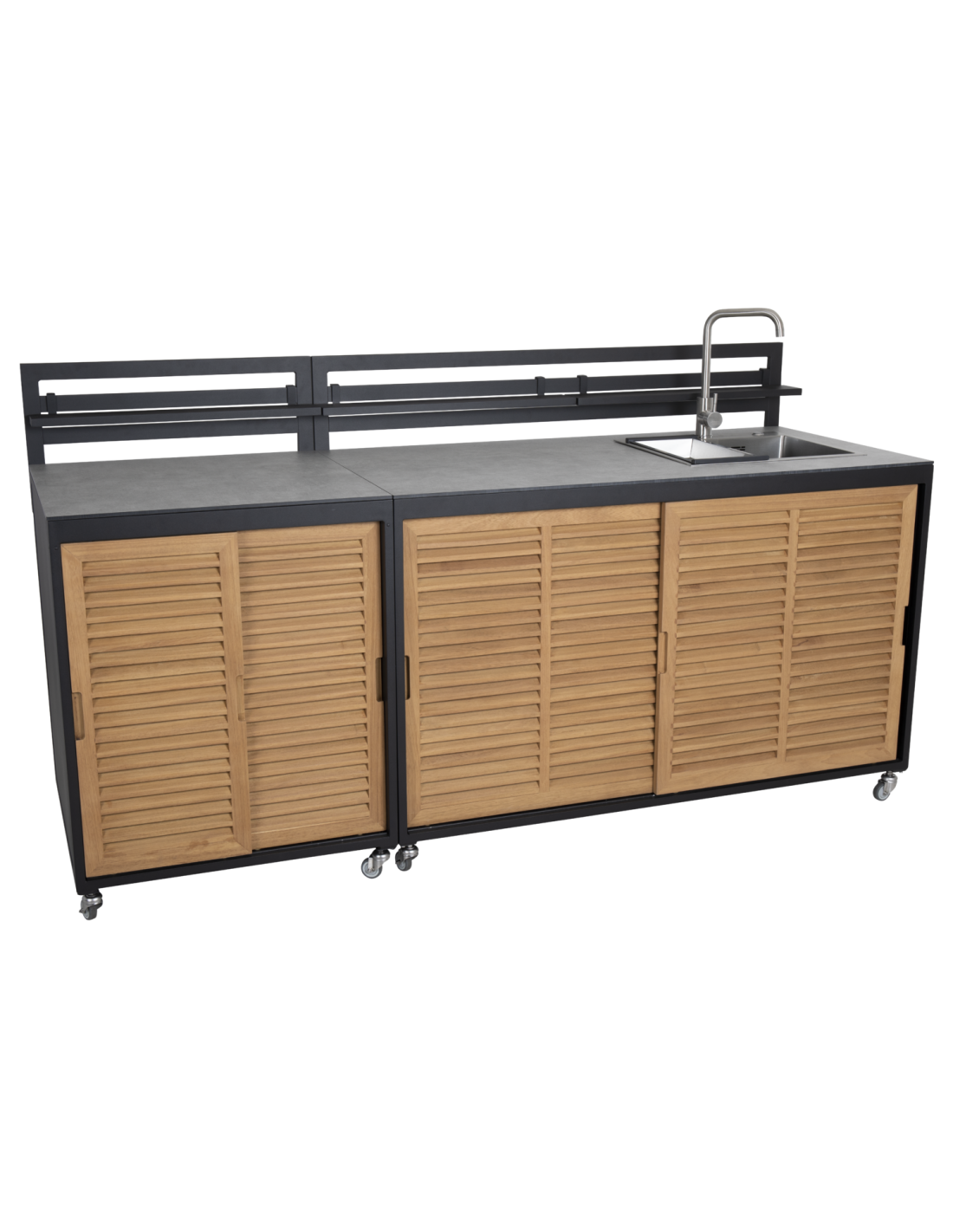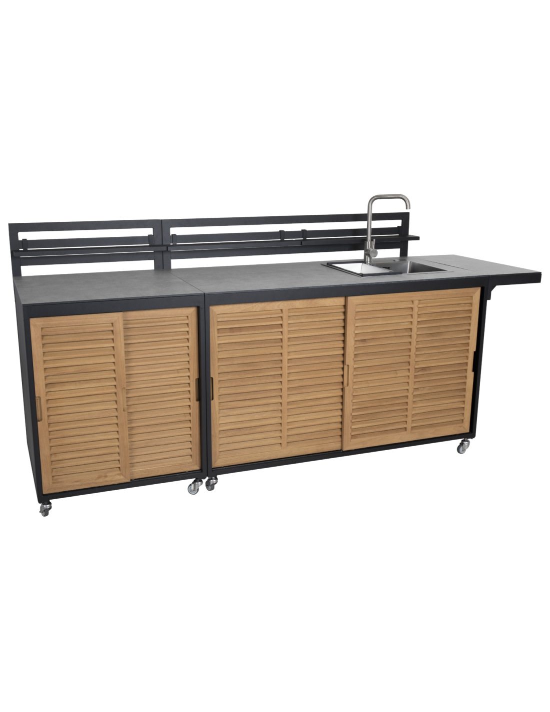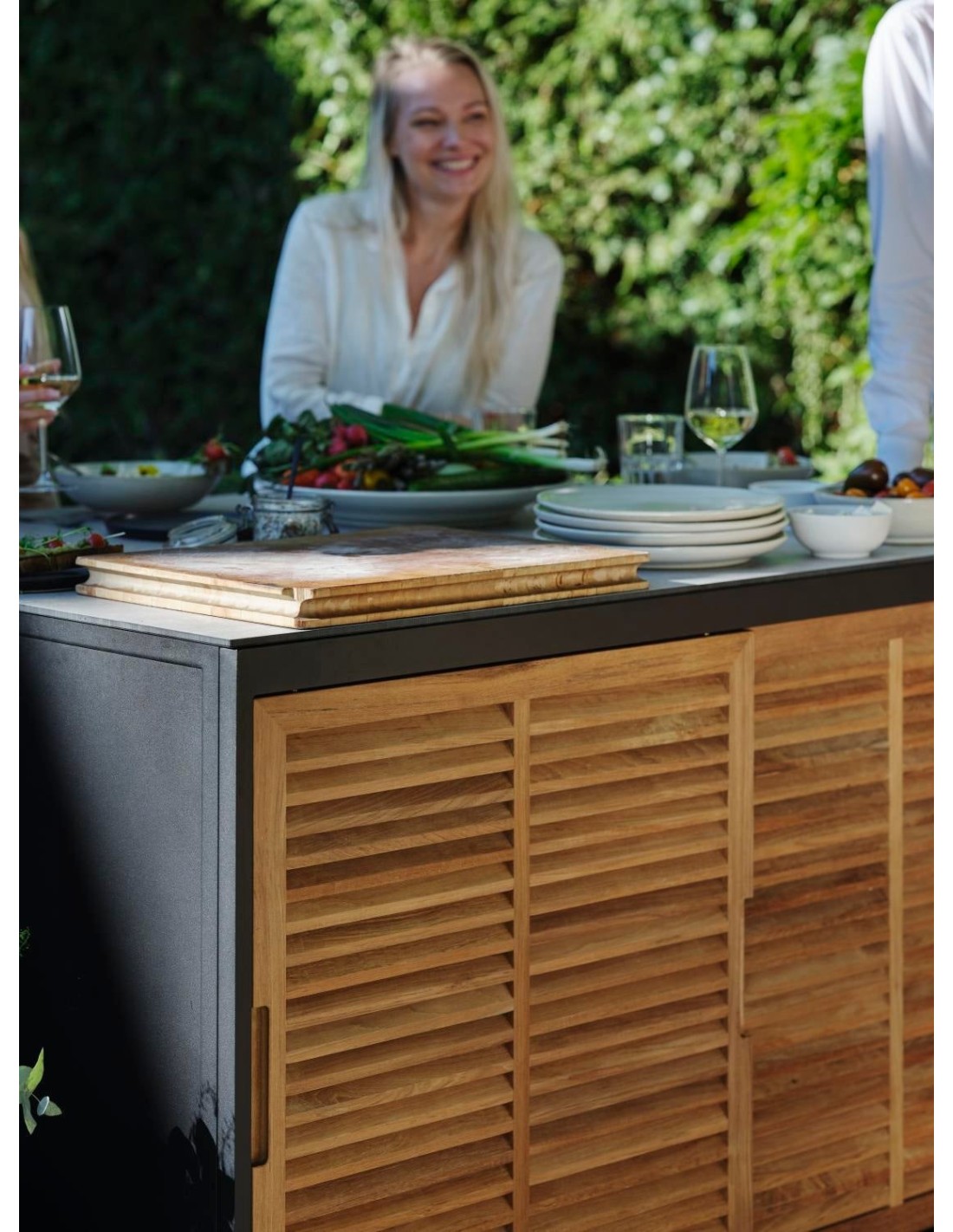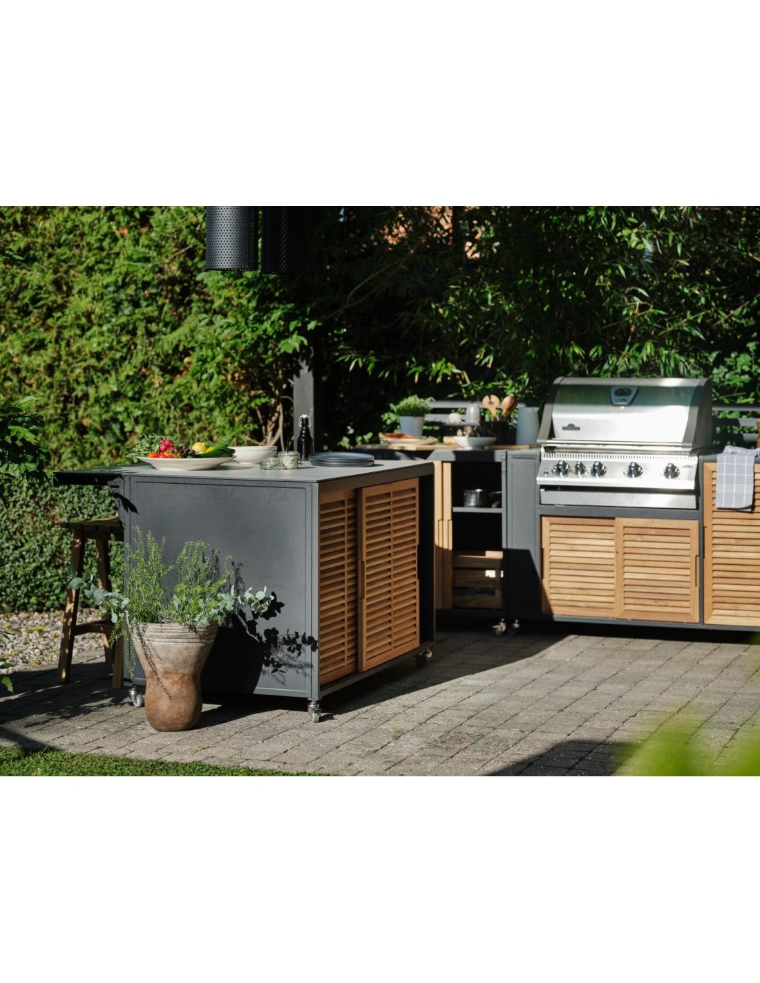 Cocina exterior premium en aluminio negro con puertas de madera de teca y encimera de laminado de alta presión. Diseñada para un estilo de vida moderno, incorpora múltiples funciones inteligentes. FORNAX está compuesta por cinco módulos diferentes que pueden combinarse para crear una cocina exterior completa y de gran tamaño. Uno de los módulos está preparado para añadir una barbacoa (NOTA: barbacoa no incluida), otro incluye fregadero y grifo, y otro cuenta con una encimera lisa, perfecta como superficie de trabajo.