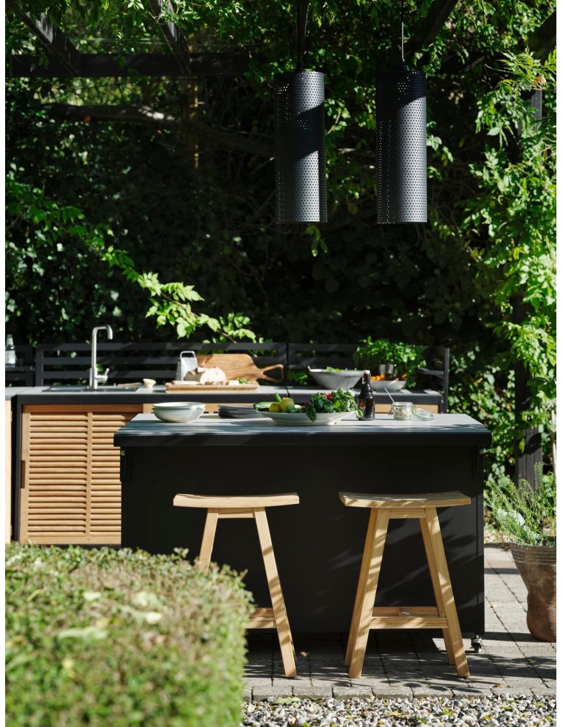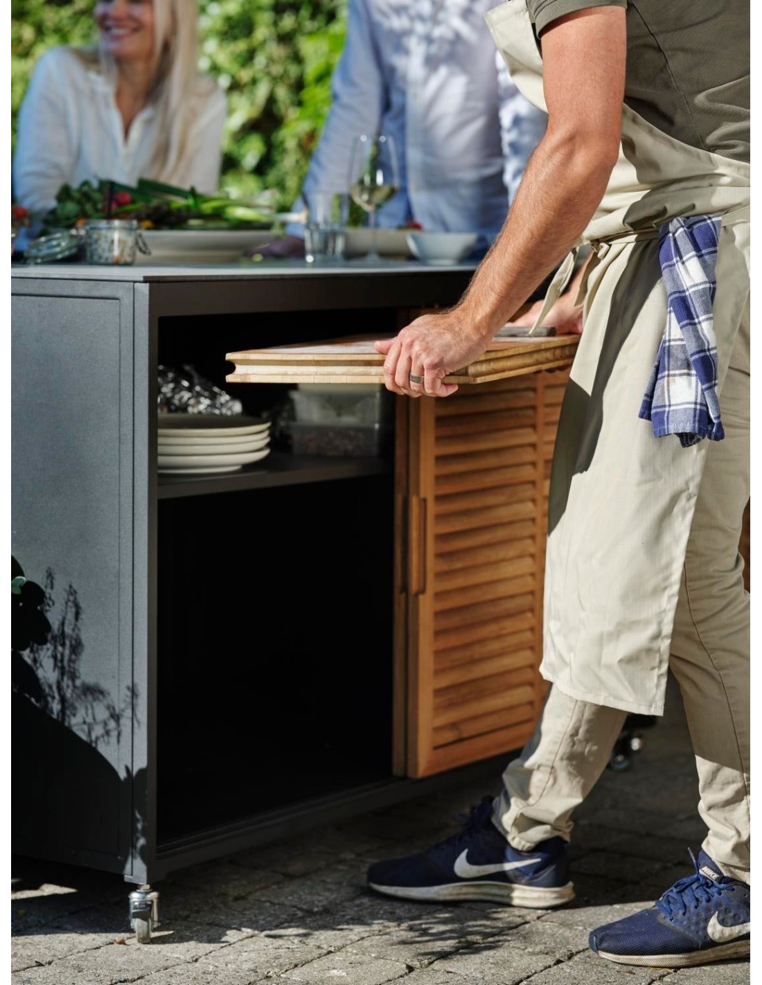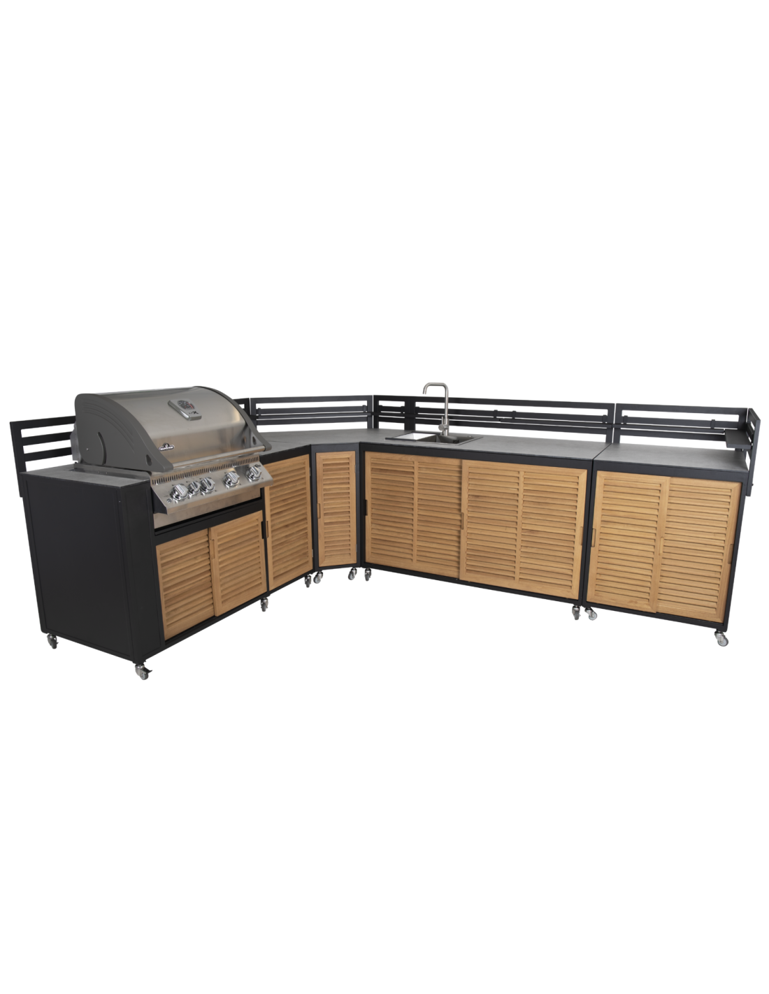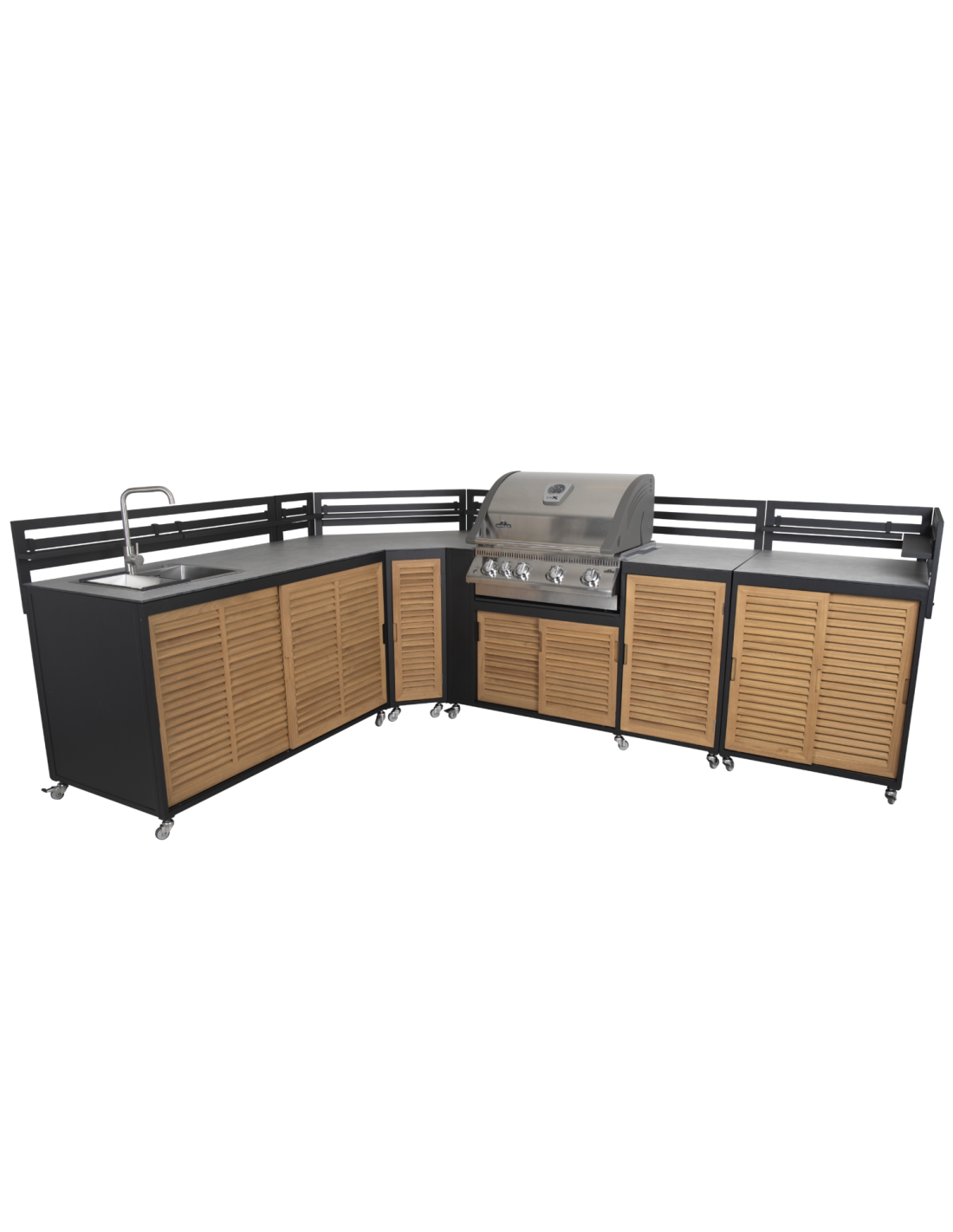 Cocina exterior premium en aluminio negro con puertas de madera de teca y encimera de laminado de alta presión. Diseñada para un estilo de vida moderno, incorpora múltiples funciones inteligentes. FORNAX está compuesta por cinco módulos diferentes que pueden combinarse para crear una cocina exterior completa y de gran tamaño. Uno de los módulos está preparado para añadir una barbacoa (NOTA: barbacoa no incluida), otro incluye fregadero y grifo, y otro cuenta con una encimera lisa, perfecta como superficie de trabajo.