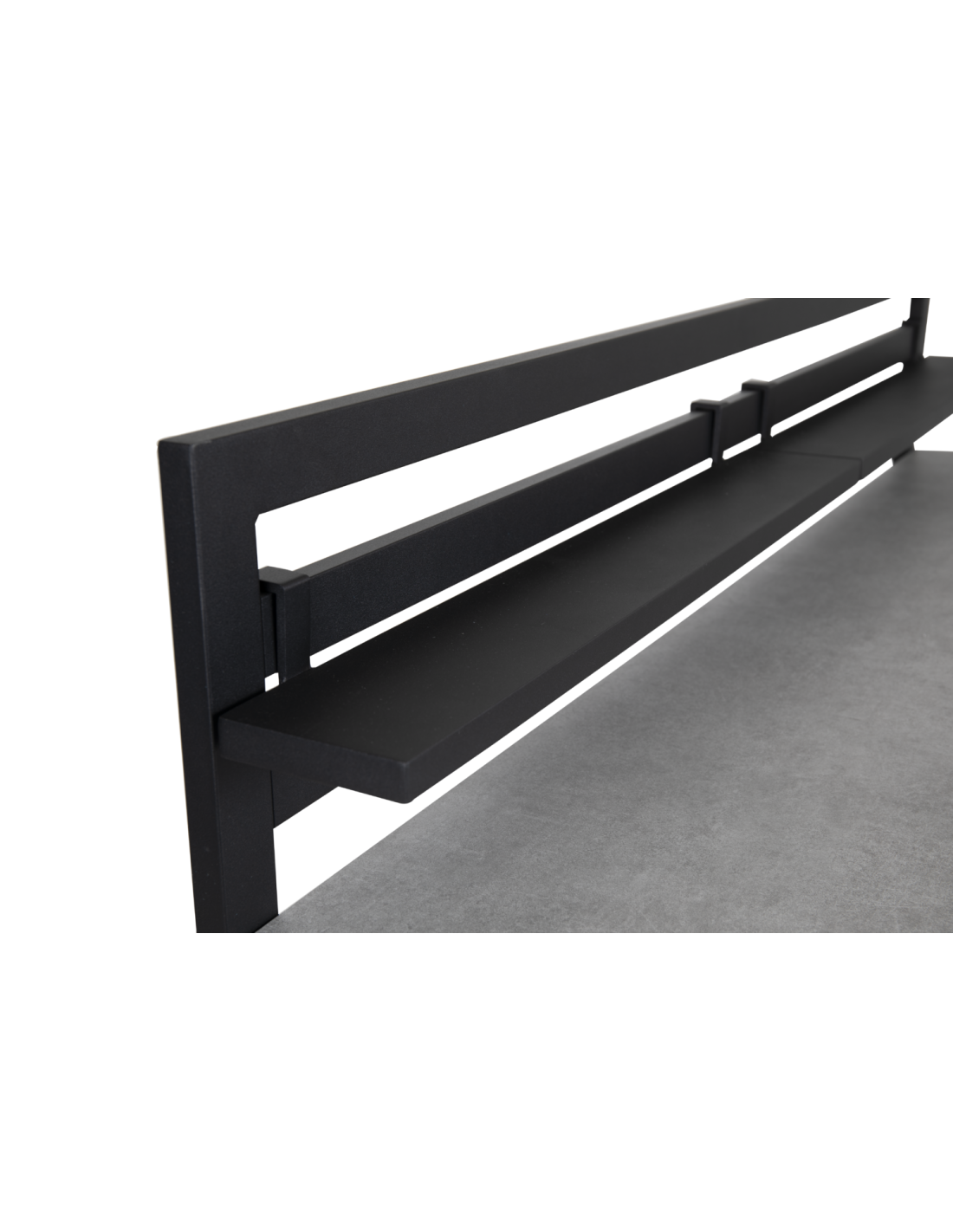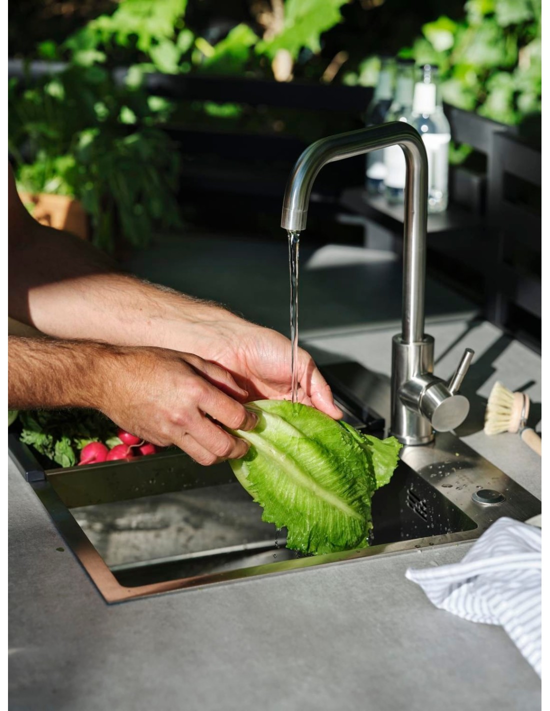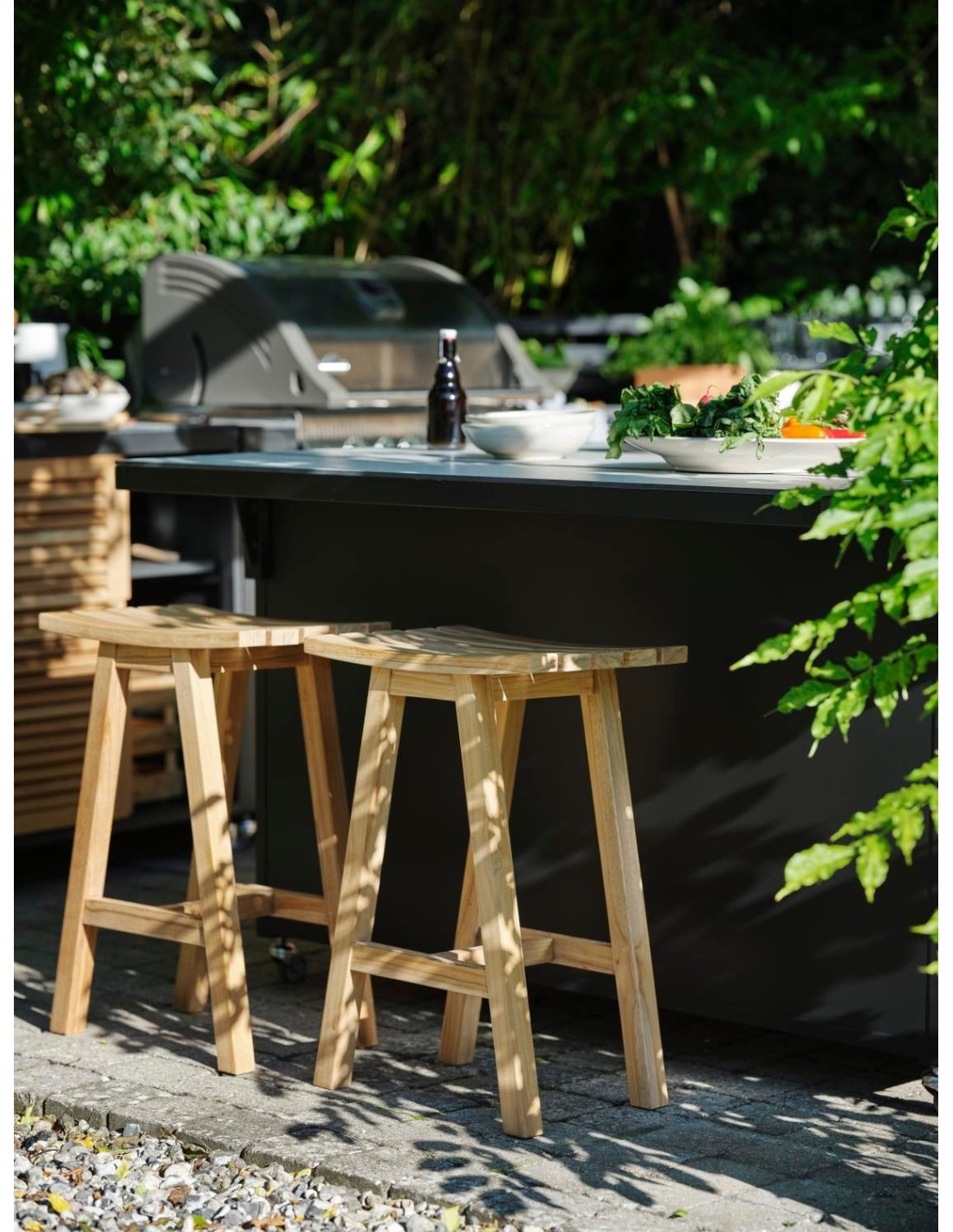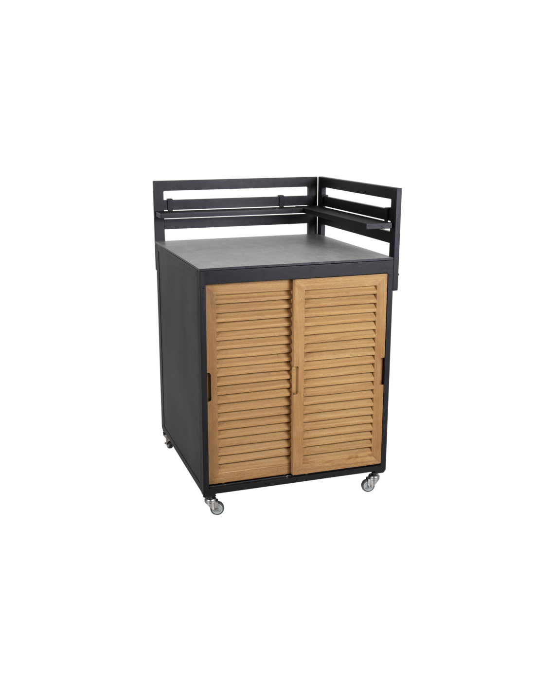 Cocina exterior premium en aluminio negro con puertas de madera de teca y encimera de laminado de alta presión. Diseñada para un estilo de vida moderno, incorpora múltiples funciones inteligentes. FORNAX está compuesta por cinco módulos diferentes que pueden combinarse para crear una cocina exterior completa y de gran tamaño. Uno de los módulos está preparado para añadir una barbacoa (NOTA: barbacoa no incluida), otro incluye fregadero y grifo, y otro cuenta con una encimera lisa, perfecta como superficie de trabajo.