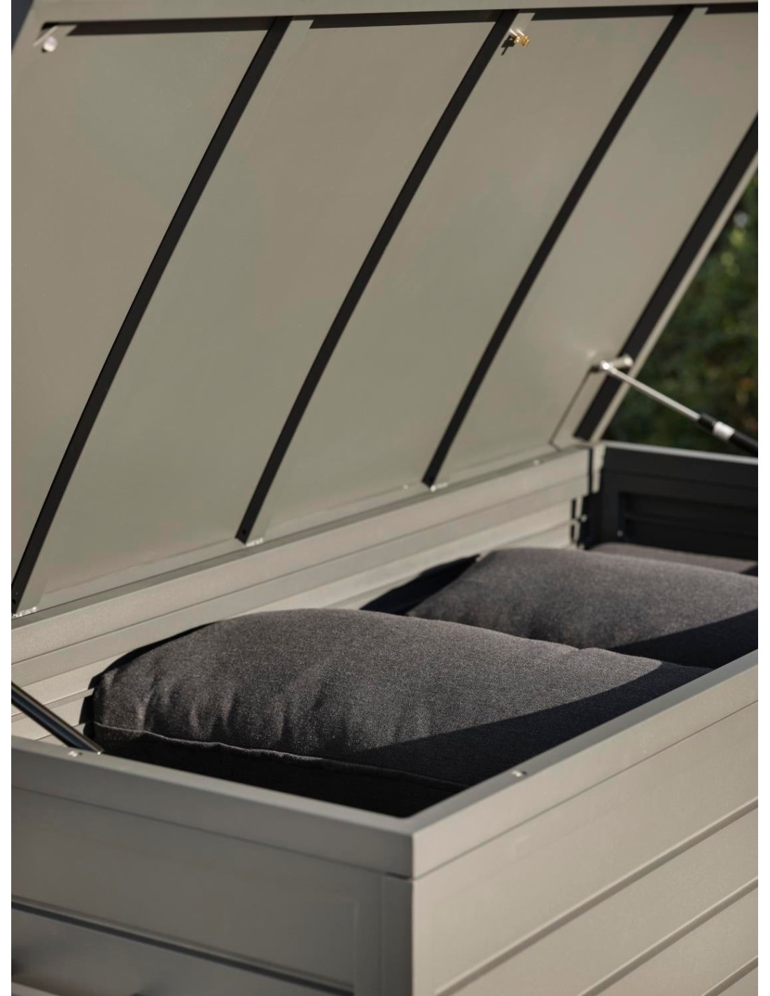 Arcón para cojines fabricado en aluminio. Gracias a su tapa plana, también puede utilizarse como superficie adicional de apoyo, mientras que las ruedas en uno de los lados facilitan su desplazamiento. Disponible en tres tamaños.