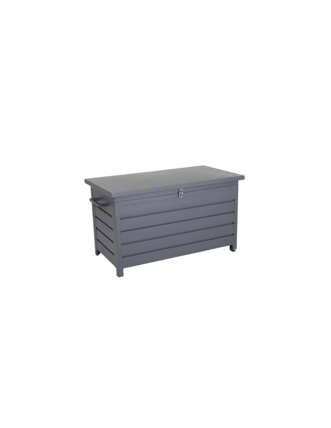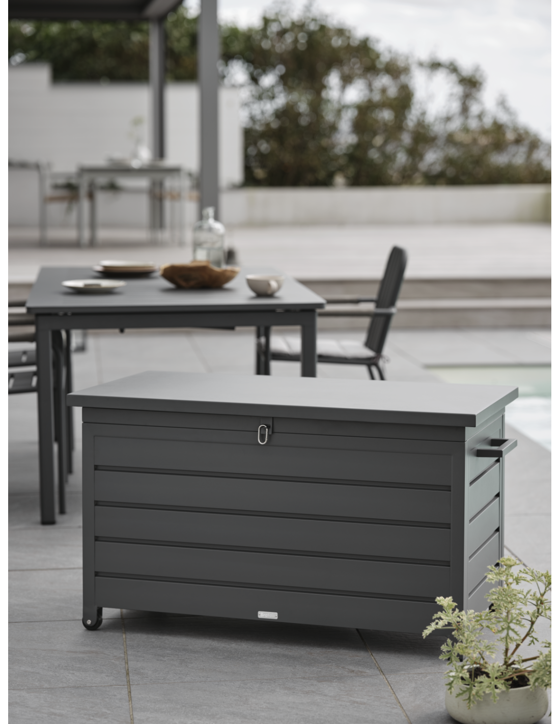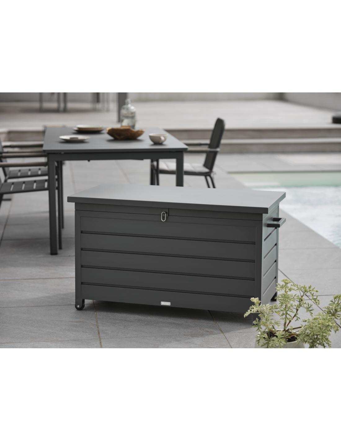 Arcón para cojines fabricado en aluminio. Gracias a su tapa plana, también puede utilizarse como superficie adicional de apoyo, mientras que las ruedas en uno de los lados facilitan su desplazamiento. Disponible en tres tamaños.