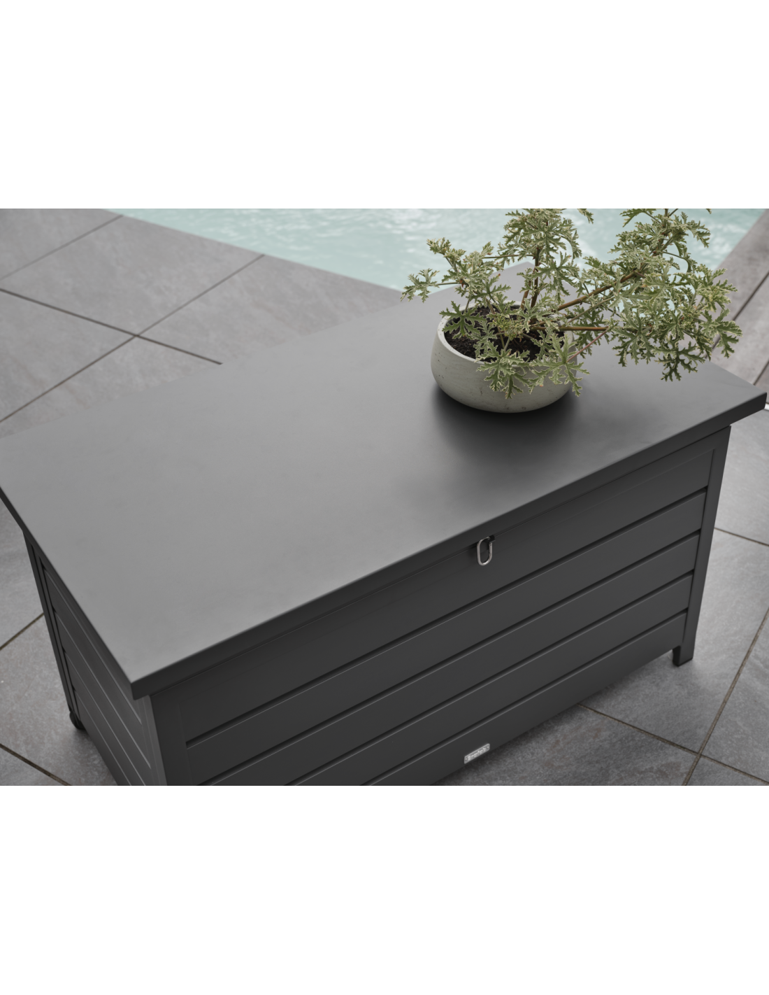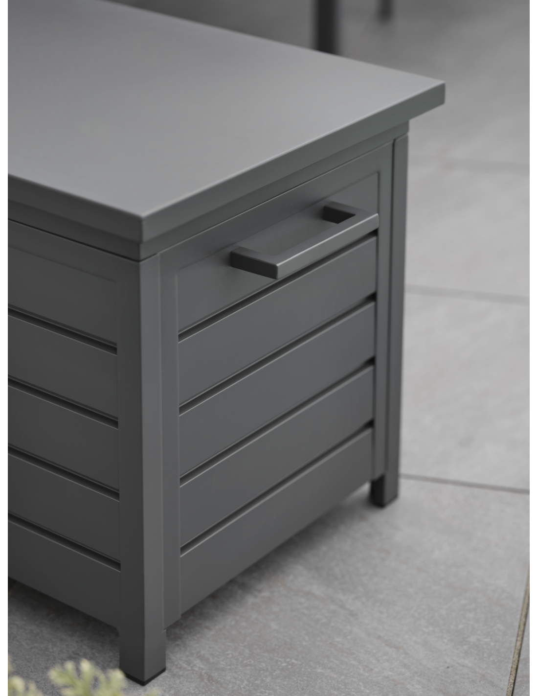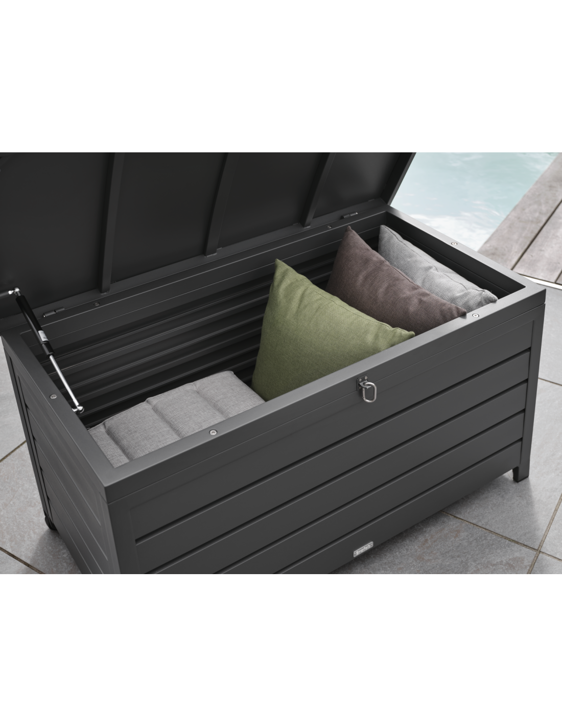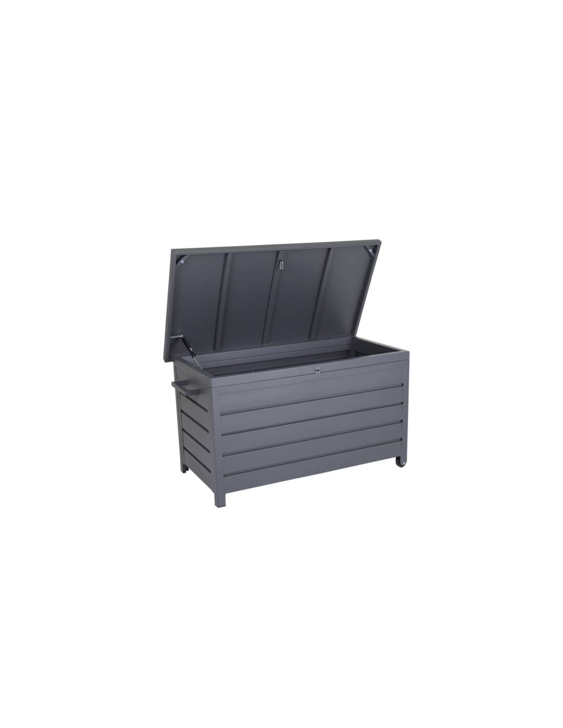Arcón para cojines fabricado en aluminio. Gracias a su tapa plana, también puede utilizarse como superficie adicional de apoyo, mientras que las ruedas en uno de los lados facilitan su desplazamiento. Disponible en tres tamaños.