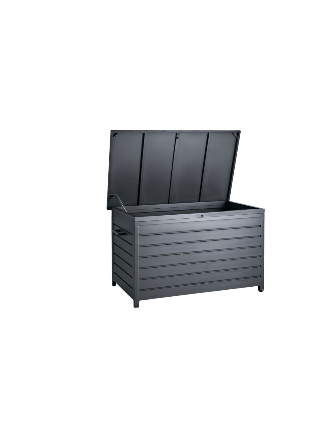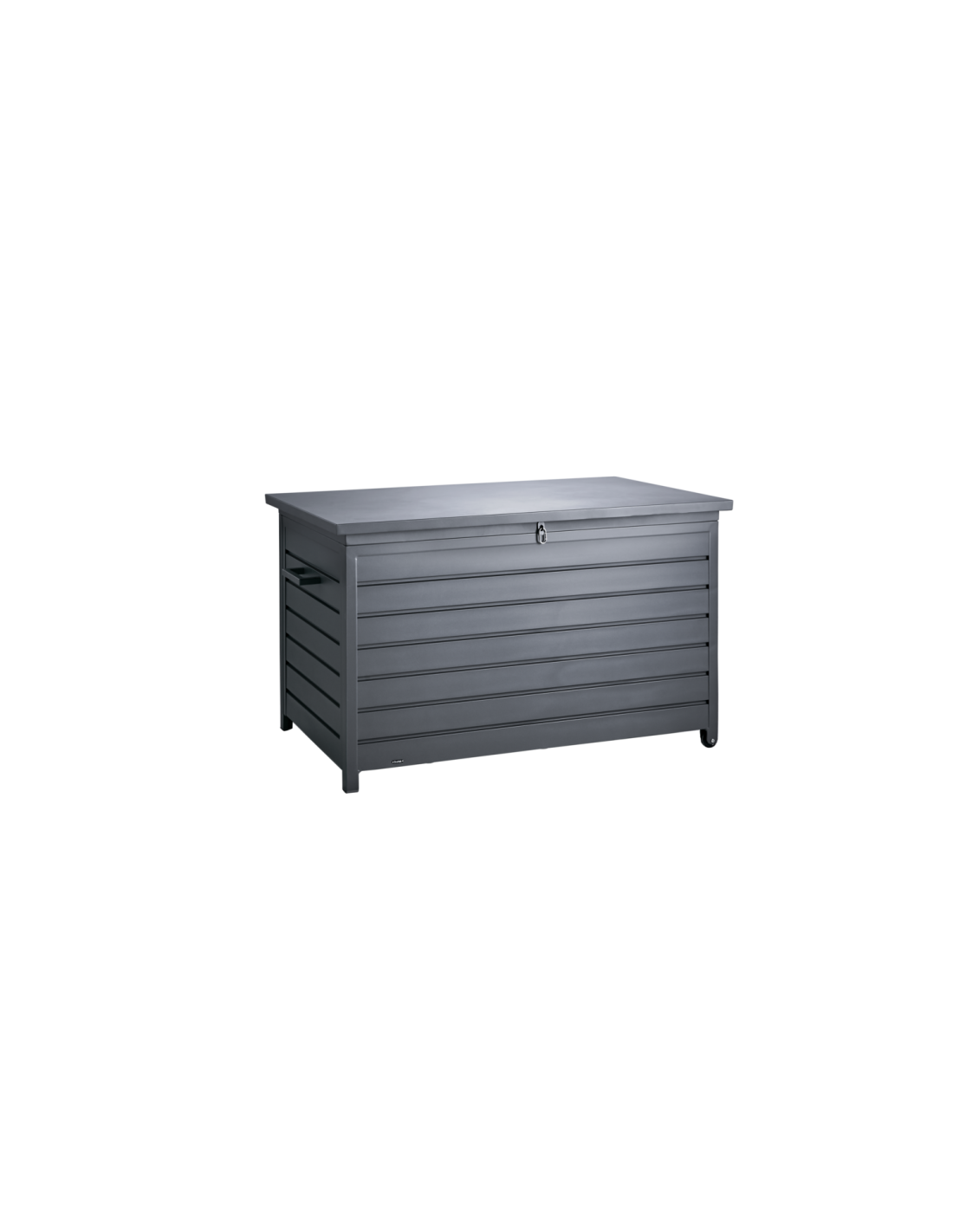 Arcón para cojines fabricado en aluminio. Gracias a su tapa plana, también puede utilizarse como superficie adicional de apoyo, mientras que las ruedas en uno de los lados facilitan su desplazamiento. Disponible en tres tamaños.