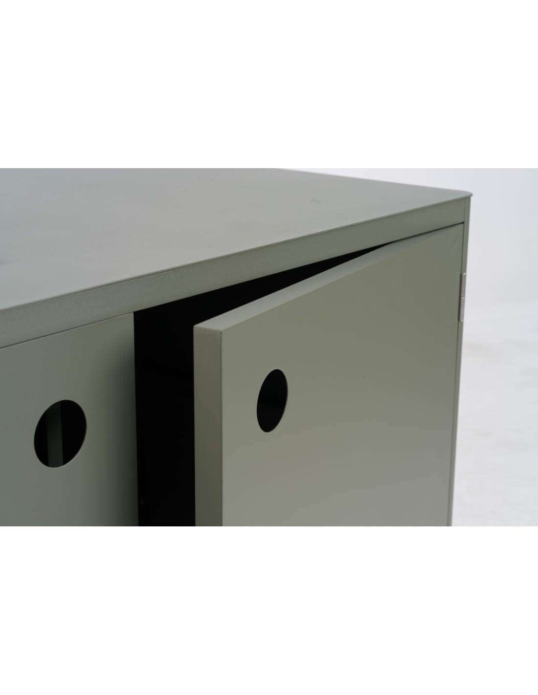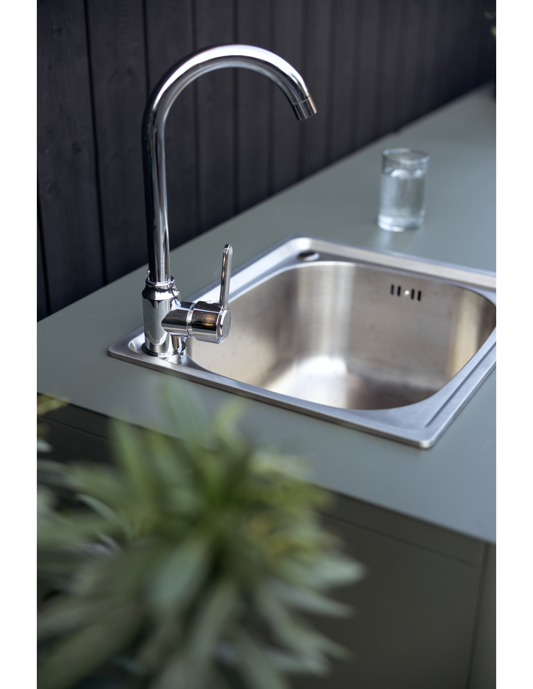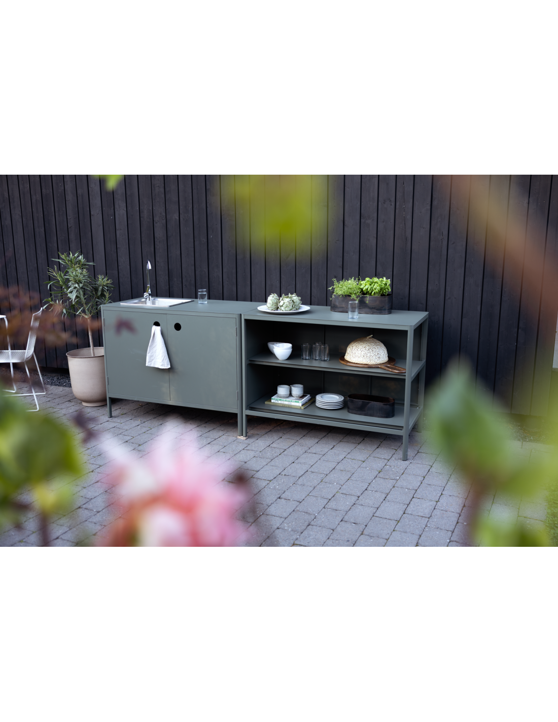 Cocina exterior con puertas de la colección KELIA. Cocina, almacena y disfruta al aire libre. Con KELIA puedes crear tu cocina exterior perfecta: práctica, elegante y siempre lista para cocinar al aire libre. Y para quienes disfrutan de la jardinería, también funciona perfectamente como banco de cultivo. Sus amplias superficies de trabajo y su almacenamiento bien pensado facilitan tanto la preparación como el servicio. La serie está disponible en tres versiones; con puertas, con fregadero y grifo o con estantes abiertos, todas diseñadas para combinar perfectamente con la colección Delia.