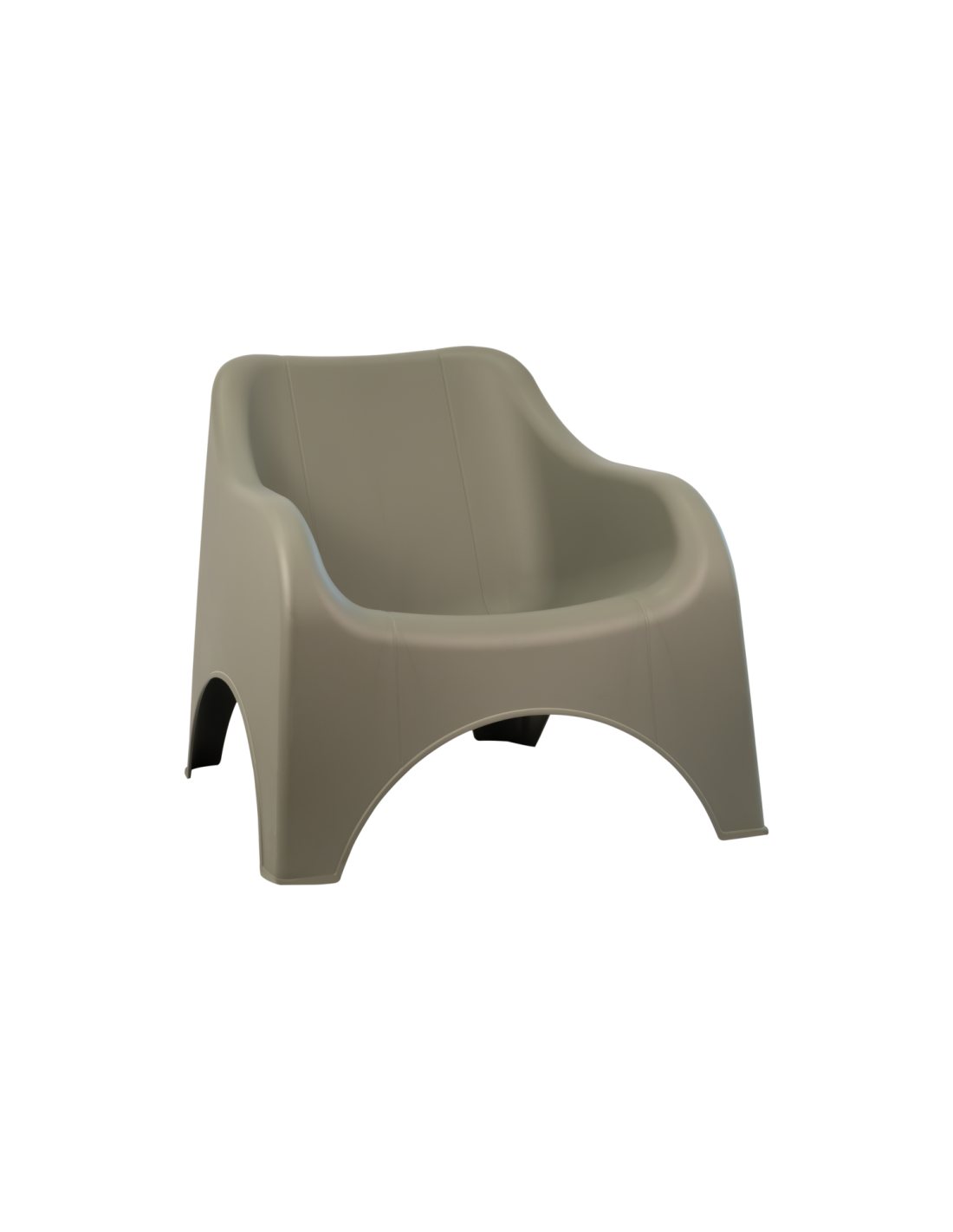 Sillón exterior con formas suaves y desenfadadas, fabricado en plástico sostenible. Apilable y versátil, con orificios de drenaje en el asiento para un uso cómodo en exteriores. Disponible en varios colores que aportan un toque personal a tu terraza.