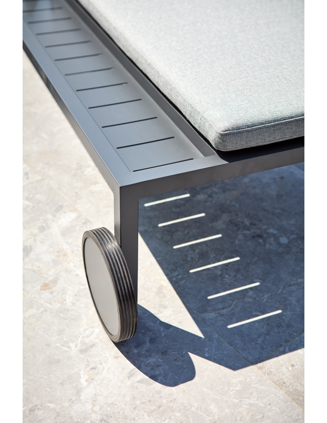 Esta tumbona extra ancha ofrece un confort generoso e incorpora una práctica repisa lateral en el lado derecho para bebidas, libros o protector solar. Gracias a sus ruedas, es fácil de mover y, con sus tejidos suaves y un diseño pensado para la relajación, aporta aún más comodidad y elegancia a tu espacio exterior.