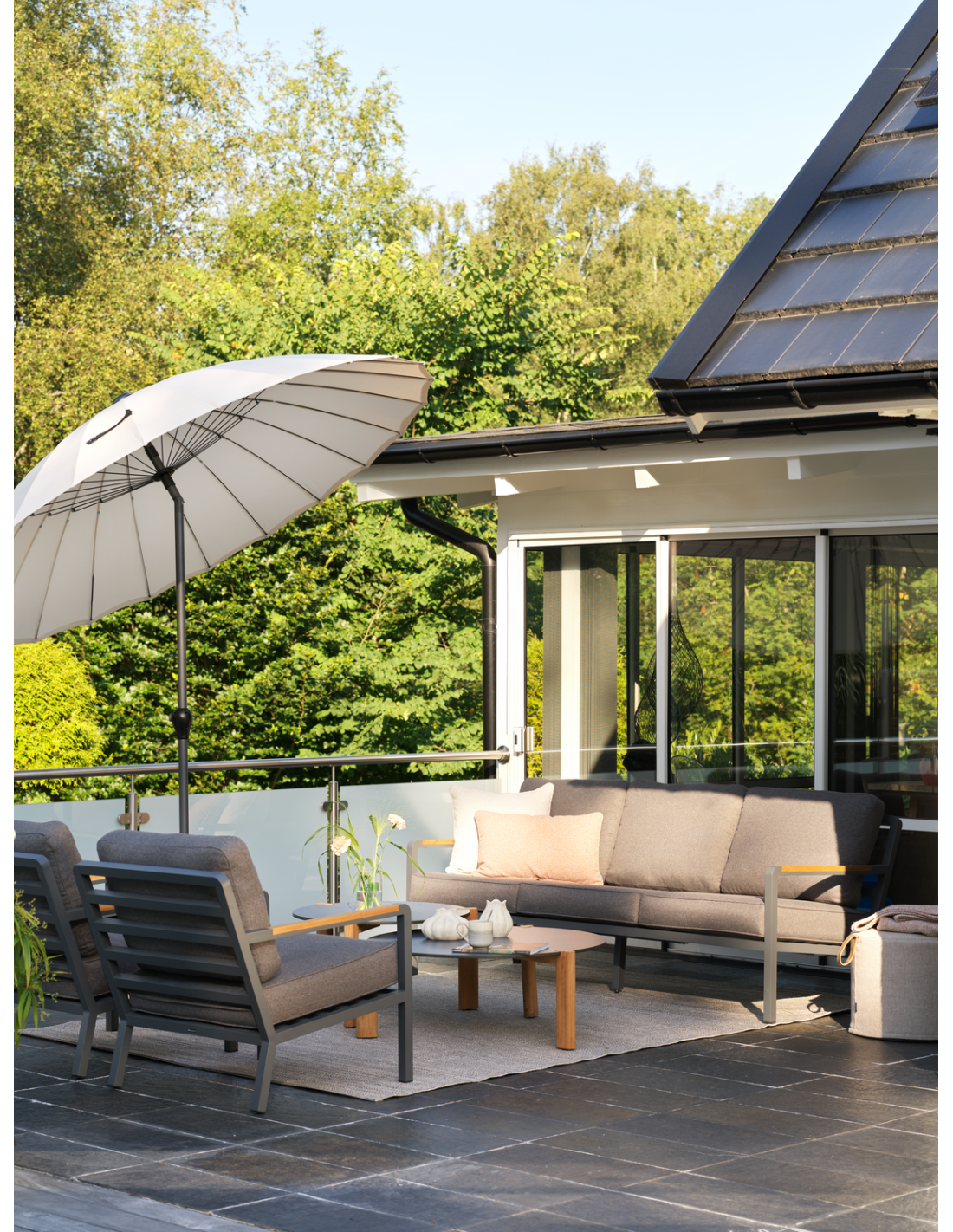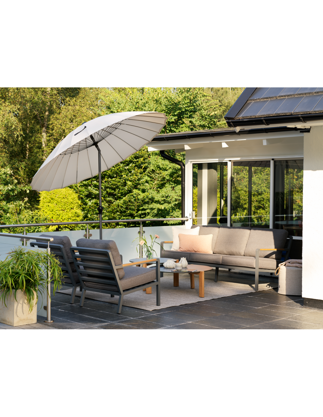 SHANGHAI es una sombrilla moderna de gran tamaño con protección UPF 50+ contra la radiación ultravioleta del sol. Su diámetro de 270 cm proporciona sombra donde más se necesita. Además, cuenta con una robusta manivela y un mástil inclinable, lo que permite ajustar fácilmente la sombra. Al inclinarlo, se hacen visibles sus múltiples y elegantes varillas de acero, combinando forma y funcionalidad en perfecta armonía. SHANGHAI aportará tanto estilo como funcionalidad a tu terraza. Una pieza que reúne todas las características necesarias de un clásico parasol SHANGHAI.