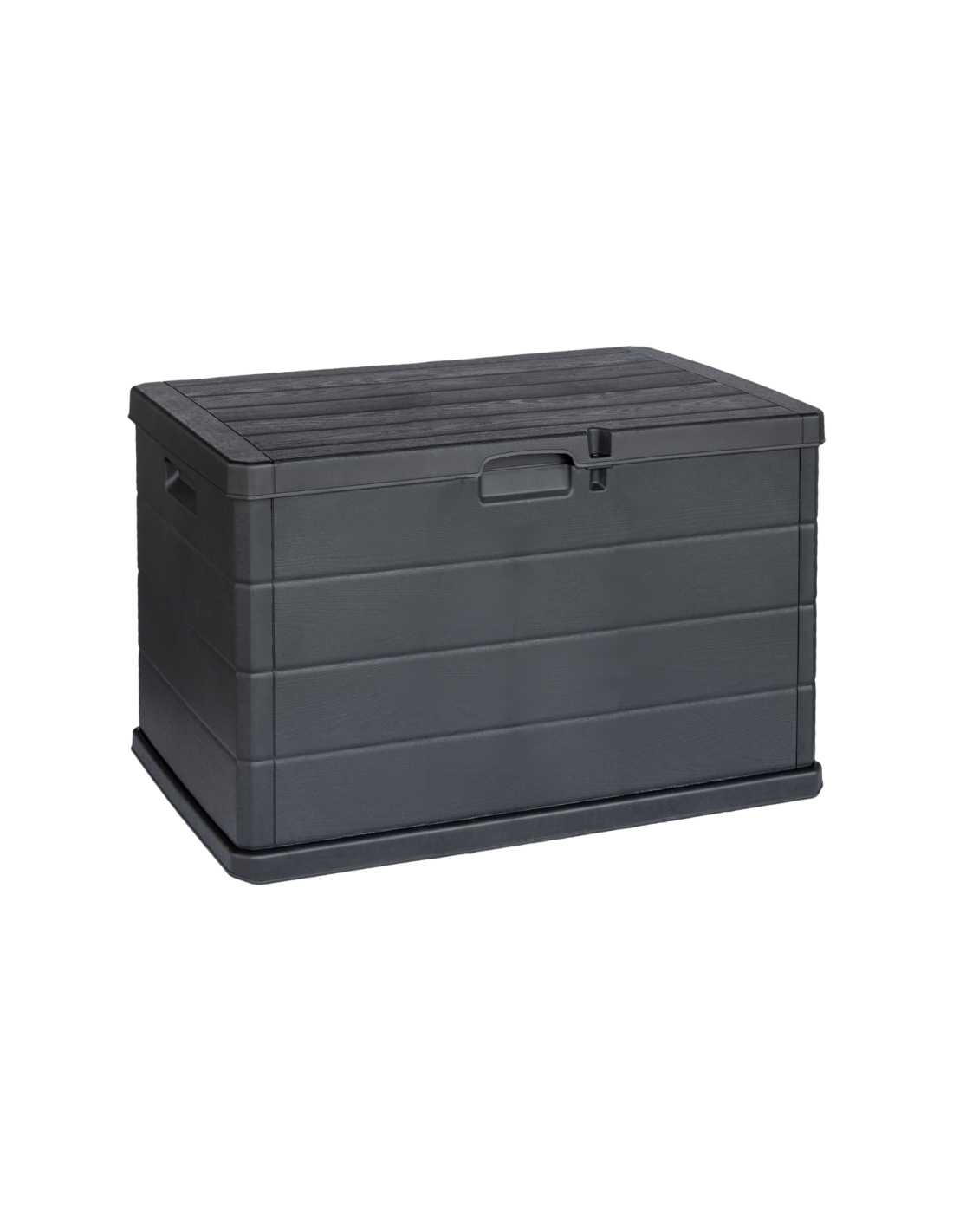 Práctico arcón de cojines exterior, fabricado en plástico negro con una discreta superficie texturizada. Disponible en dos tamaños, permite almacenar desde cojines hasta juguetes y otros artículos de exterior. Equipado con asas laterales y orificios para candado, lo que facilita tanto su transporte como su seguridad.