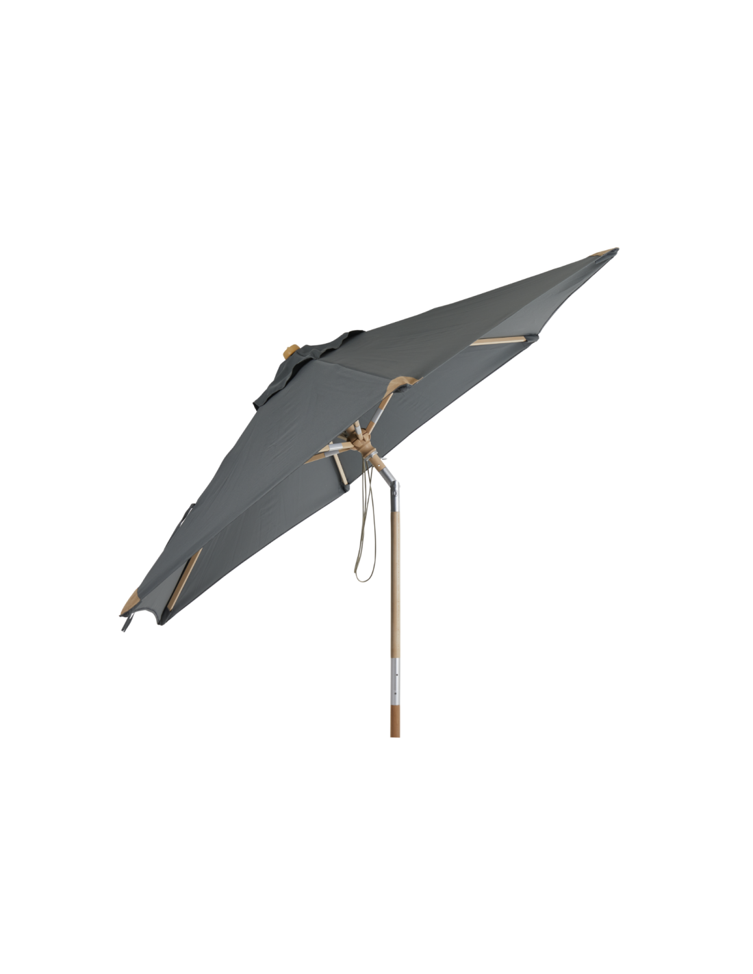 Sombrilla exterior de 250 cm de diámetro, elaborada en madera de haya acabado barnizado mate, con mástil en dos piezas con mecanismo de inclinación tipo push, elegante detalle en cuero y cubierta en tejido de poliéster de 250 gr.