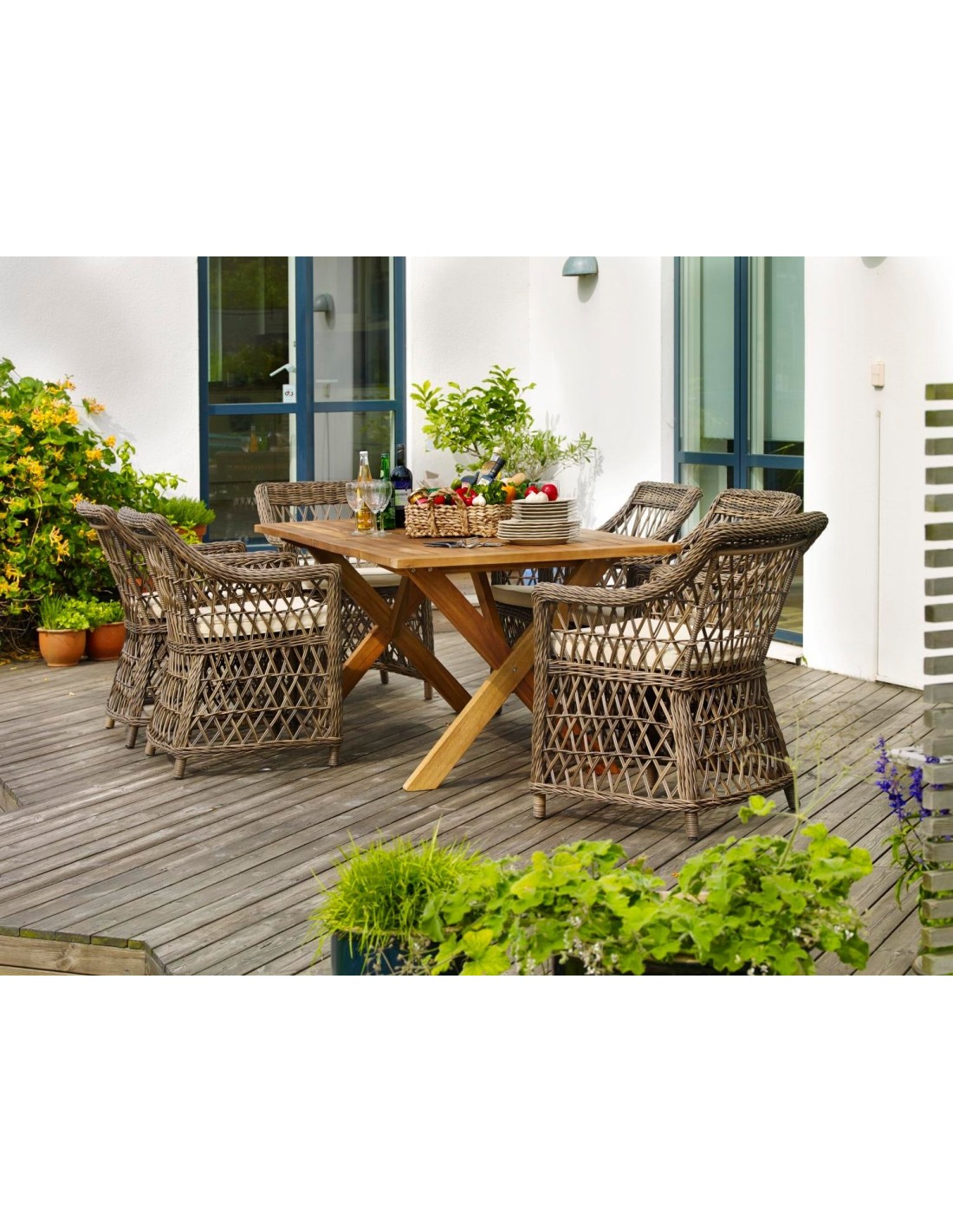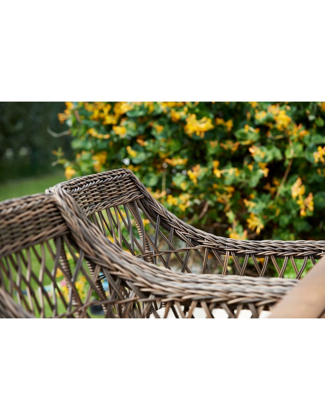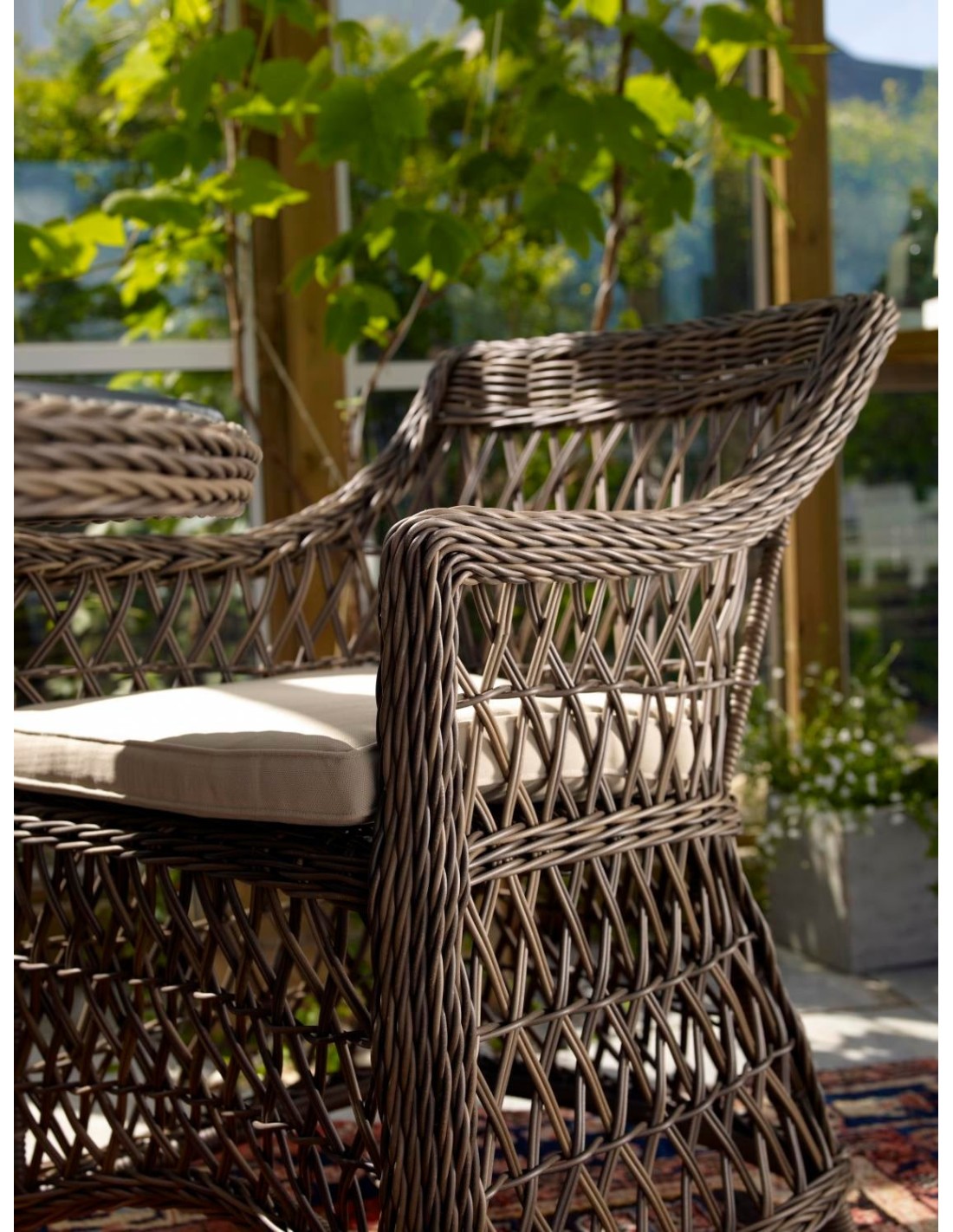 Con ratán sintético de 5,3 mm, tejido de forma abierta sobre una estructura de aluminio, Beatrice muestra claras influencias del pasado. Cojines incluidos.