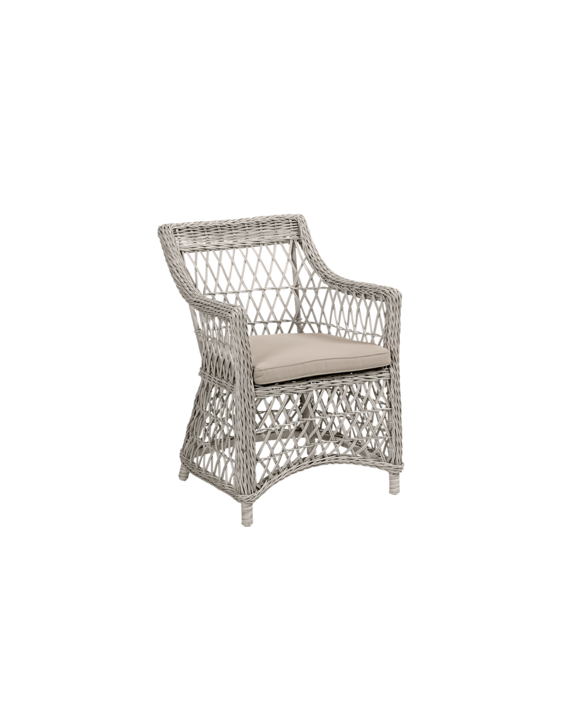Con ratán sintético de 5,3 mm, tejido de forma abierta sobre una estructura de aluminio, Beatrice muestra claras influencias del pasado. Cojines incluidos.
