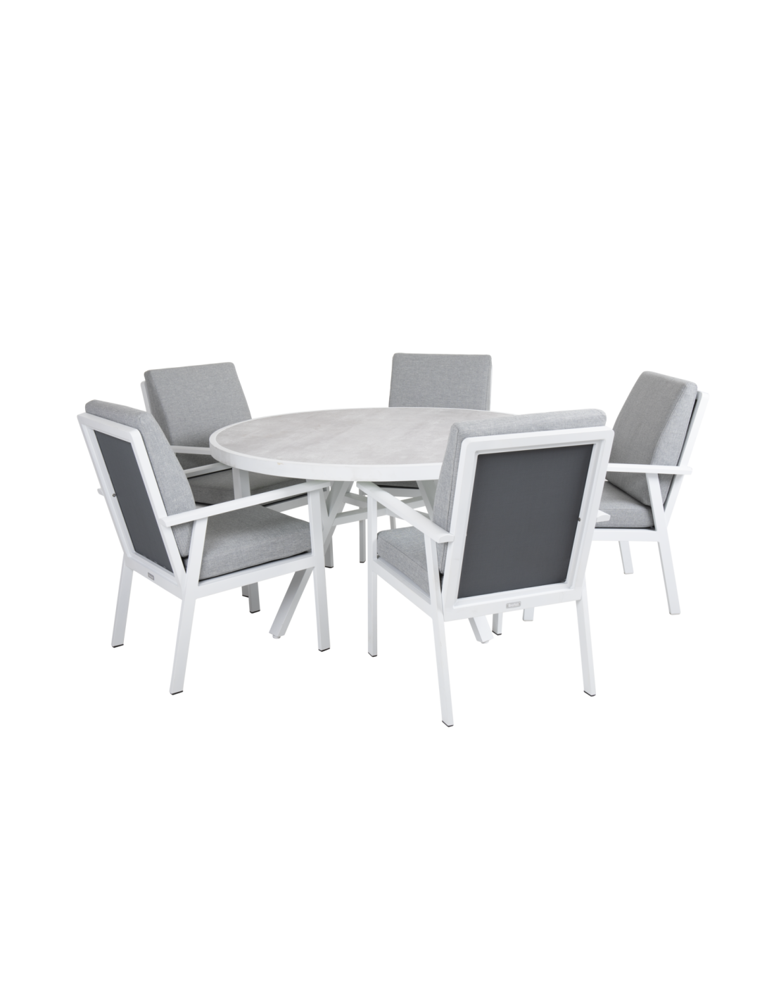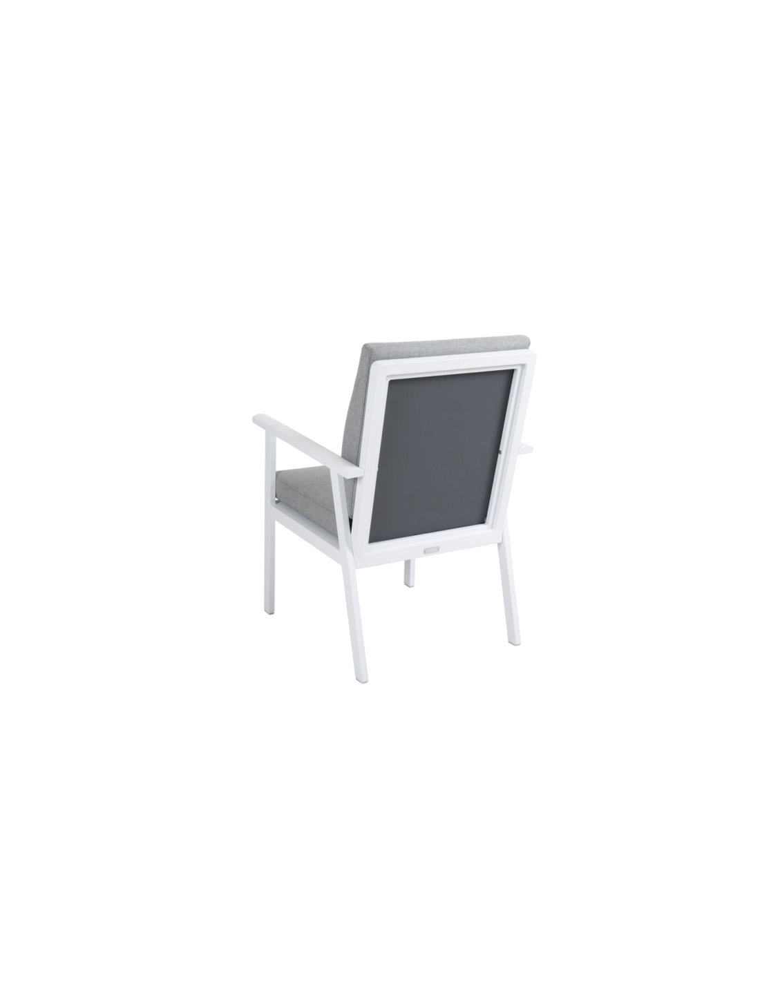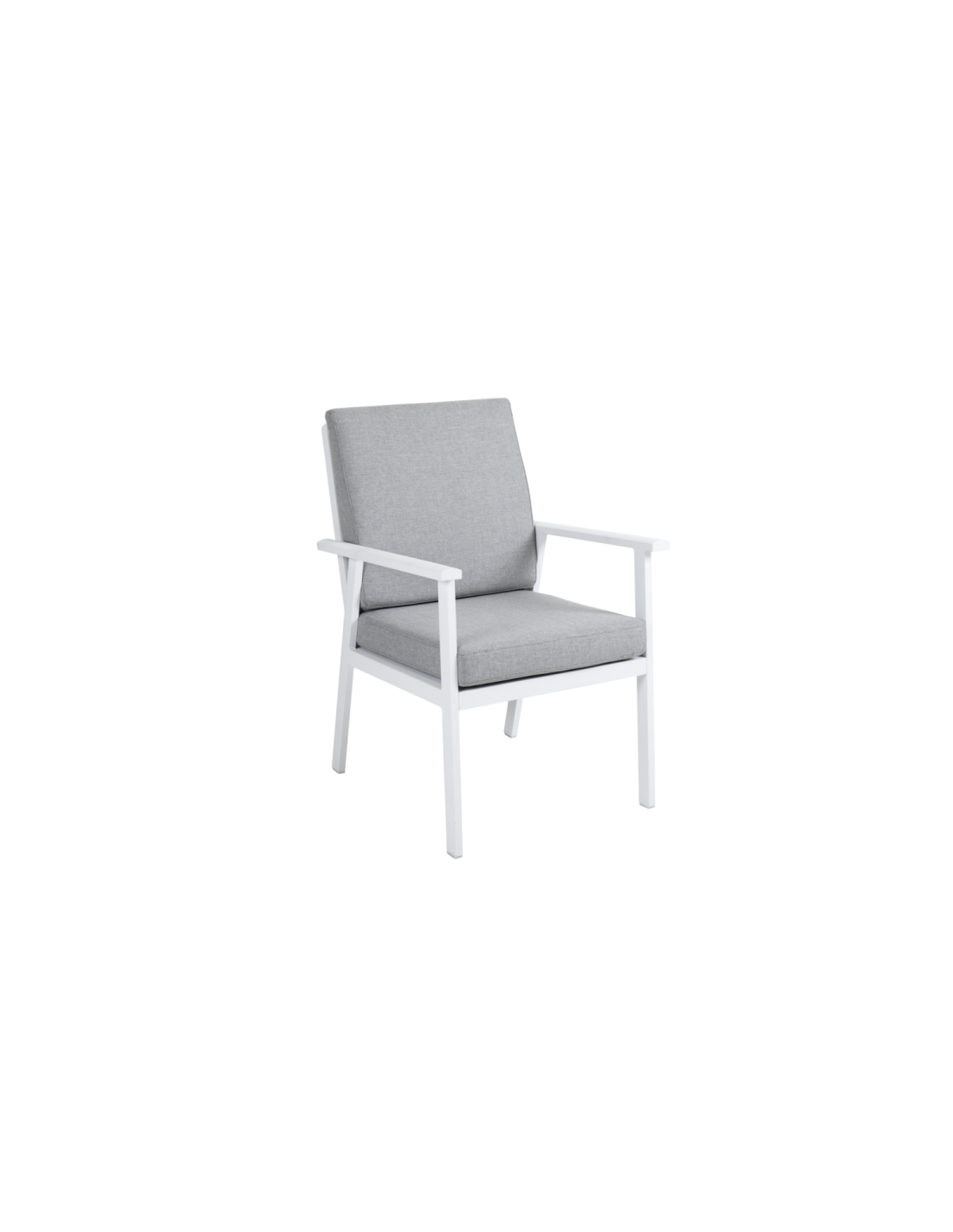 Un sillón atractivo y elegante de la popular serie Samvaro. El ángulo relajado hace que sea ideal para comer y descansar. Confort excepcional gracias a los cojines gruesos, diseñados para proporcionar un apoyo adicional para la espalda. Una serie moderna y a la vez clásica en aluminio que ofrece un abanico de posibles combinaciones. Los contornos suaves y curvados crean una sensación agradable y acogedora en esta nueva serie, con atención al detalle. Disponible con estructura de aluminio en blanco, gris o caqui.