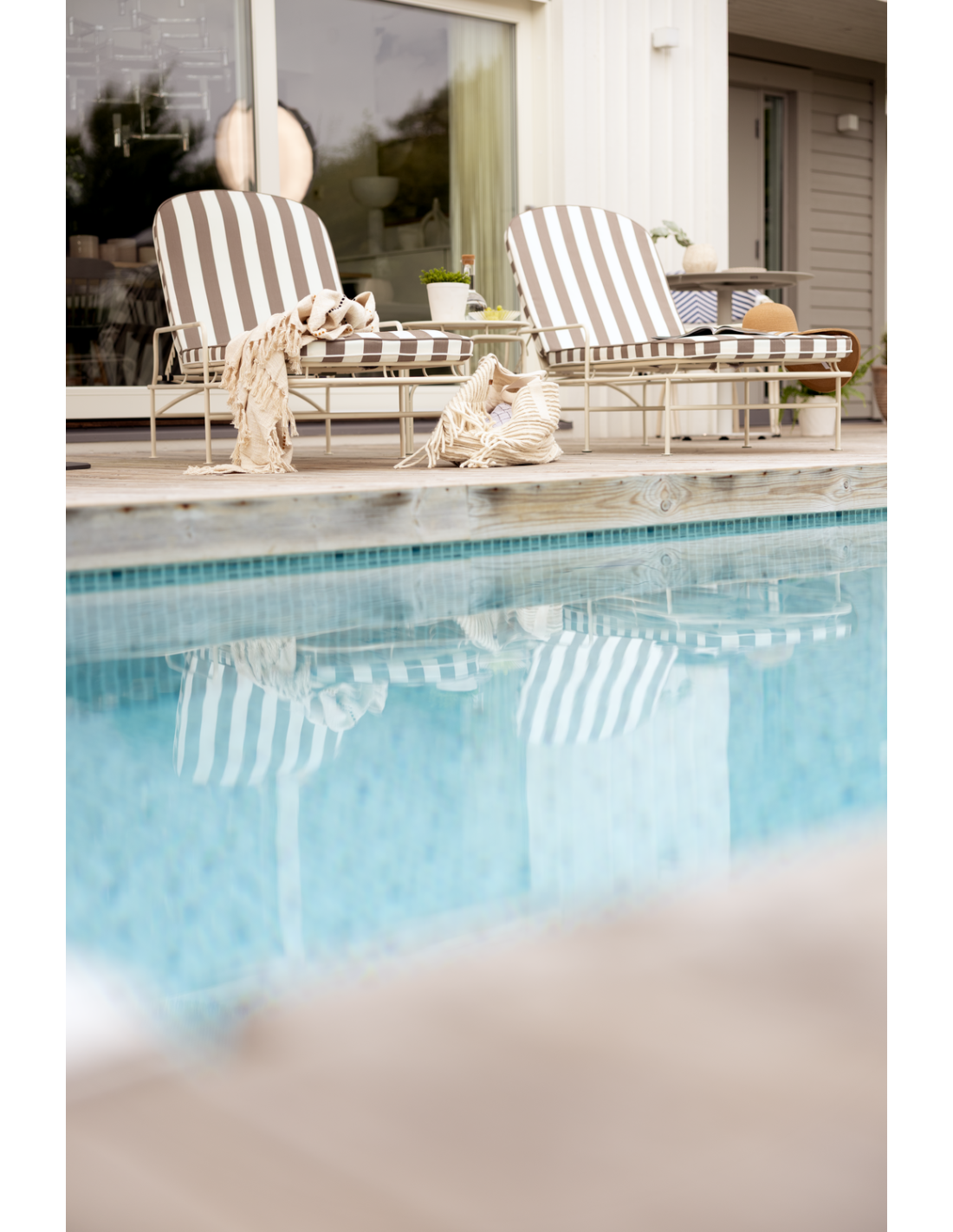 Sueña con la Riviera Francesa con Arts: una tumbona con mesa auxiliar a juego que combina elegancia y comodidad. Sus varillas metálicas curvadas, la estructura decorativa de acero y los tejidos de rayas de colores aportan un estilo atemporal y un encanto relajado a cualquier espacio exterior.