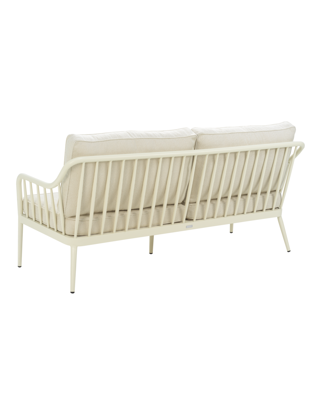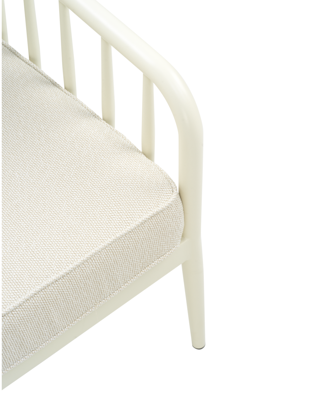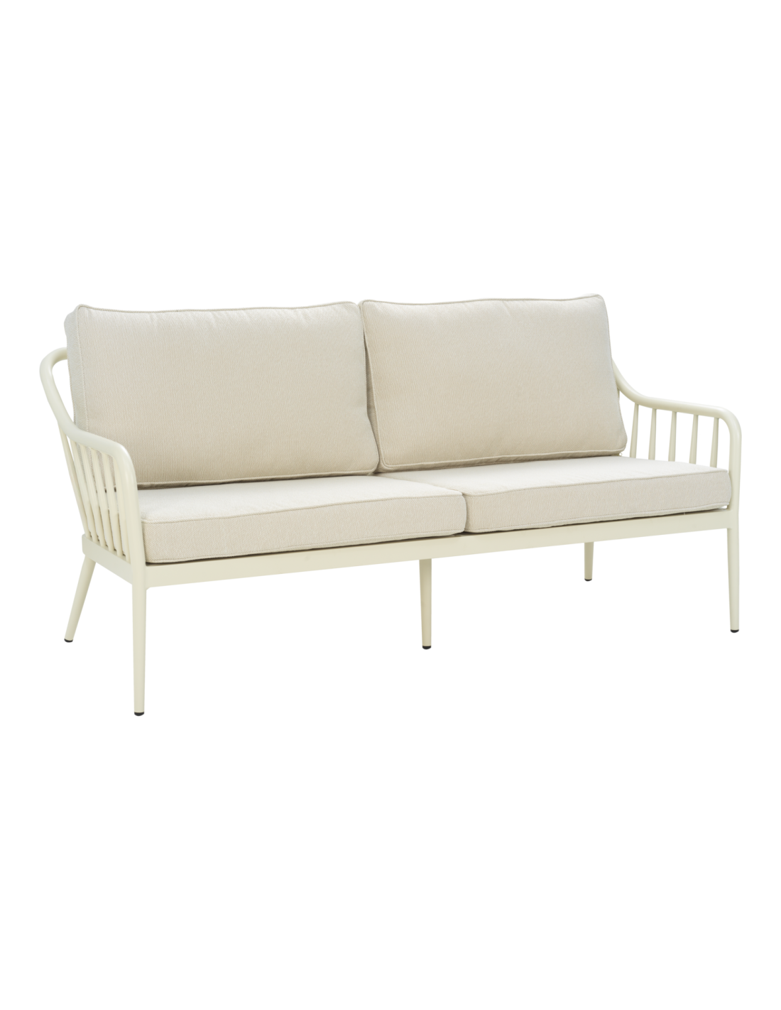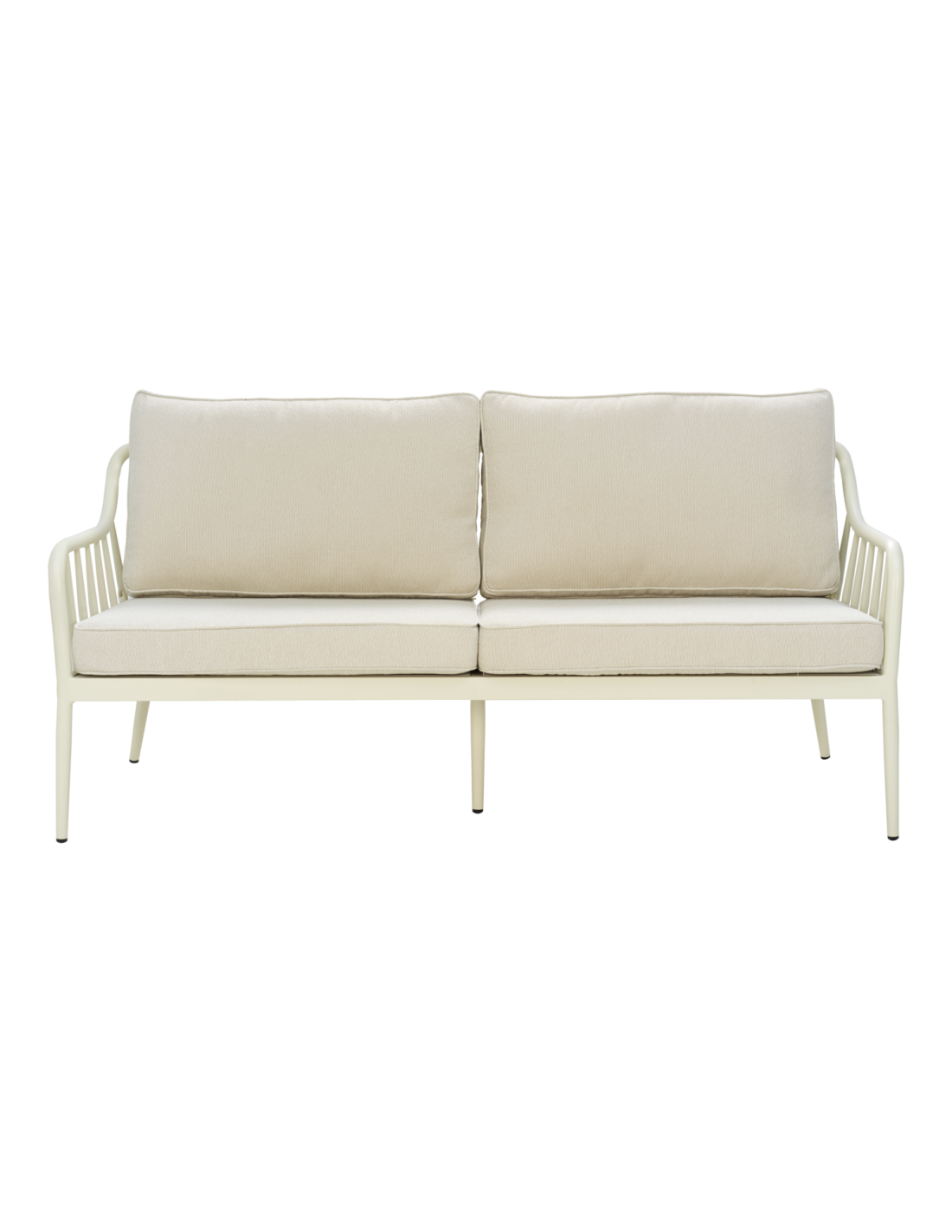 Sofá de 2 plazas con respaldo abierto y laterales abiertos. La forma suave se combina con líneas limpias en una mezcla de clásico y moderno. Fabricado con perfil redondo de aluminio con acabado mate, que aporta durabilidad y elegancia. Los cojines suaves en poliéster reciclado añaden comodidad y resistencia.