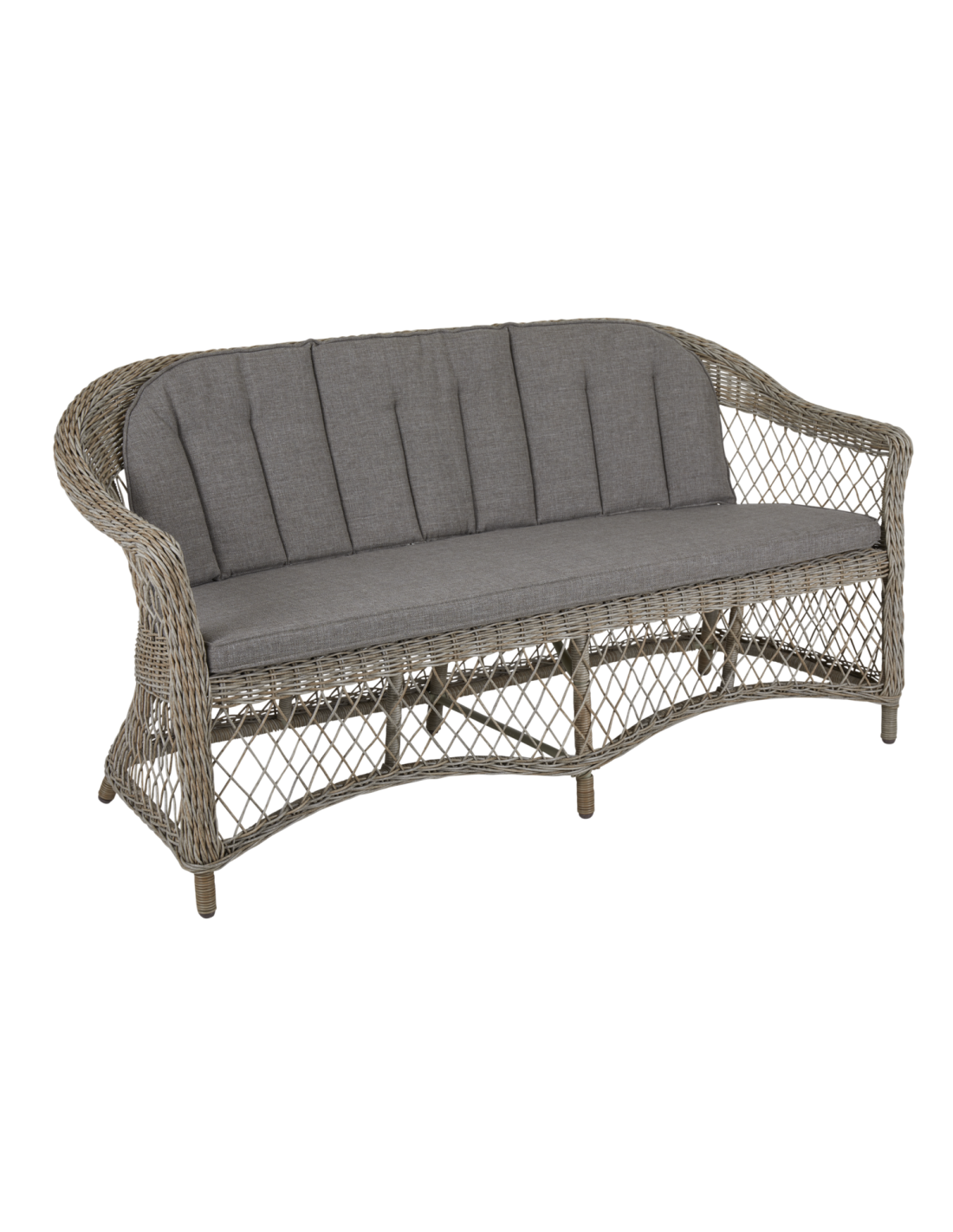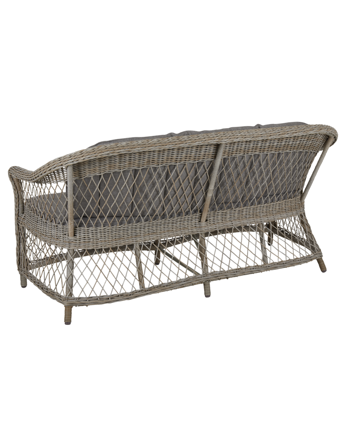 Hermoso, clásico y acogedor. Este sofá de 2 plazas en ratán sintético de color natural es un lugar invitante para descansar. Incluye cojín de asiento y respaldo en tejido olefina beige. Una serie clásica y romántica con trenzado abierto de ratán sintético.