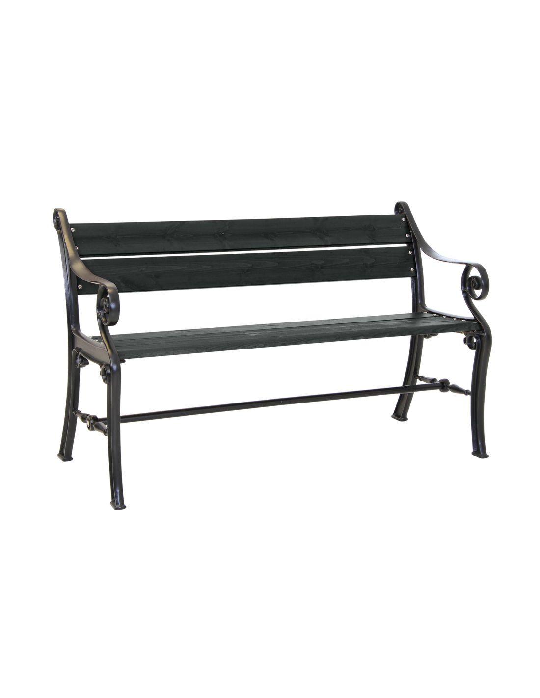 Banco de jardín clásico con extremos decorativos en aluminio fundido pintado en negro, combinado con pino teñido en negro en el asiento.