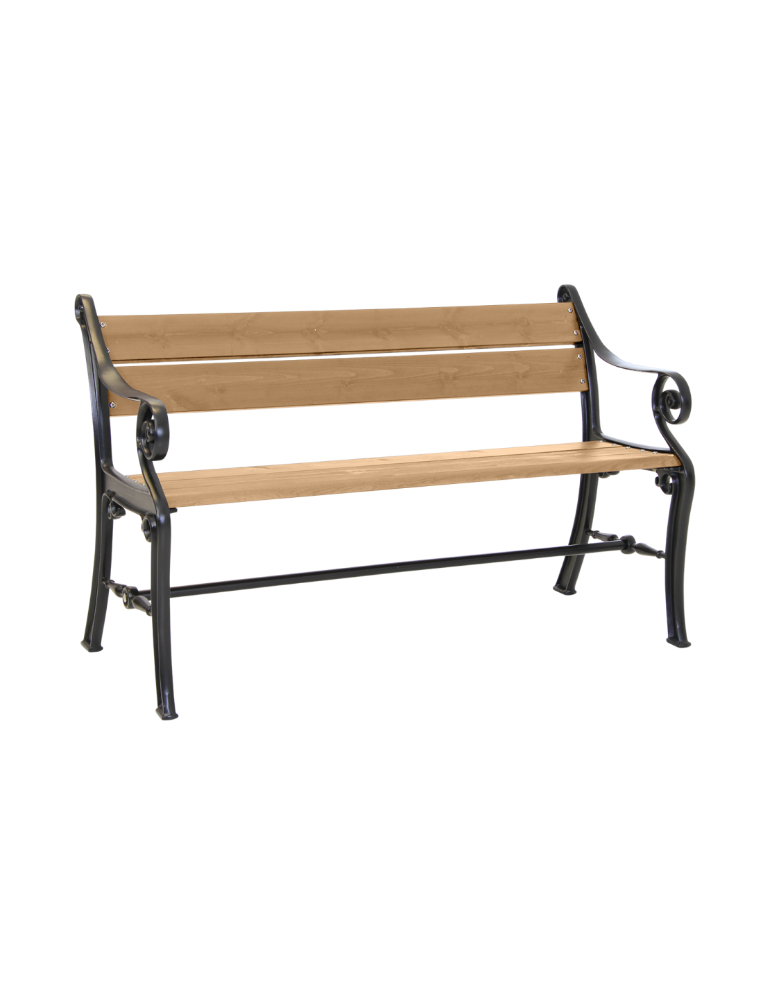 Banco de jardín clásico con extremos decorativos en aluminio fundido pintado en negro, combinado con pino impregnado en marrón en el asiento.