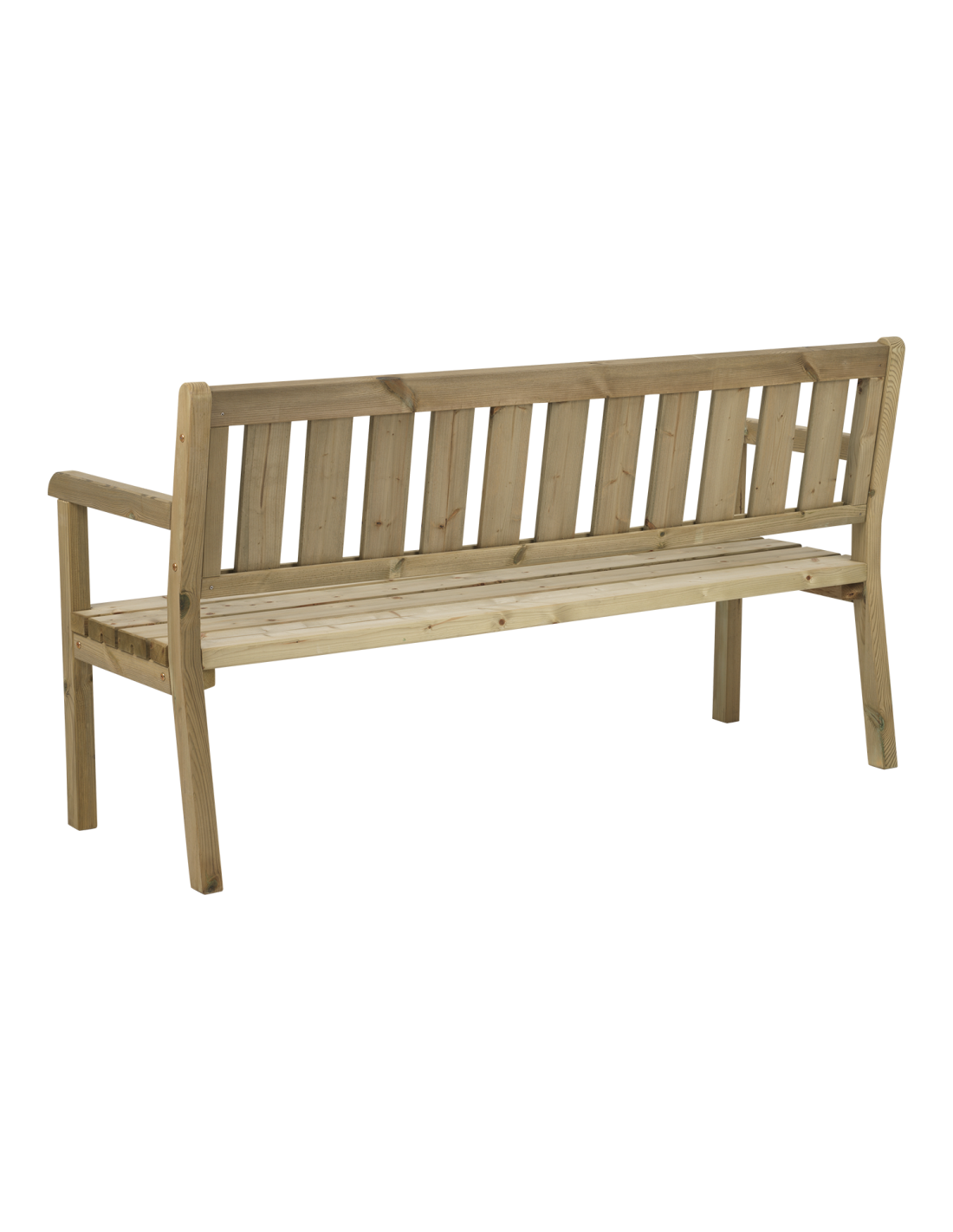 Elegante banco de jardín en pino verde impregnado, combinación perfecta de elegancia natural y construcción duradera. Diseño ergonómico para mayor comodidad.