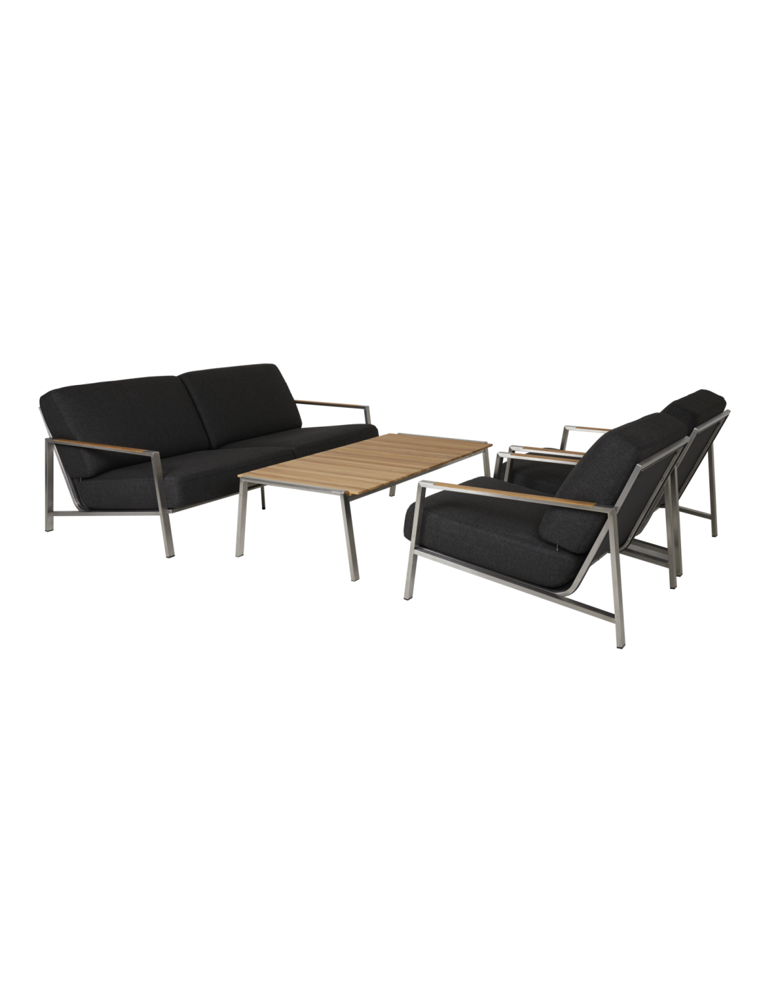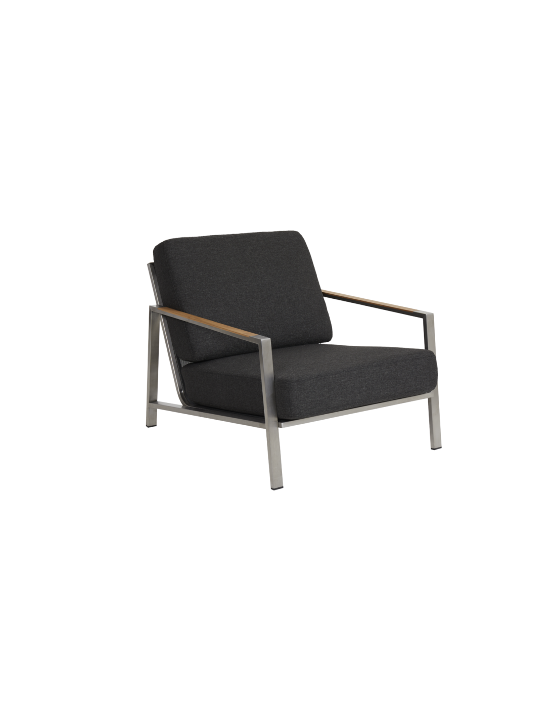 Un hermoso sillón que se siente verdaderamente moderno gracias a su estructura de acero inoxidable. Amplio y profundo, con una inclinación cómoda; aquí puedes relajarte con estilo. Los detalles definen el conjunto, y los elementos de teca en los reposabrazos elevan la sensación de diseño cuidado. La baja altura del asiento potencia el estilo lounge moderno y los cómodos cojines de espuma de alta densidad con tapizado en tejido olefina forrado los hacen repelentes al agua. Una zona de descanso con bonitos detalles y ángulos. Líneas limpias y diseño atemporal con un giro moderno. Naos es una serie donde la mezcla de materiales se realiza con la máxima delicadeza: acero inoxidable (316) y detalles en teca.