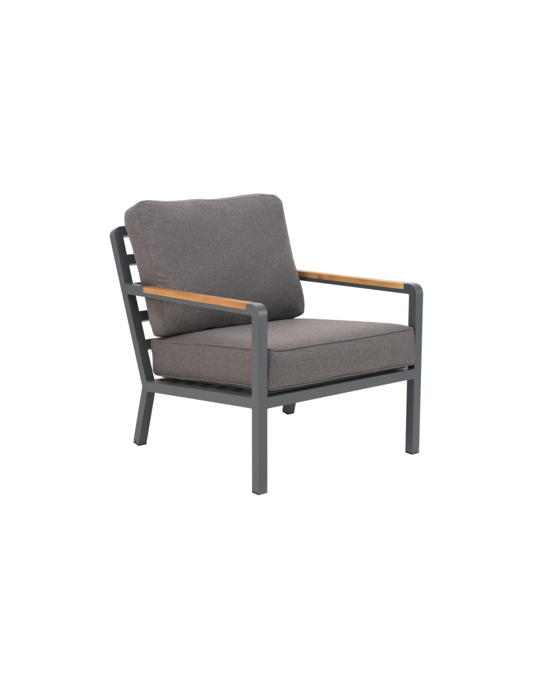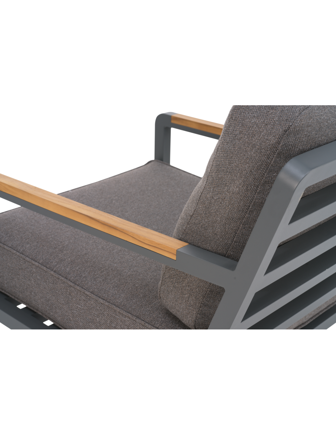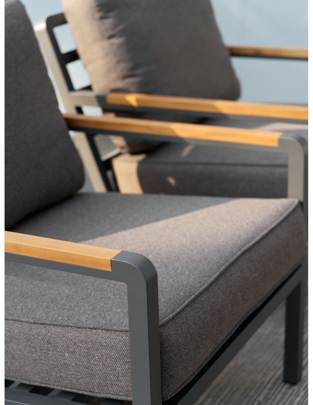 Una serie lounge moderna con una expresión sofisticada. El asiento profundo y los cojines con forro TPU repelente al agua proporcionan comodidad y practicidad duraderas. La generosa inclinación potencia la sensación de relax, mientras que las inserciones sólidas de teca en los reposabrazos aportan calidez natural y un elegante contraste con la estructura de aluminio. La serie también puede apilarse para facilitar el almacenamiento.