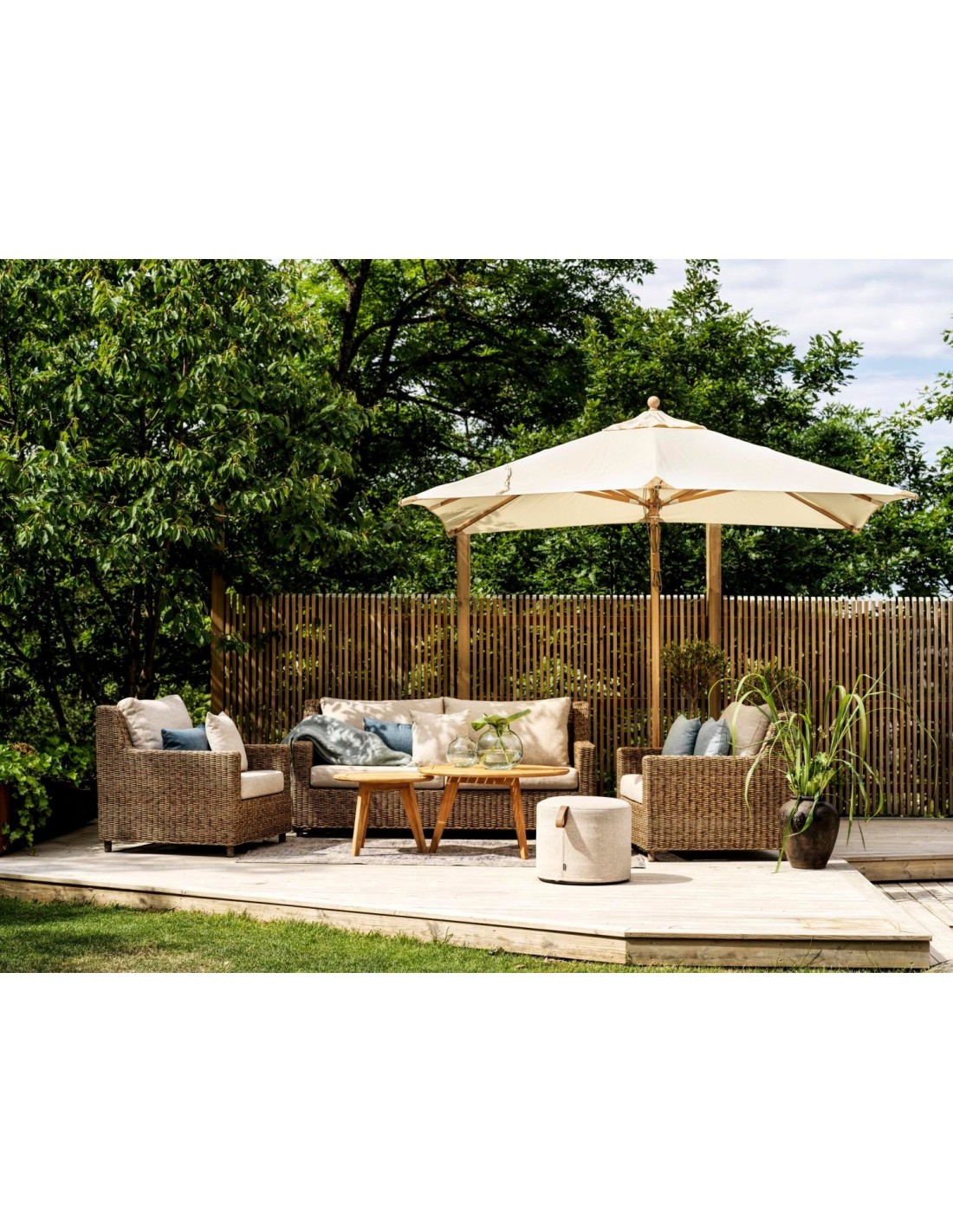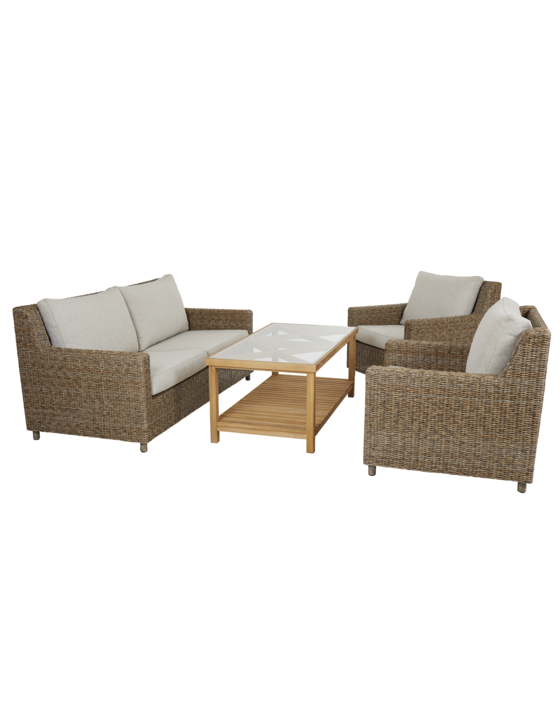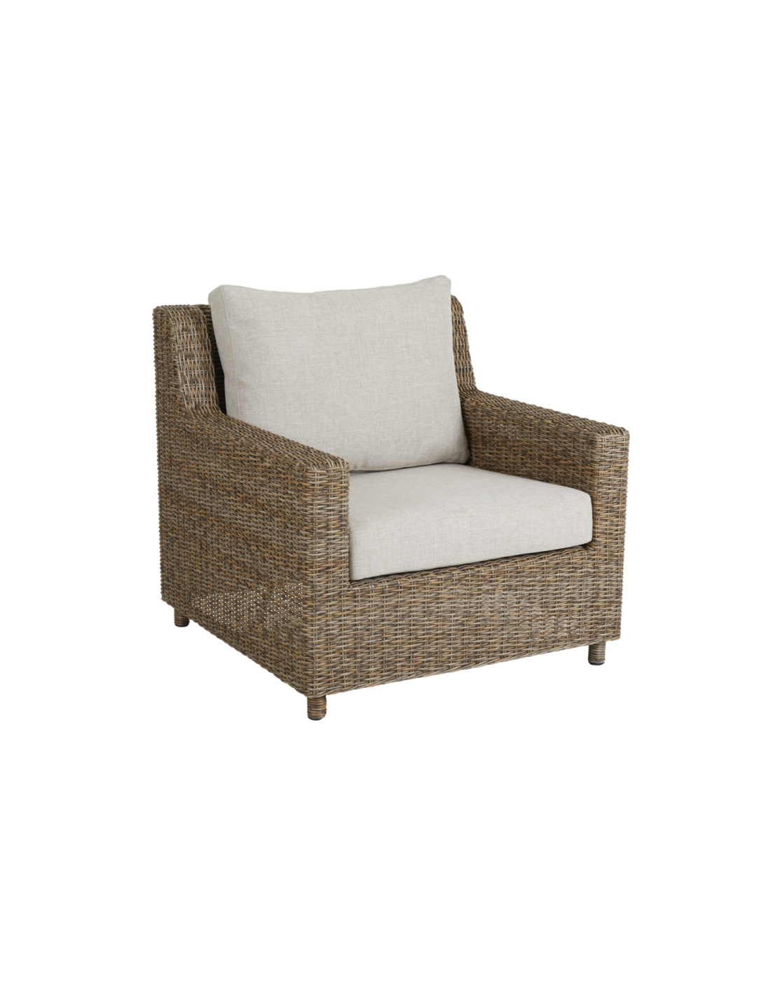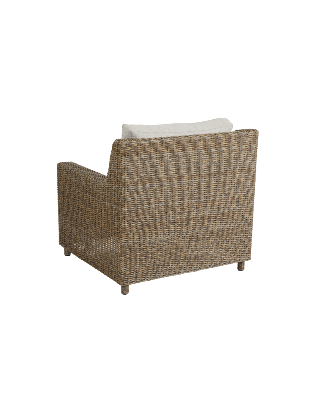 Elegante y discreta con proporciones acogedoras en un relajado estilo New England. Diseño de líneas limpias y rectas con un nuevo color rústico en el ratán sintético. Cojines en tejido olefina.