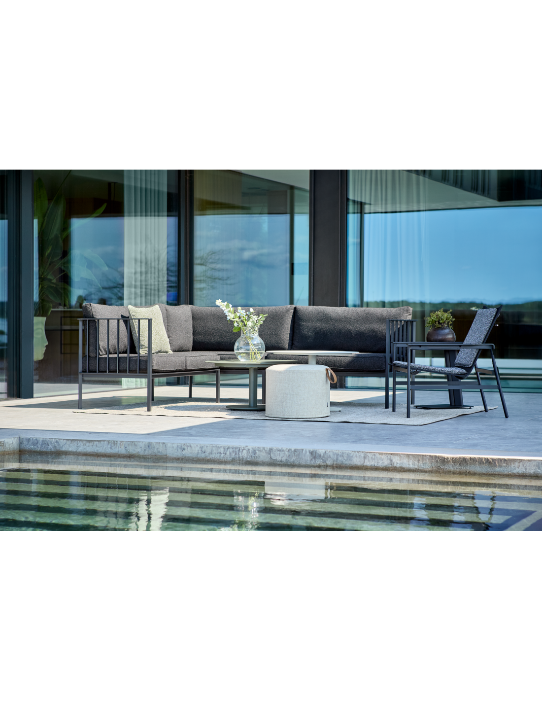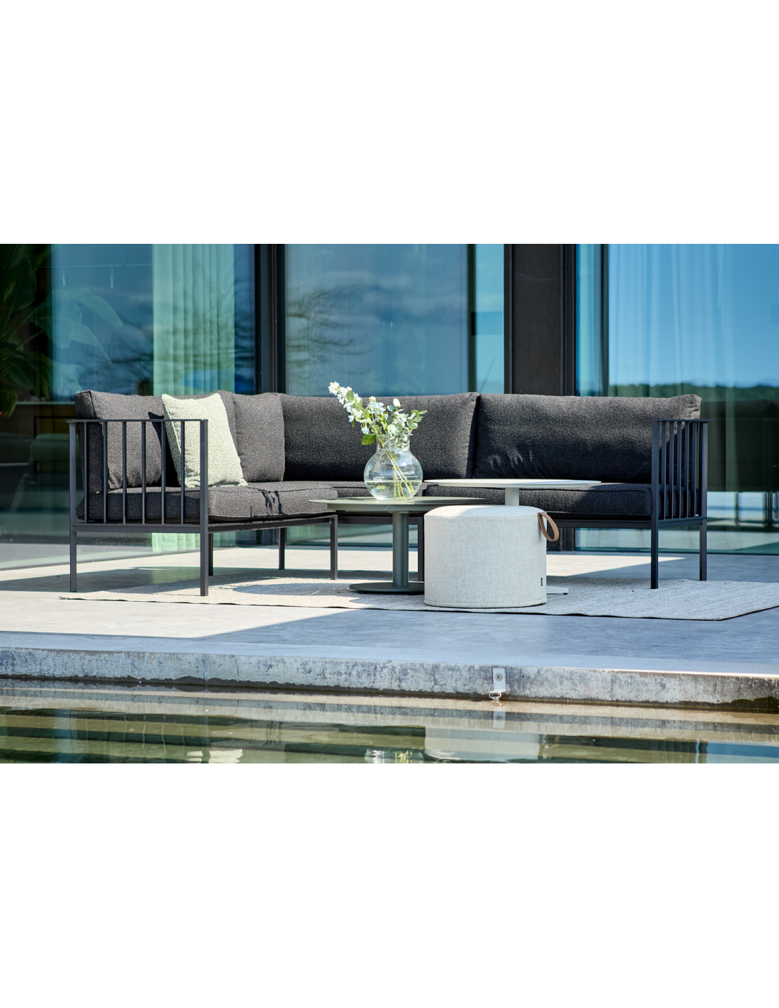 Conjunto completo de sofá esquinero Upper. Una solución de sofá moderna y limpia con gran flexibilidad modular y excelente comodidad. Todas las piezas se entregan en una caja para facilitar su manejo y pueden apilarse para un almacenamiento sencillo en invierno. La estructura de aluminio sostiene generosos cojines de asiento y respaldo rellenos de plumón sintético.