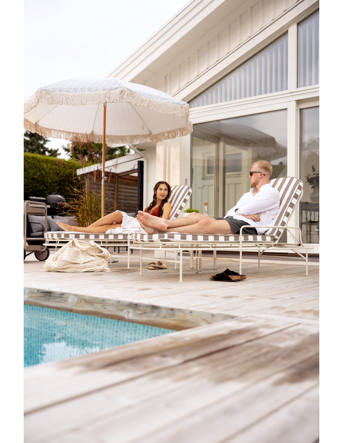 Evoca la Riviera francesa con Arts: una tumbona con mesa auxiliar a juego que combina elegancia y comodidad. Sus listones curvados de metal, la estructura decorativa de acero y los tejidos a rayas de colores aportan un estilo atemporal y un encanto relajado a cualquier espacio exterior.