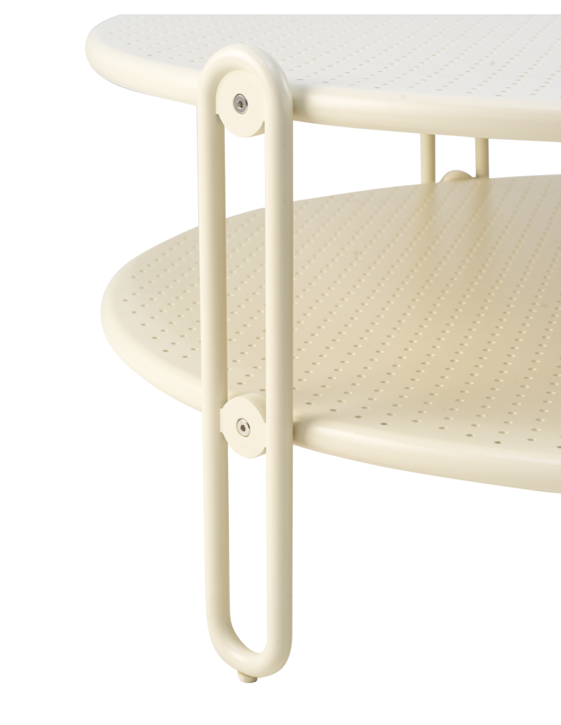 La mesa de centro redonda Blixt está disponible en dos alturas y tamaños: una más alta (42 cm) con un diámetro de 65 cm y otra más baja (39 cm) con un diámetro de 85 cm. Los dos discos redondos de metal, a diferentes niveles, están perforados: un detalle tan estiloso como práctico. Disponible en Negro, Gris Claro y Blanco Perla. Funciona sola o en pareja: las medidas se solapan gracias a la diferencia de altura.