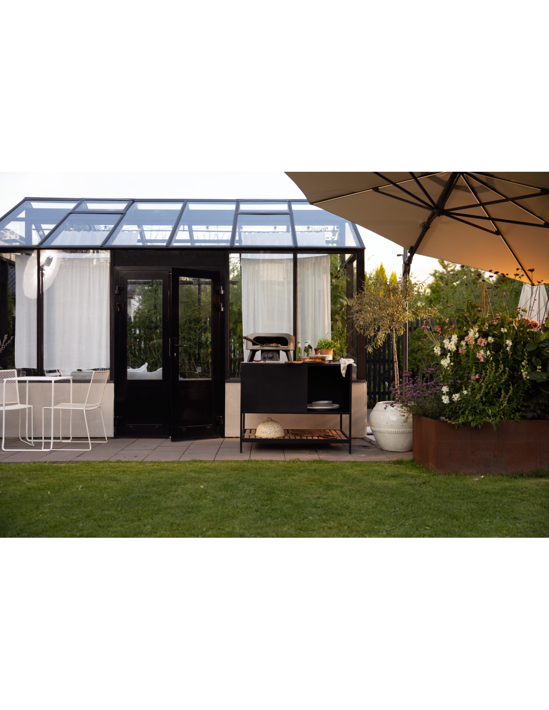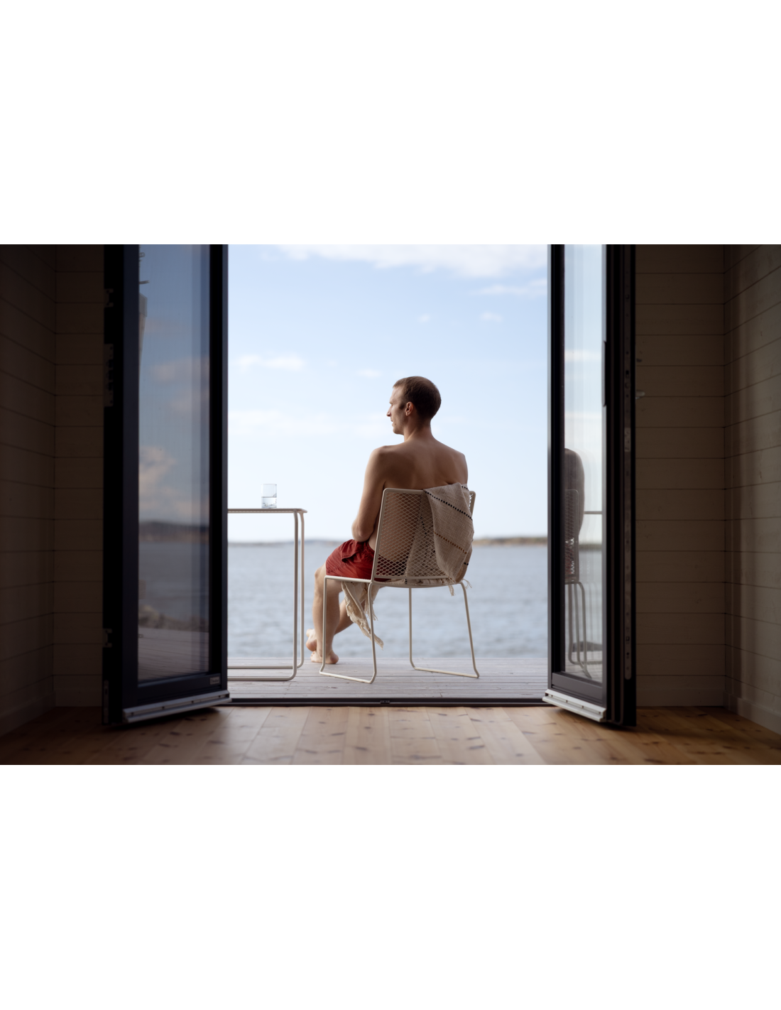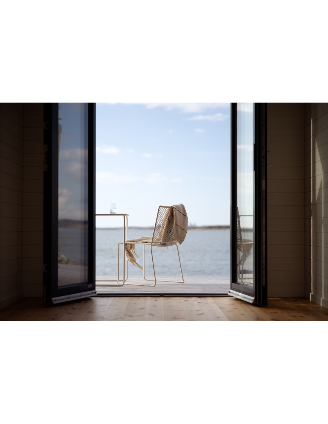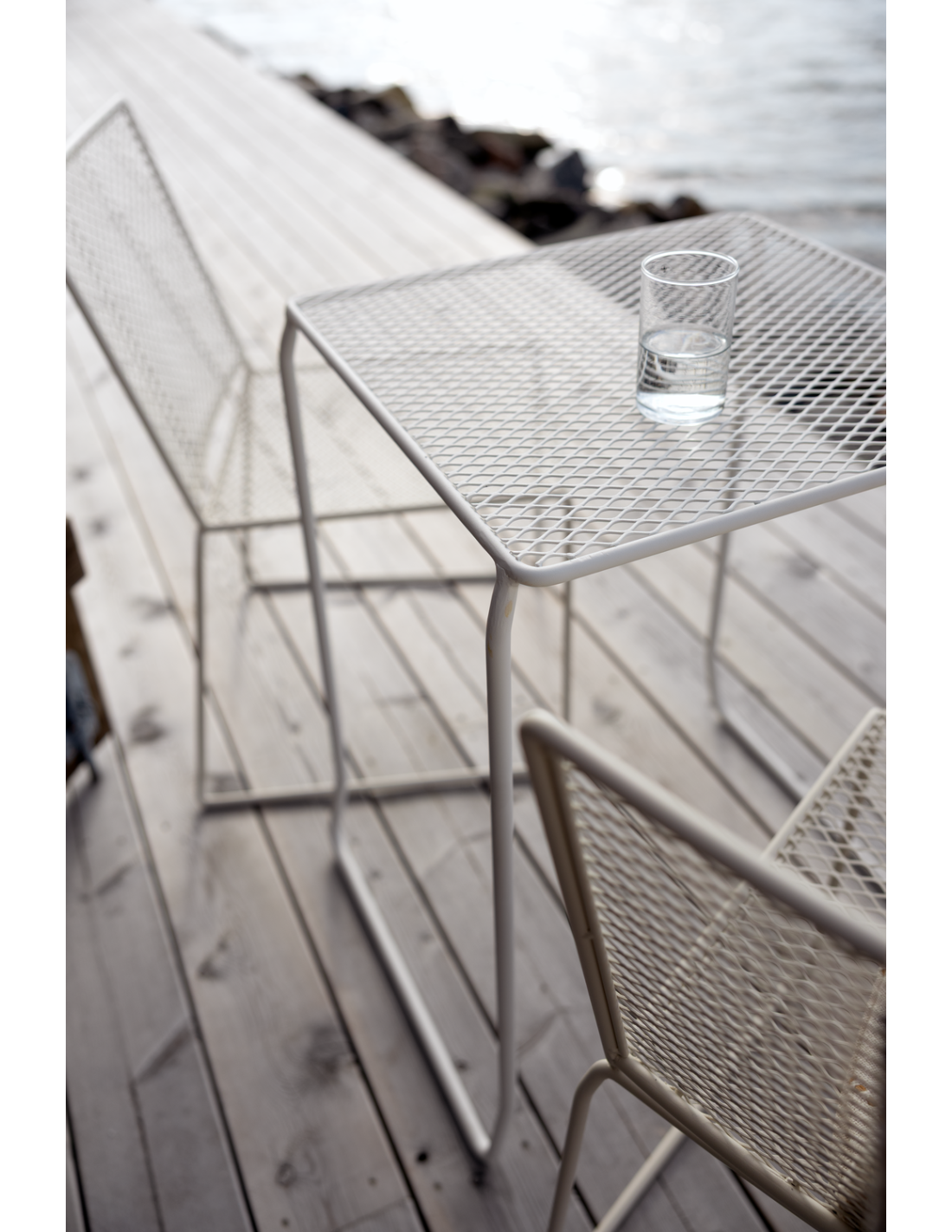 Mesa Bistró de la colección Haru. Diseñada con simplicidad escandinava y artesanía sueca, fabricada en Suecia en acero macizo. El nombre Haru significa primavera en japonés: un símbolo de luz, energía y un nuevo comienzo. El doble recubrimiento en polvo y el patrón gráfico de metal expandido hacen que el mobiliario sea tan duradero como elegante.