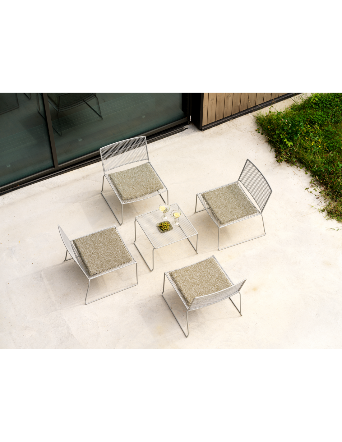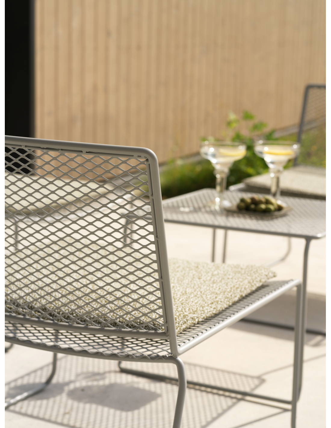 Mesa auxiliar de la colección Haru. Diseñada con simplicidad escandinava y artesanía sueca, fabricada en Suecia en acero macizo. El nombre Haru significa primavera en japonés: un símbolo de luz, energía y un nuevo comienzo. El doble recubrimiento en polvo y el patrón gráfico de metal expandido hacen que el mobiliario sea tan duradero como elegante.