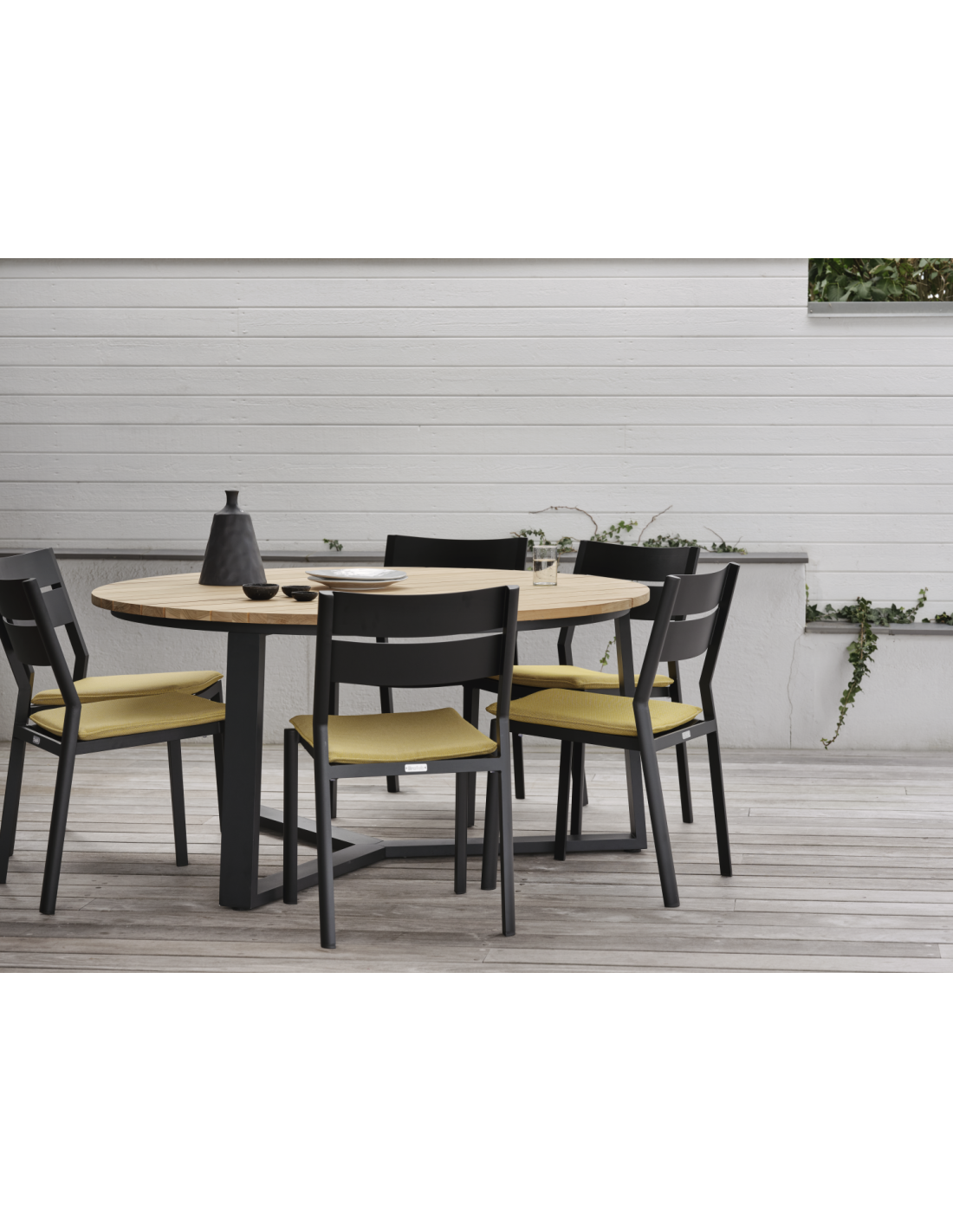 Serie Laurion: un precioso lenguaje de diseño moderno en la mesa y el banco de teca. Se caracteriza por un tablero con un diseño único y una artesanía experta. Versátil y generosa.
