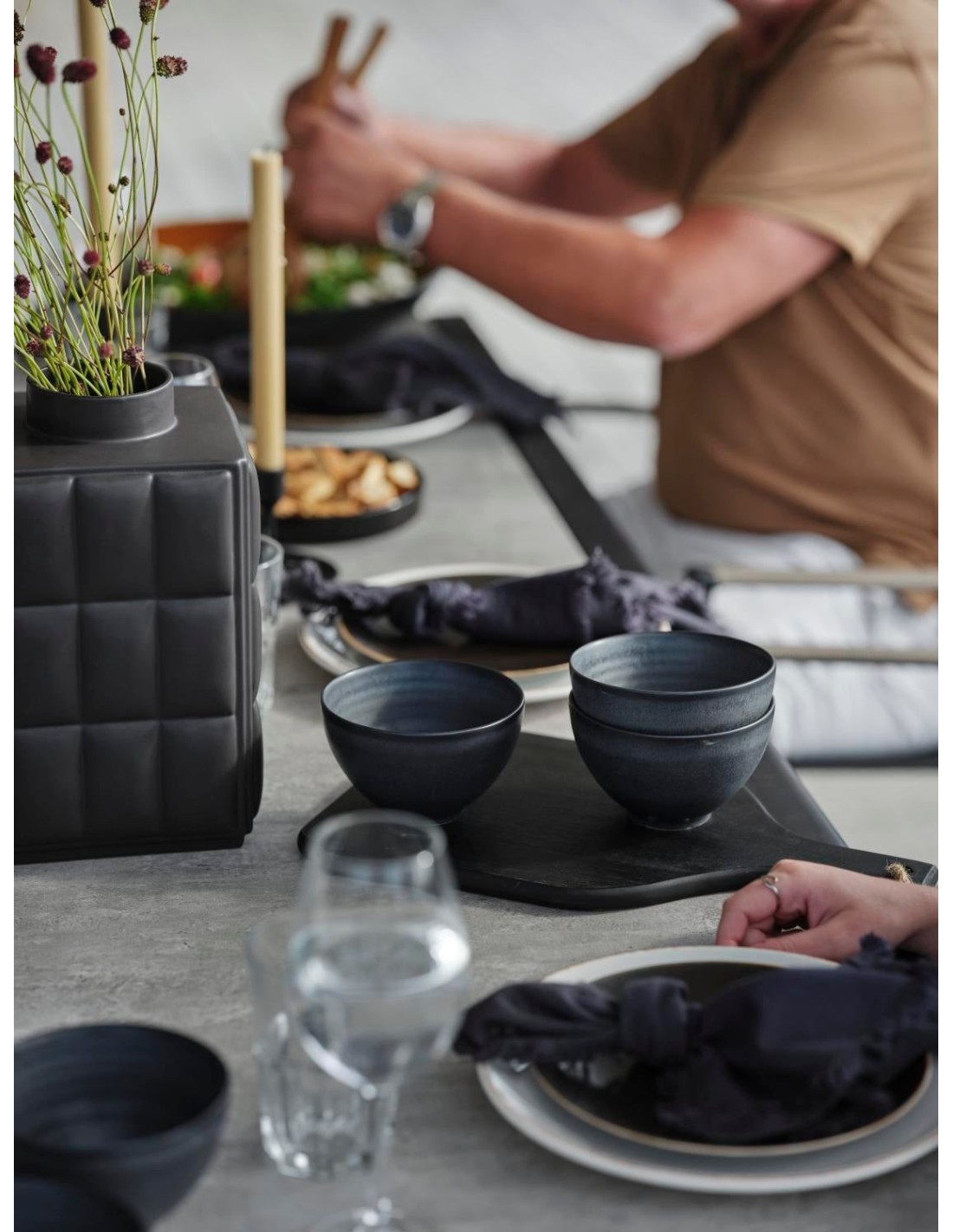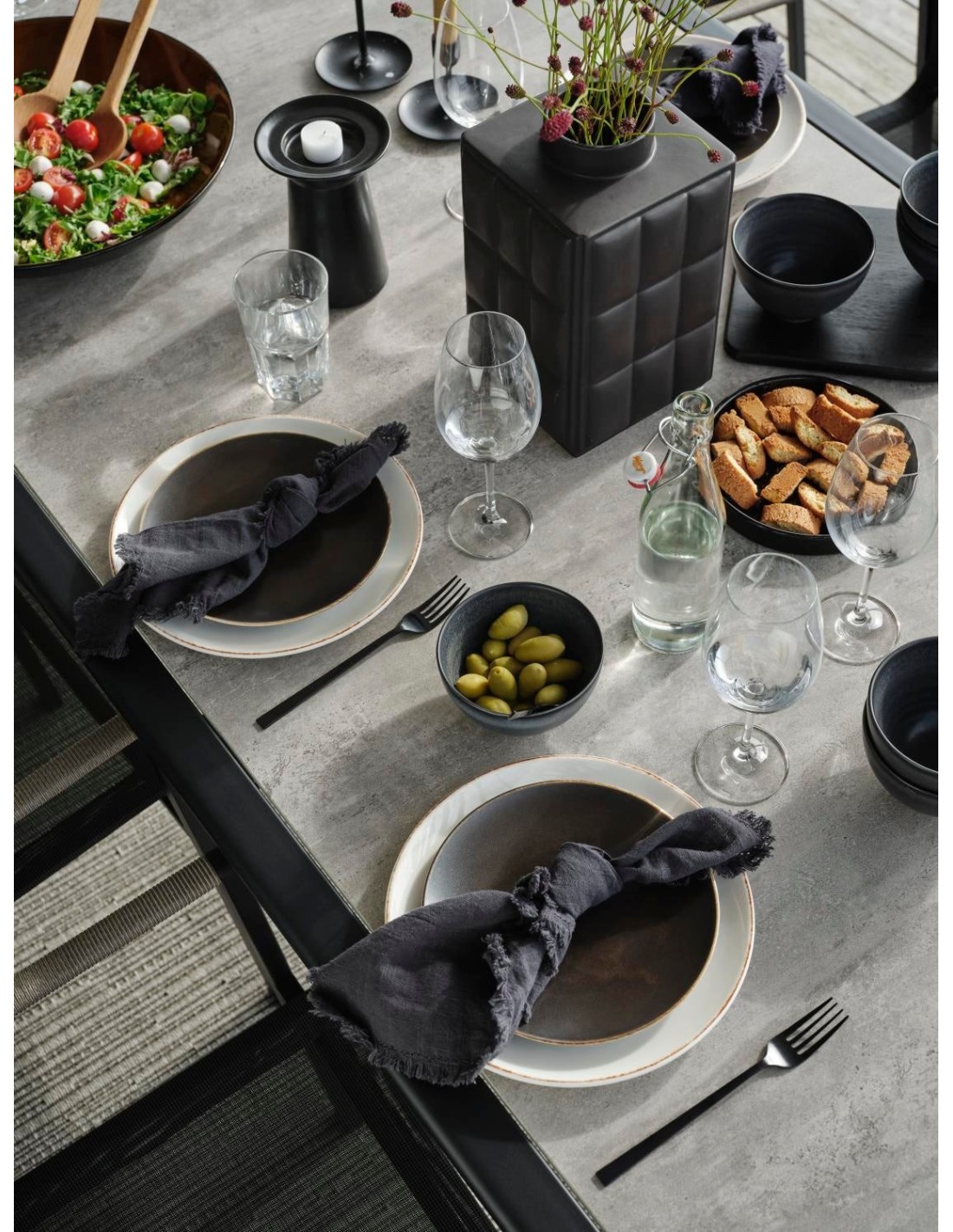 Una mesa de comedor grande y estilosa con cristal impreso en 3D y una textura agradable gracias al patrón de hormigón en color arena. Bonitos detalles, por ejemplo, que el tablero sobresale más allá de los bordes en los lados cortos. Lyra es una serie moderna y muy elegante con una deliciosa mezcla de materiales. La estructura es de acero inoxidable (304) con recubrimiento en polvo negro, perfecta para resistir distintas condiciones climáticas. Bonitos detalles de ratán artificial en los reposabrazos.