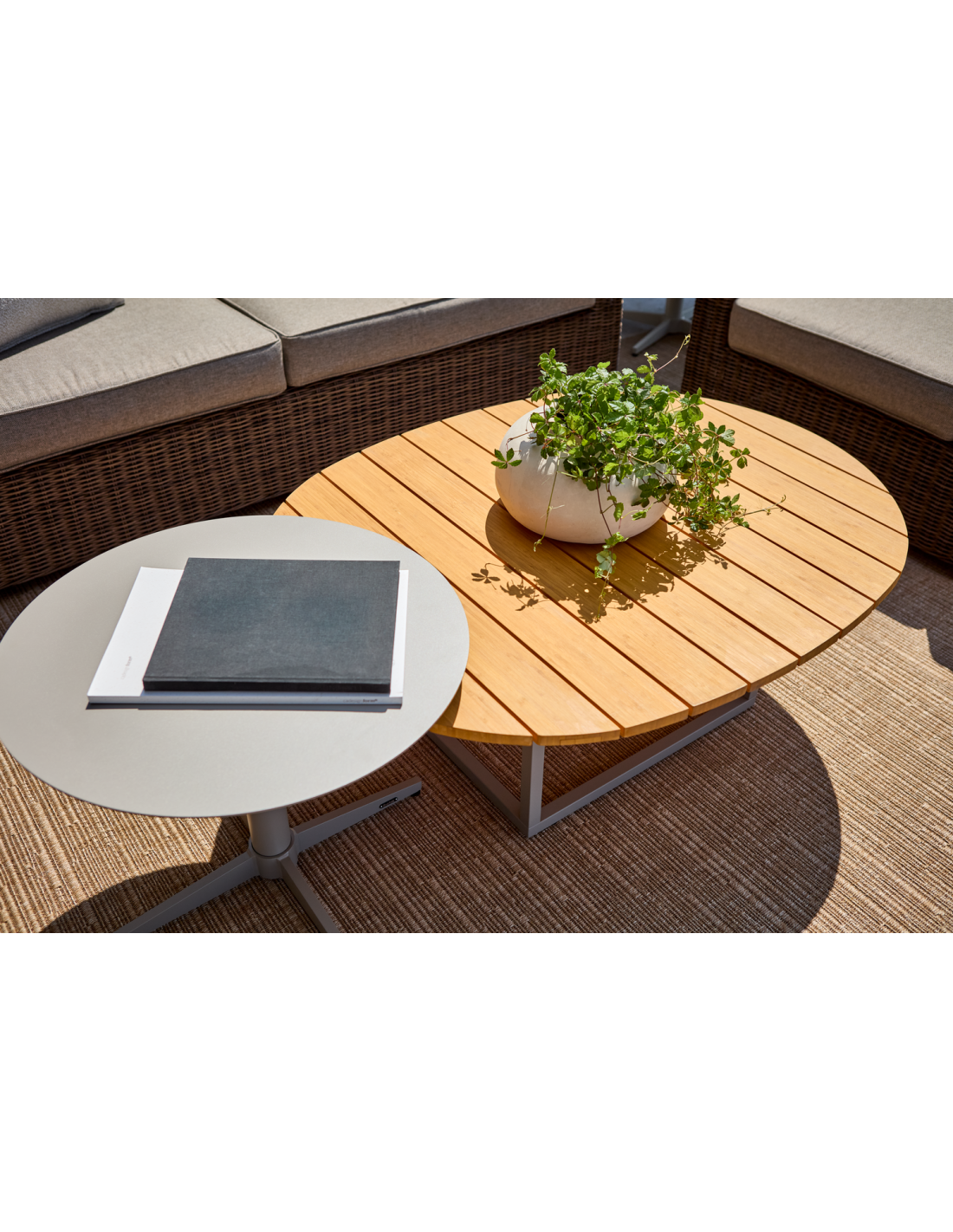 Mesa de centro Olive con tablero de madera de bambú. Forma natural. Presencia firme. Olive es una mesa alegre y elegante, llamada así por las aceitunas que inspiraron su forma. La estructura de aluminio y el tablero de bambú o de aluminio unen función y diseño. Las patas regulables aportan estabilidad en cualquier superficie. Olive encaja con la mayoría de conjuntos de sofá y también queda muy bien combinada con mesas de centro como Mill o Peace Lounge.