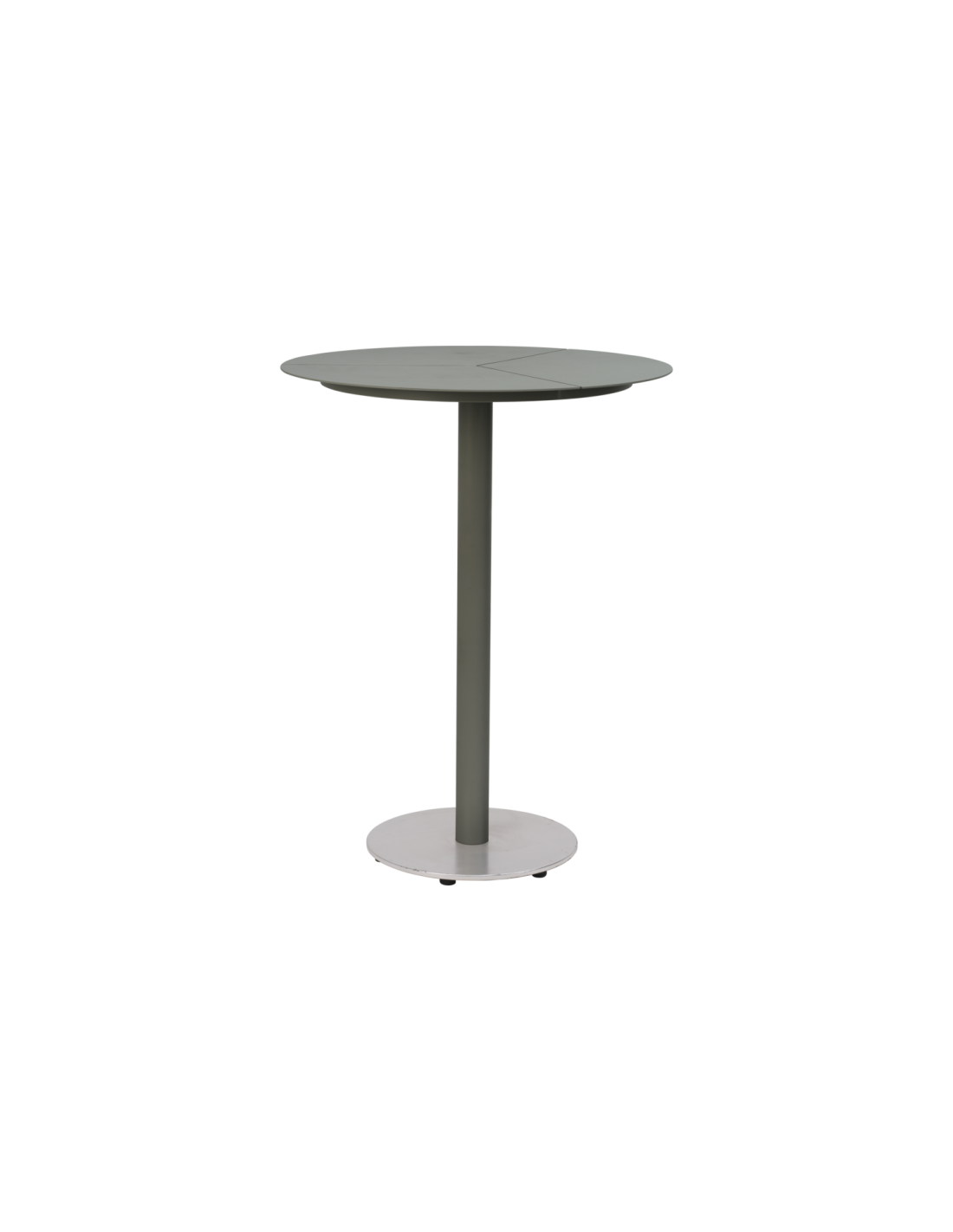 La mesa de bar Peace tiene estructura con recubrimiento en polvo y una placa base de aluminio anodizado cepillado que resiste marcas y desgaste. Con altura de pie y tablero redondo, es perfecta para encuentros informales o entornos públicos.