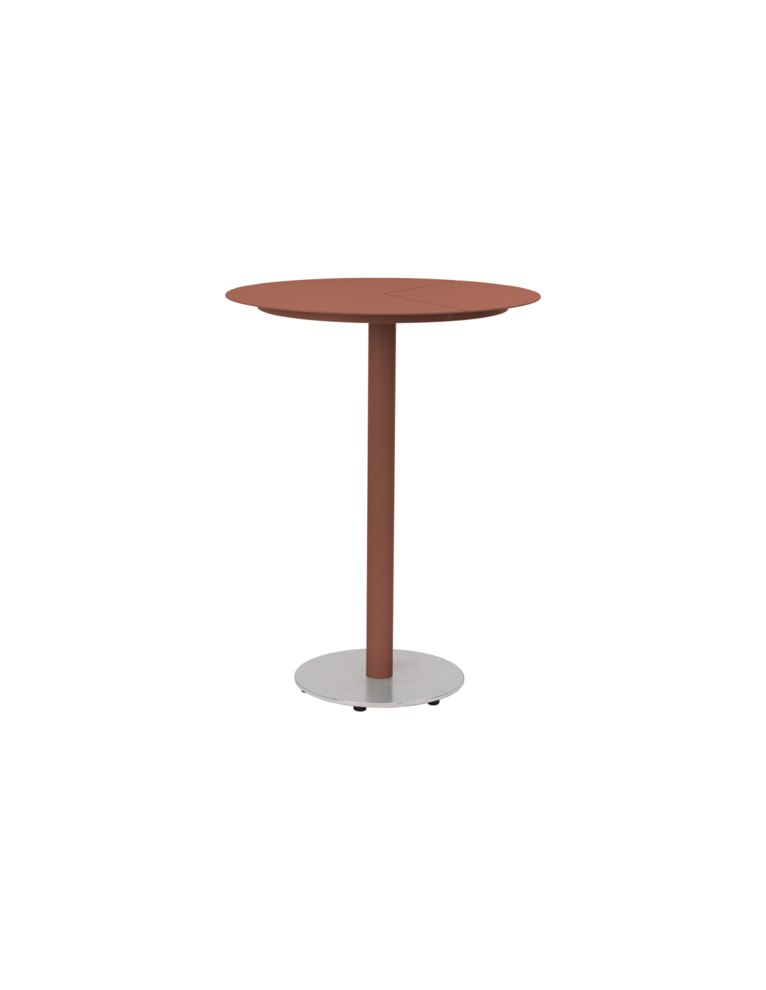 La mesa de bar Peace tiene estructura con recubrimiento en polvo y una placa base de aluminio anodizado cepillado que resiste marcas y desgaste. Con altura de pie y tablero redondo, es perfecta para encuentros informales o entornos públicos.