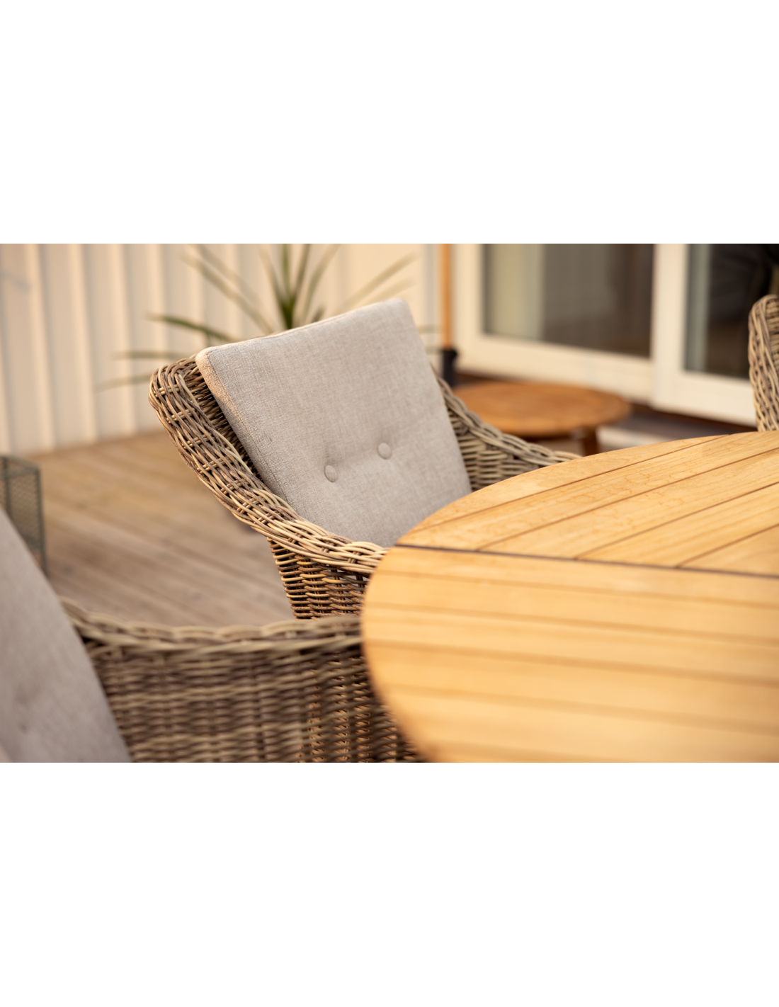 La mesa de comedor Peace Wood con tablero de teca aporta la misma elegancia suave que el resto de la colección. Con una base de aluminio y un elegante tablero en teca pura, la calidez natural se combina con líneas modernas y sobrias. Diseñada cuidadosamente para ofrecer comodidad y estabilidad, con una práctica superficie de servicio en el centro.