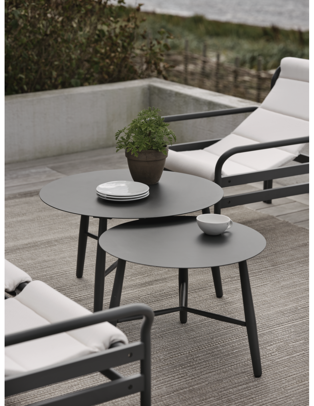 Las mesas de aluminio estilizadas y resistentes ofrecen una interpretación moderna del diseño tradicional. Las patas están elegantemente redondeadas y colocadas en cruz, perfectas para apoyar los pies. Puedes elegir entre tres tamaños y dos alturas, lo que facilita adaptarlas a las necesidades de tu hogar.
