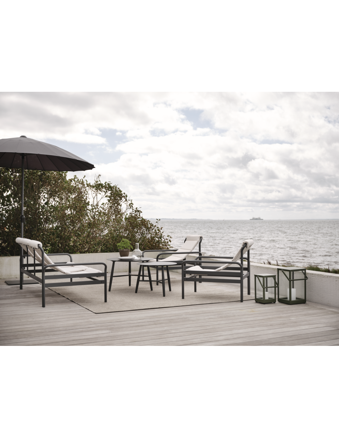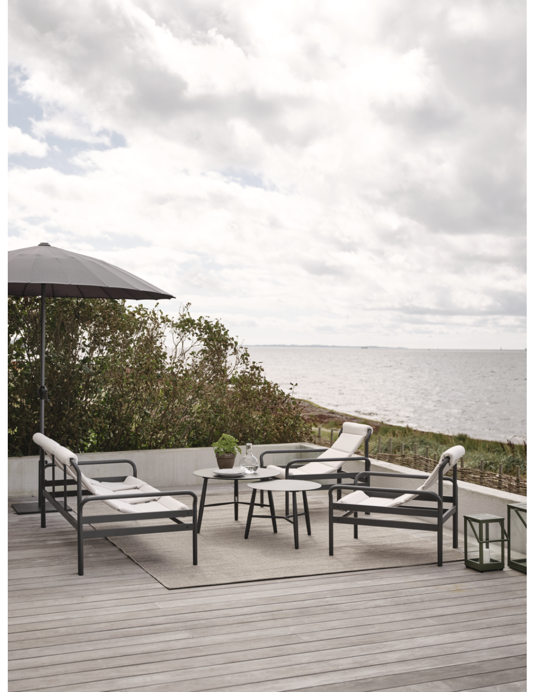 Las mesas de aluminio estilizadas y resistentes ofrecen una interpretación moderna del diseño tradicional. Las patas están elegantemente redondeadas y colocadas en cruz, perfectas para apoyar los pies. Puedes elegir entre tres tamaños y dos alturas, lo que facilita adaptarlas a las necesidades de tu hogar.