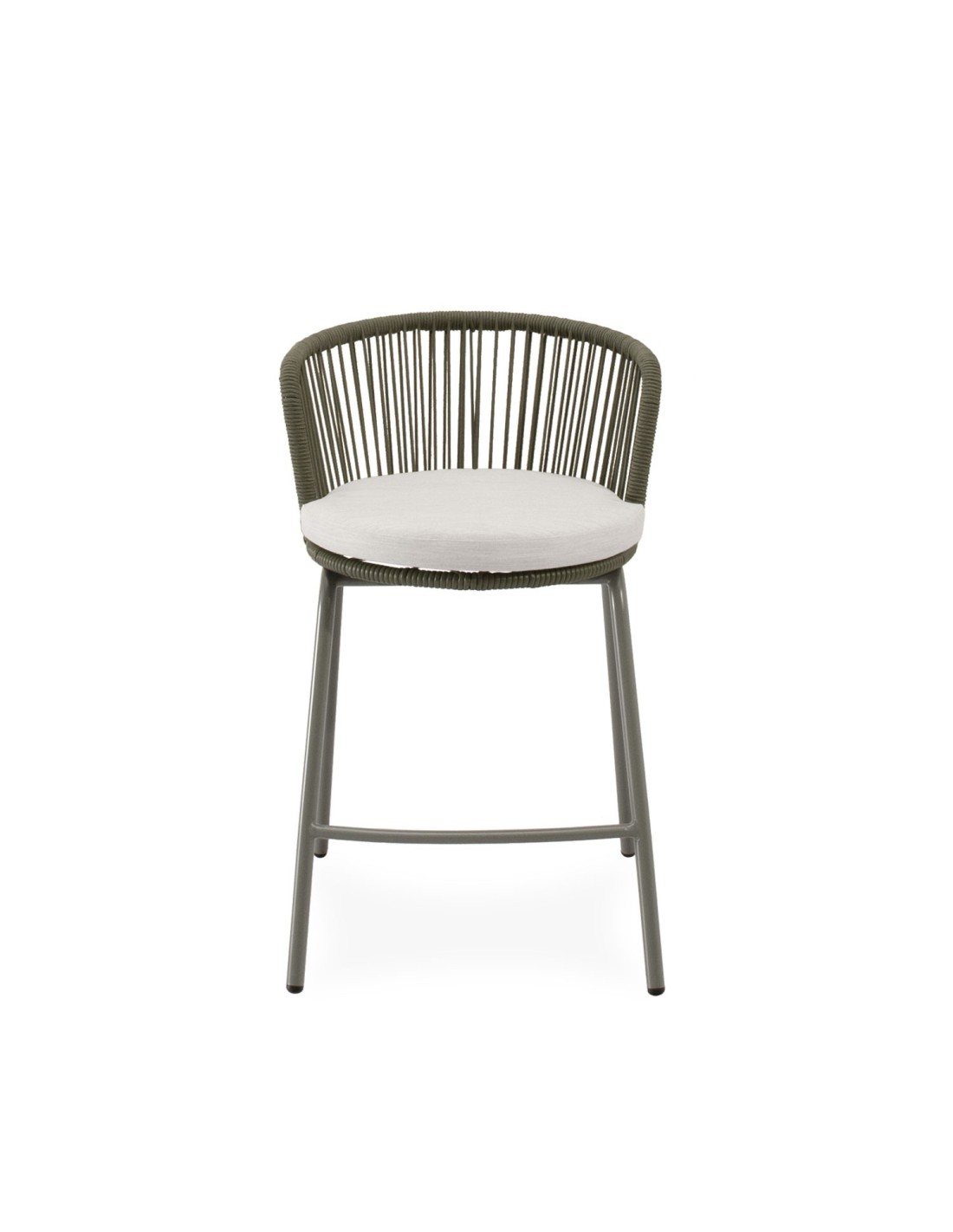 El taburete ASTRID combina un estilo contemporáneo con un diseño pensado para aportar comodidad y frescura a cualquier espacio exterior. Su respaldo curvo, elaborado en cuerda resistente, presenta un entramado lineal que crea un efecto visual ligero y dinámico. Esta estructura no solo envuelve suavemente la espalda, sino que también permite una ventilación natural, perfecta para los días más cálidos. Las patas de acero especialmente acondicionado para exteriores, añaden estabilidad y un toque moderno, mientras que el asiento acolchado en poliéster proporciona el confort necesario para largas tertulias al aire libre. ASTRID se integra fácilmente en terrazas, barras y jardines, convirtiéndose en una opción versátil y funcional.