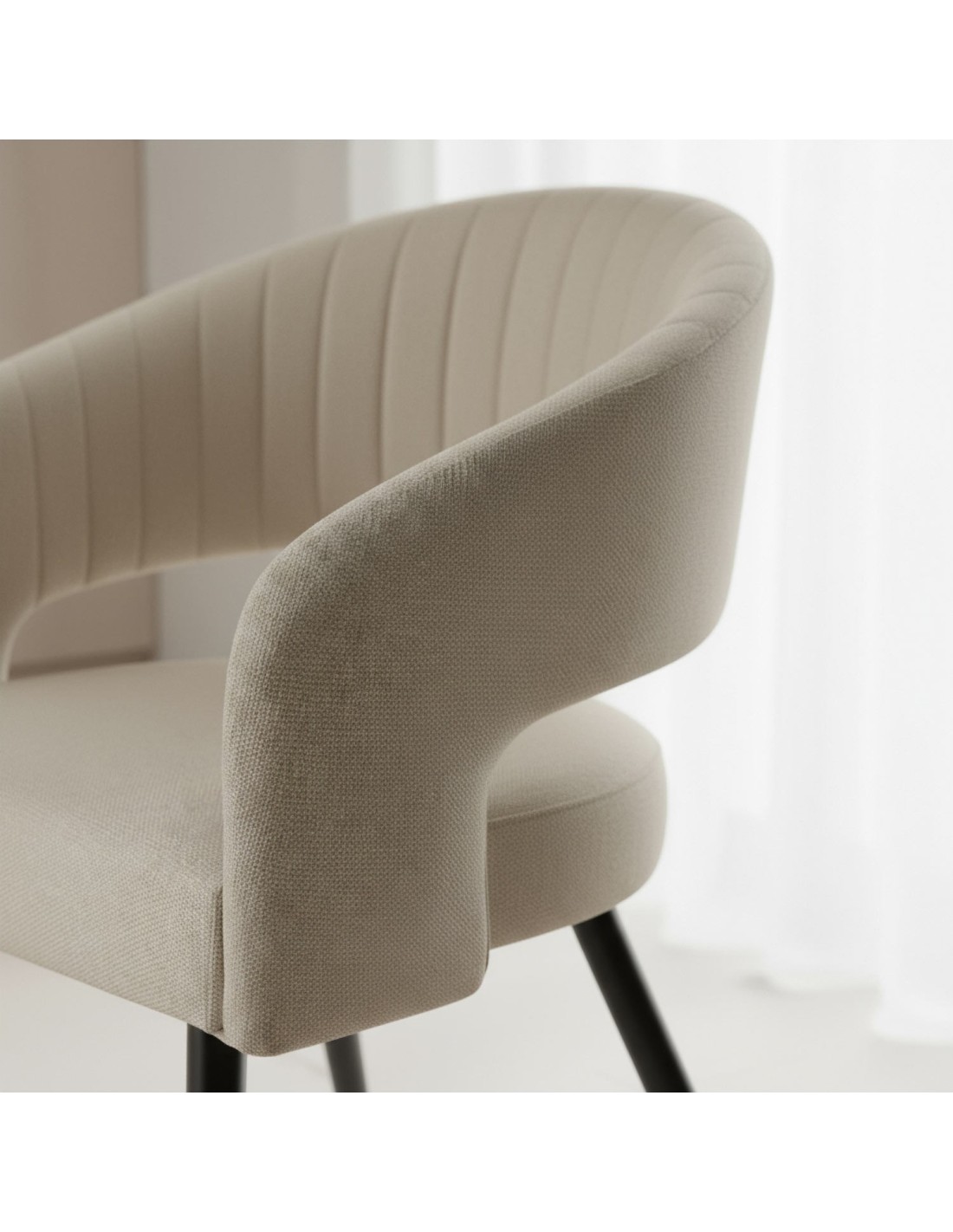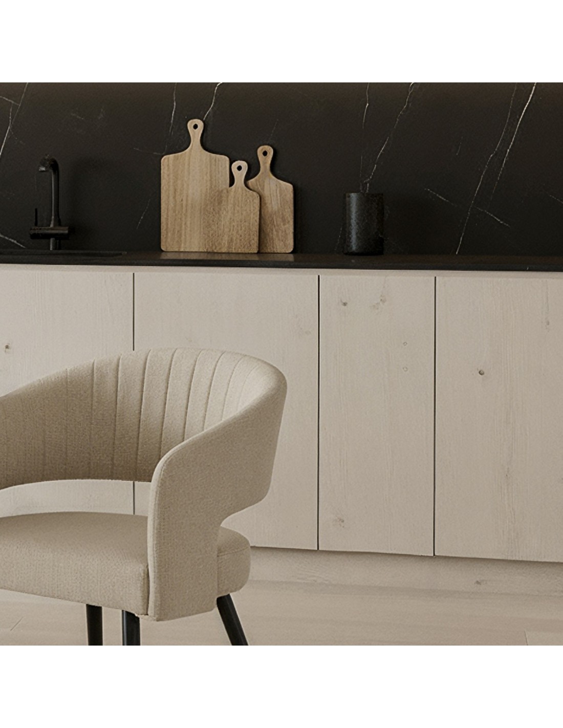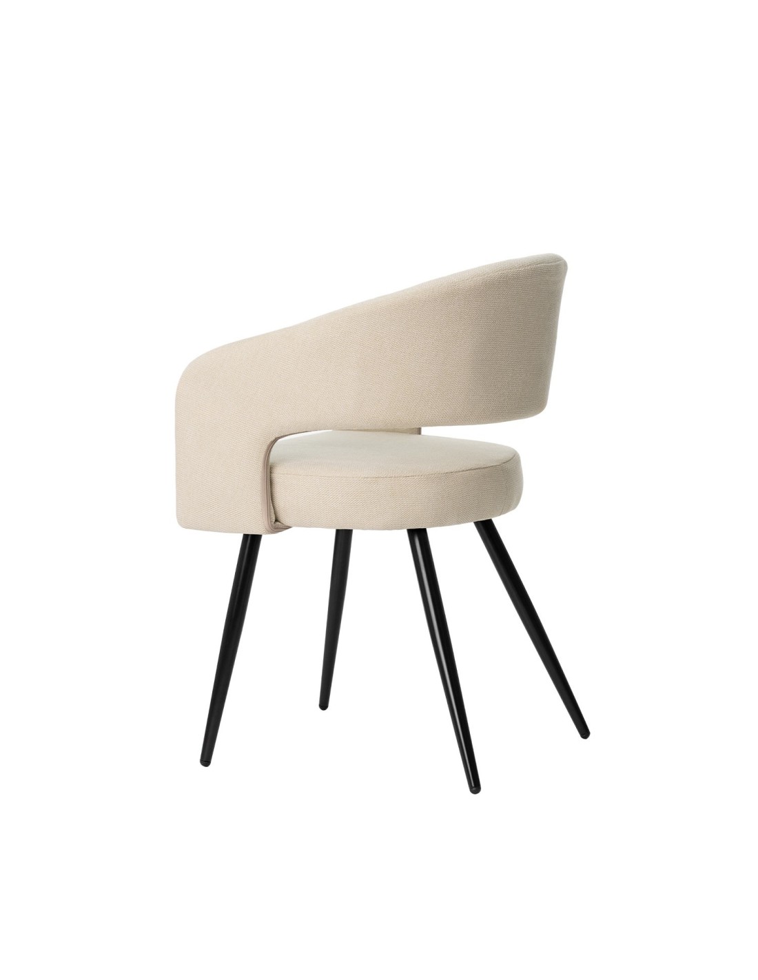 Añade un toque de elegancia contemporánea a tu estancia con la silla KRISTIN. Su respaldo curvado, adornado con costuras verticales, le proporciona un aspecto sofisticado. El diseño chic se destaca con un elegante agujero en la parte trasera, aportando personalidad y mejorando su estética general. El tejido en color beige ofrece un tono neutro que se integra fácilmente en cualquier decoración interior.