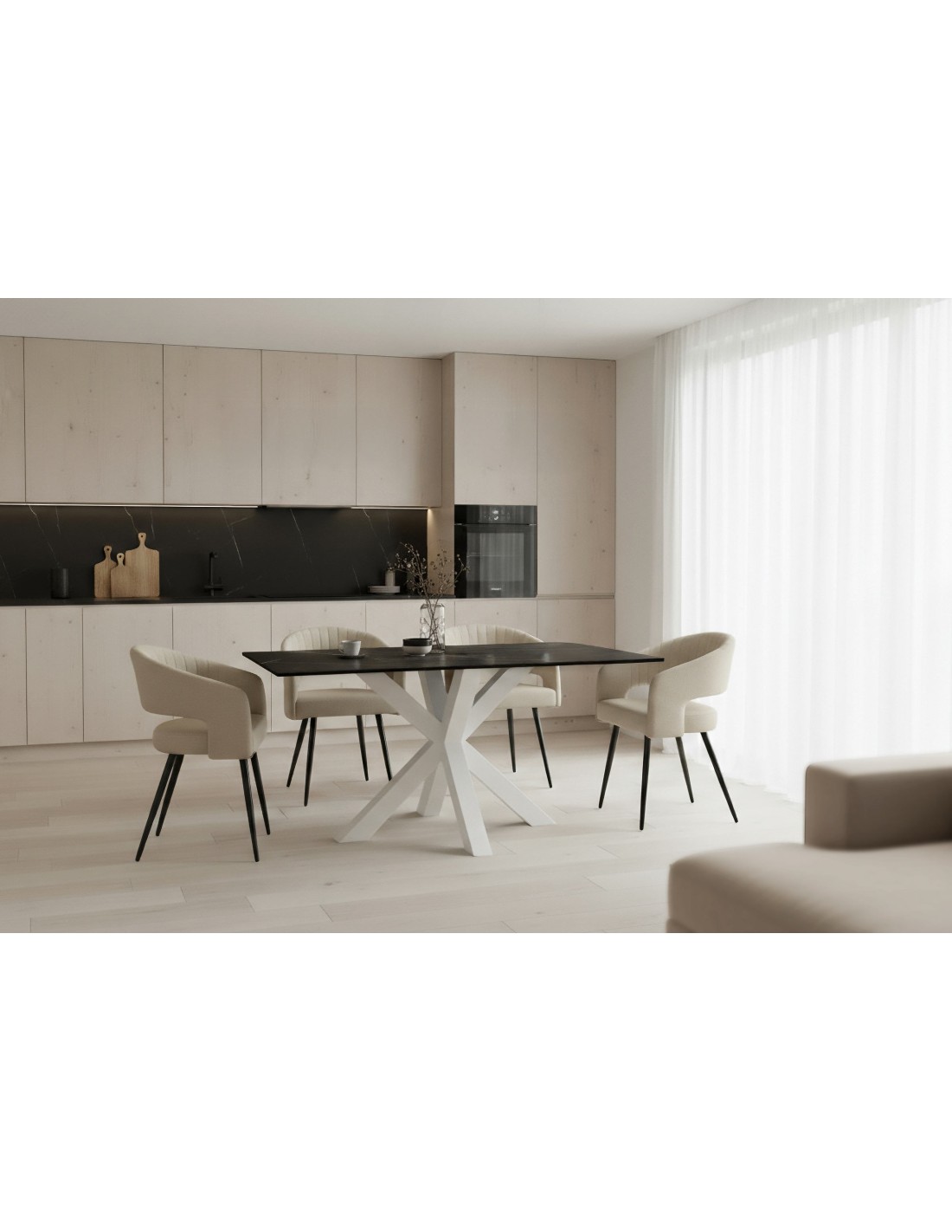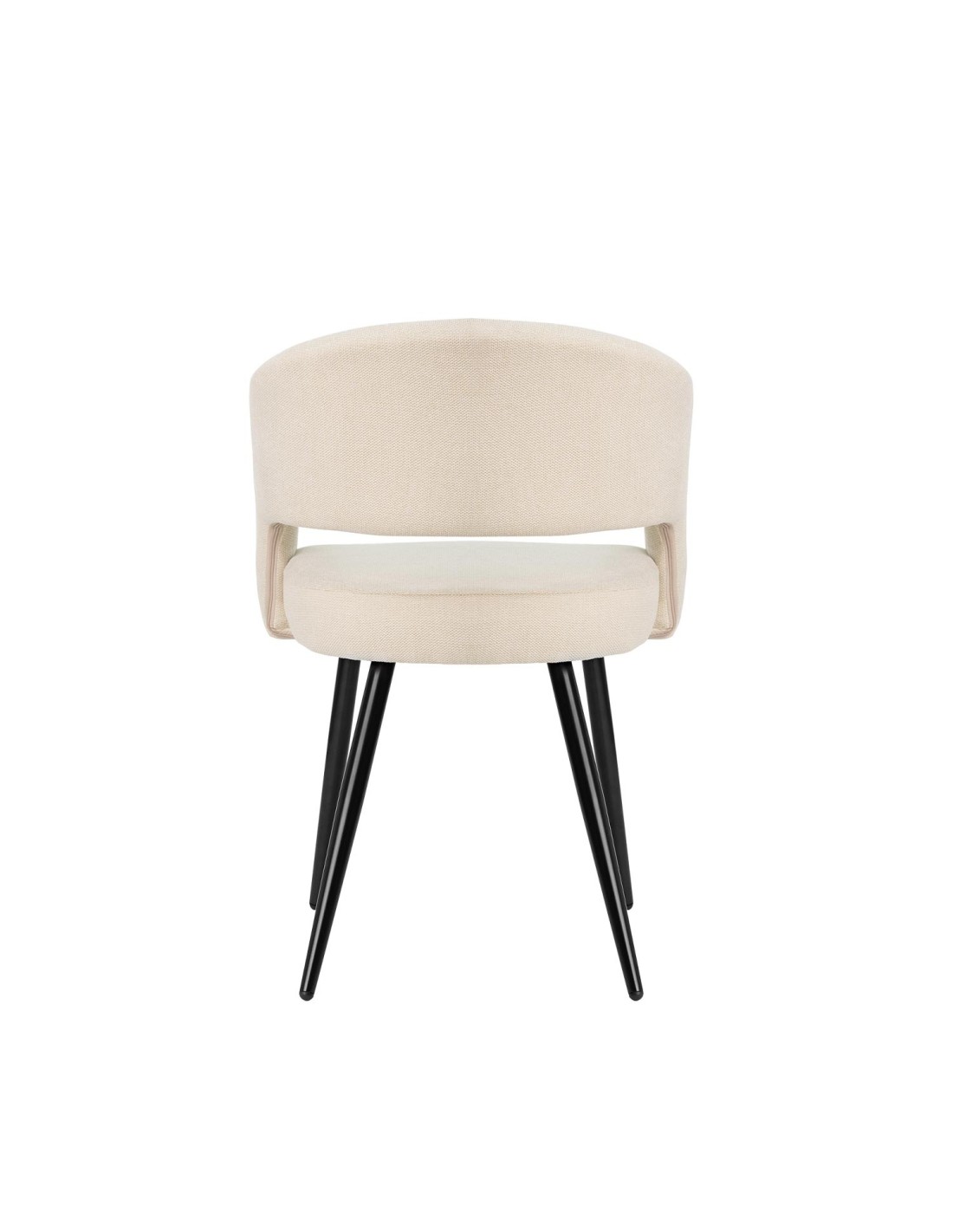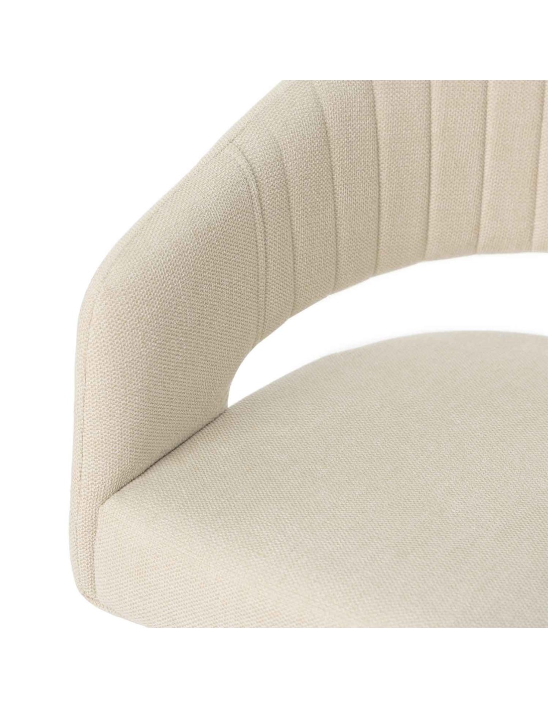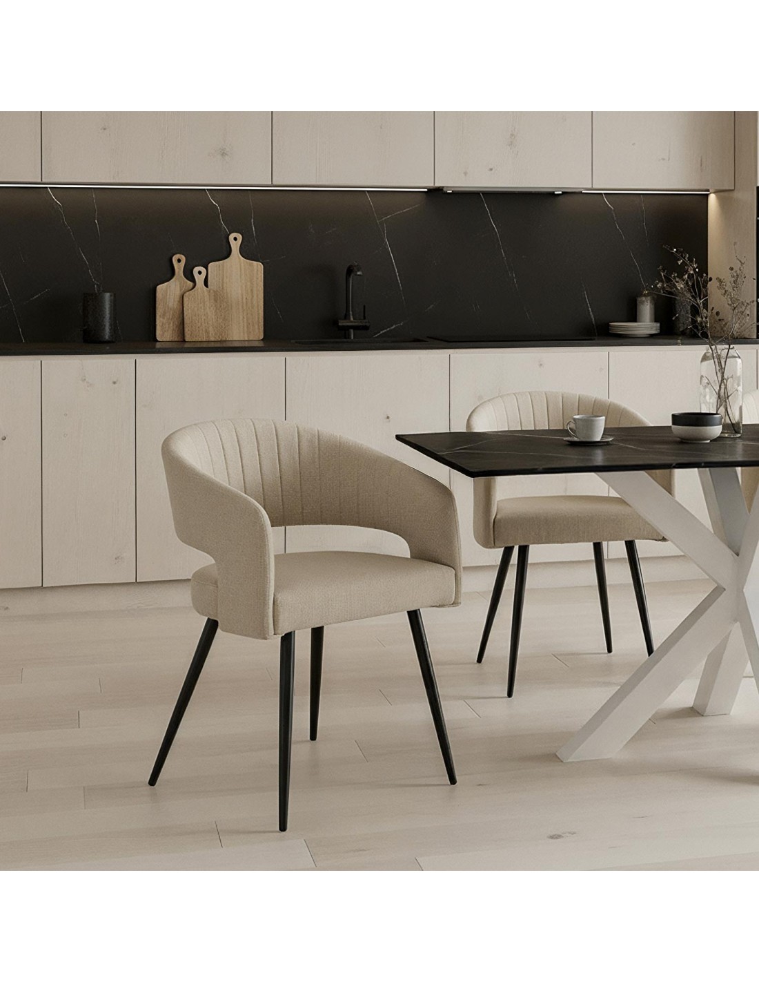 Añade un toque de elegancia contemporánea a tu estancia con la silla KRISTIN. Su respaldo curvado, adornado con costuras verticales, le proporciona un aspecto sofisticado. El diseño chic se destaca con un elegante agujero en la parte trasera, aportando personalidad y mejorando su estética general. El tejido en color beige ofrece un tono neutro que se integra fácilmente en cualquier decoración interior.