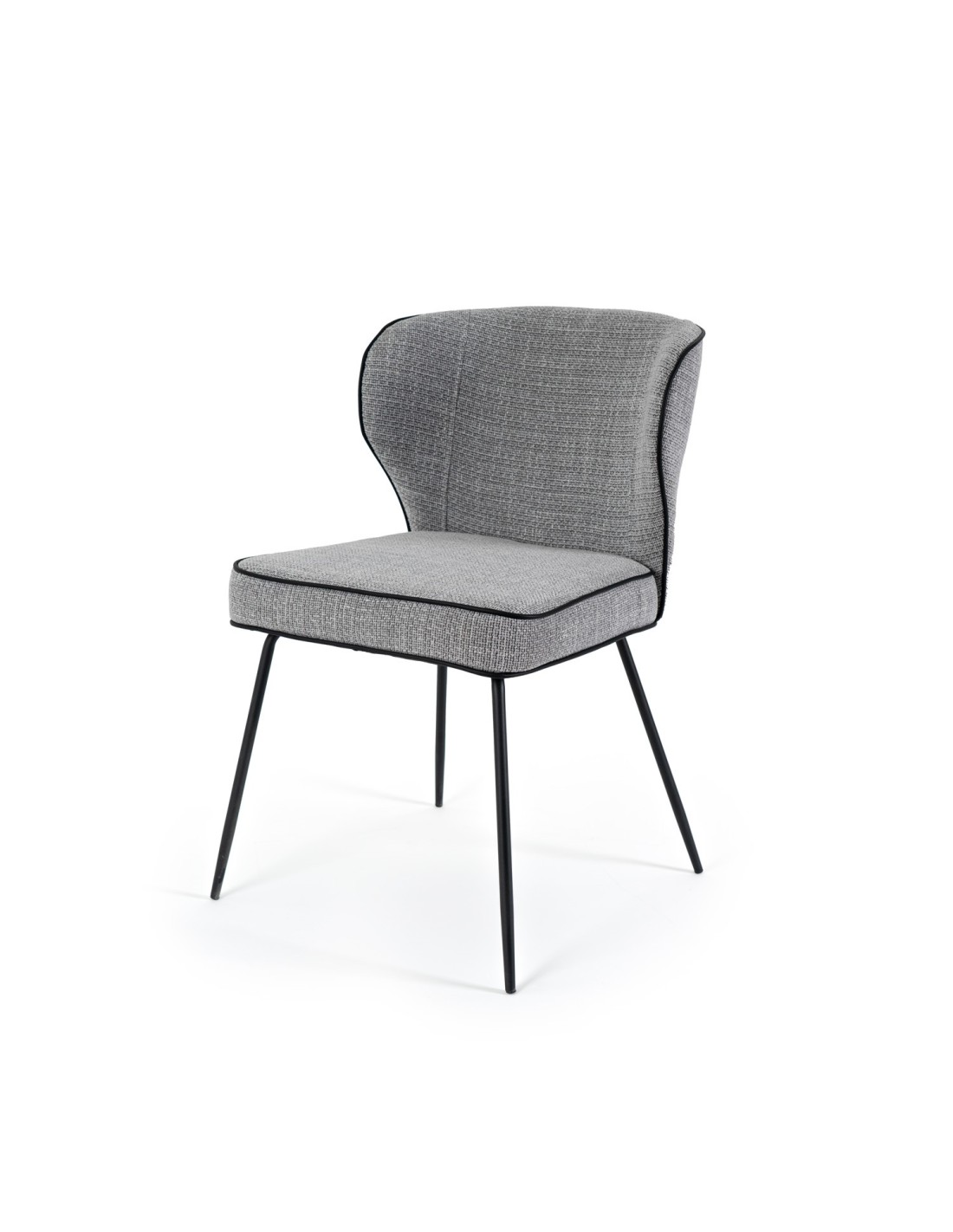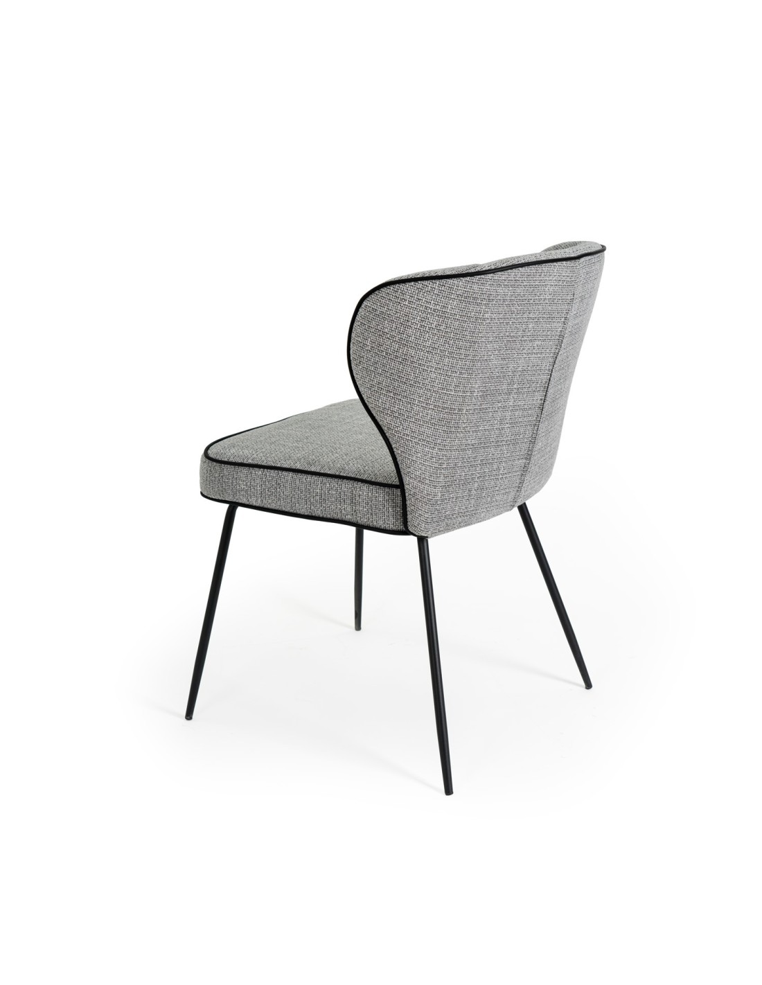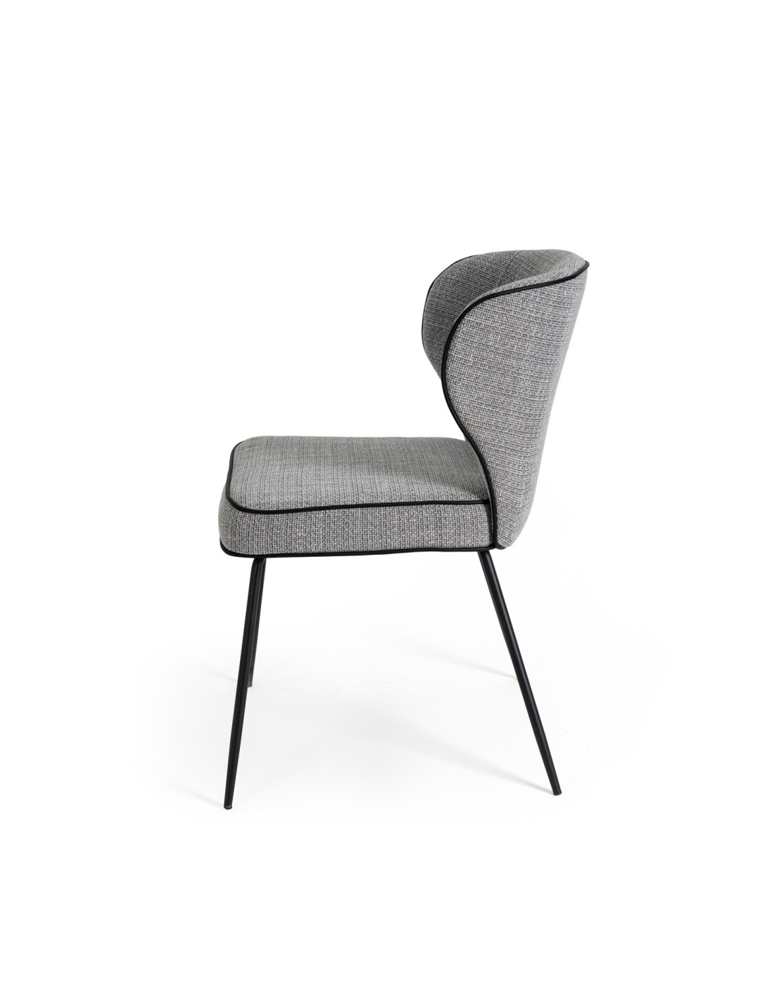 La silla MAYA tiene un diseño moderno muy atractivo para diversos entornos interiores. Su respaldo curvado y asiento acolchado, tapizado en color gris claro, ofrece comodidad y durabilidad. Las patas metálicas negras y la costura que marca la forma de la silla, le da un toque contemporáneo.
