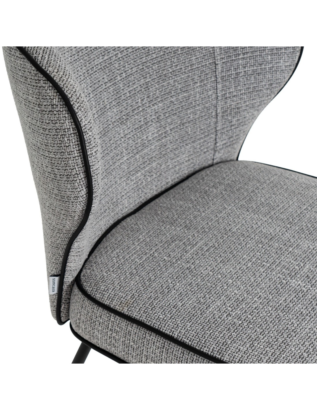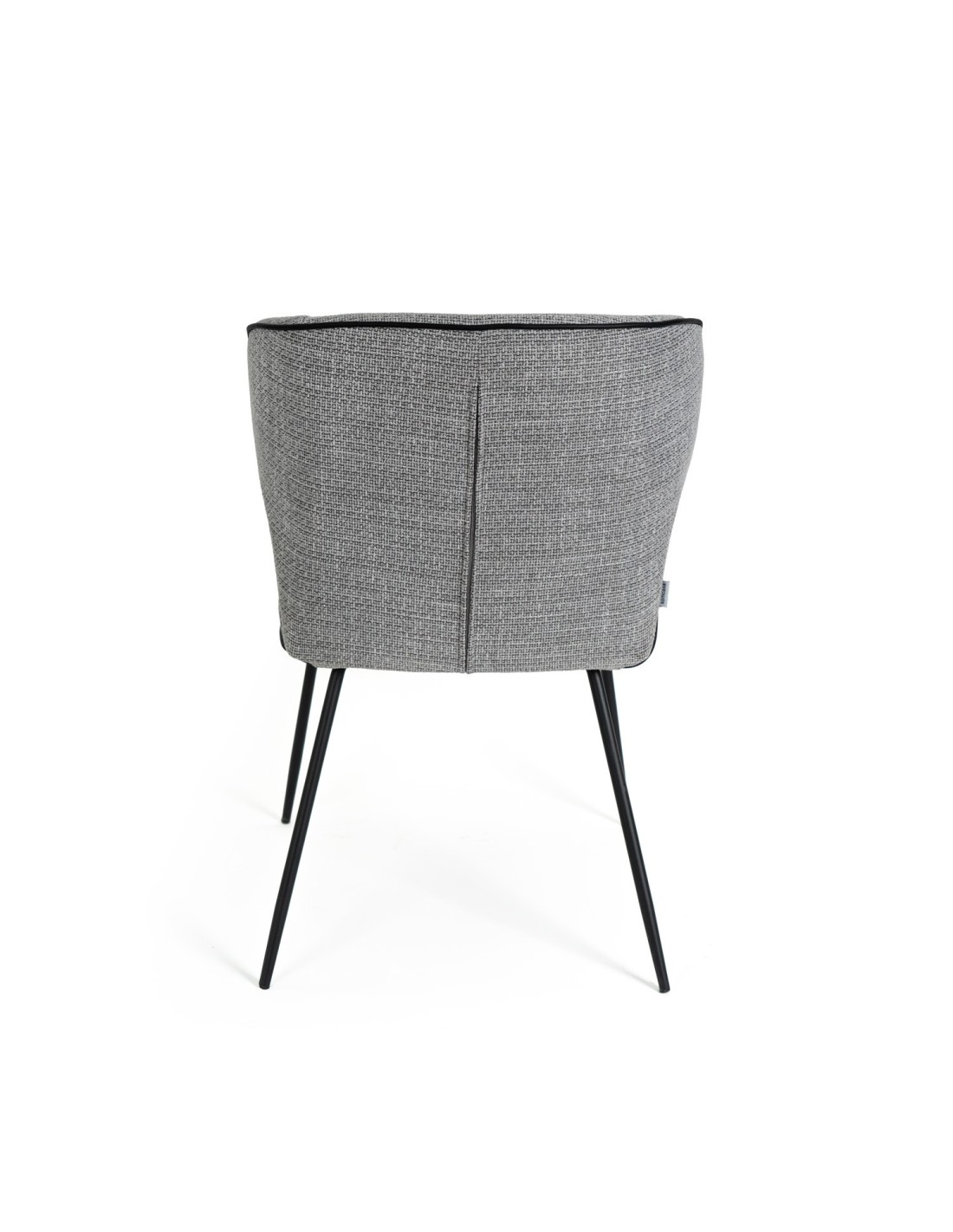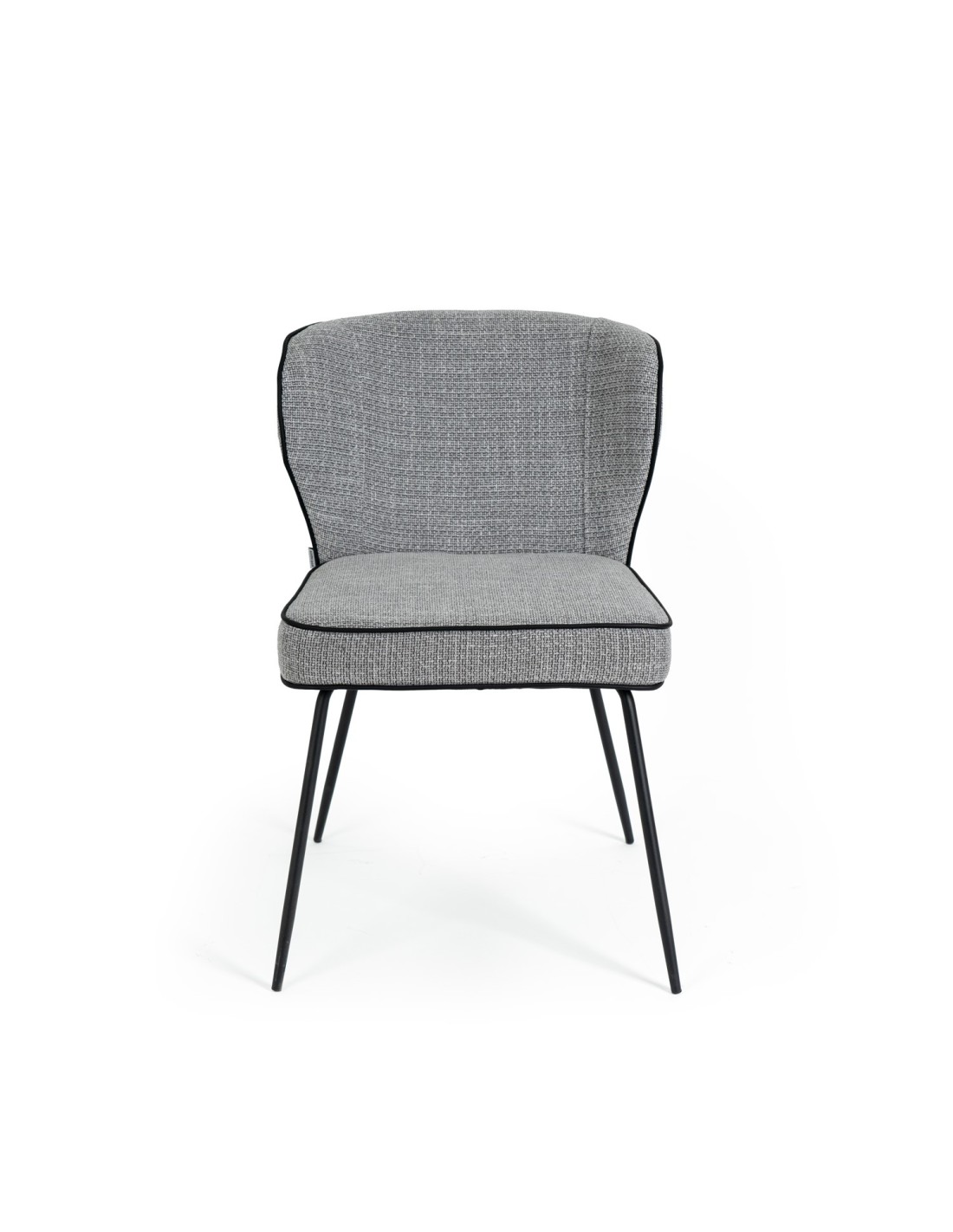 La silla MAYA tiene un diseño moderno muy atractivo para diversos entornos interiores. Su respaldo curvado y asiento acolchado, tapizado en color gris claro, ofrece comodidad y durabilidad. Las patas metálicas negras y la costura que marca la forma de la silla, le da un toque contemporáneo.